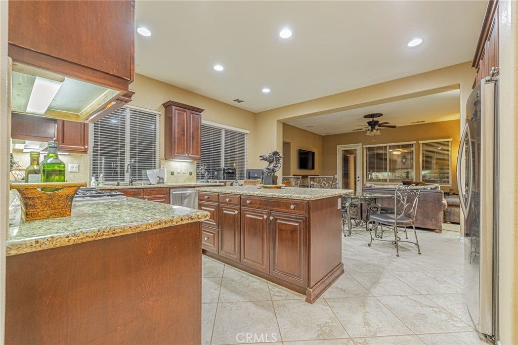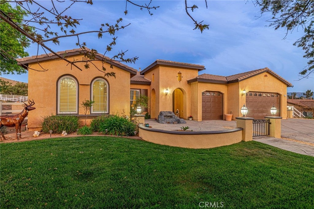 Welcome to your private Acton retreat, where comfort, elegance, and outdoor living come together on a beautifully maintained property with breathtaking mountain views. This spacious single-story home offers exceptional curb appeal with its warm stucco exterior, tile roof, and inviting gated courtyard entry complete with a tranquil water feature. Step inside to a grand formal entry featuring soaring ceilings, a custom tile medallion, and an elegant chandelier that sets the tone for the home. The thoughtfully designed floor plan includes a formal dining room, perfect for entertaining, and an expansive living area with a cozy fireplace and abundant natural light. The chef’s kitchen is the heart of the home, showcasing rich wood cabinetry, granite countertops, stainless steel appliances, a large center island with bar seating, and a sunny breakfast nook that opens to the family room—ideal for everyday living and gatherings. The spacious primary suite offers a relaxing retreat with a generously sized walk-in closet, spa-like bathroom featuring dual vanities, a soaking tub, a separate shower. Additional bedrooms are well-sized and versatile for guests, office space, or hobbies. Step outside to your own private resort. The incredible backyard is designed for entertaining and relaxation, featuring a sparkling pool and spa with water features, expansive stamped concrete decking, two built-in fire pits, and a fully equipped outdoor kitchen with a pizza oven and bar seating. A covered patio provides the perfect space for outdoor dining while enjoying the peaceful surroundings and scenic views. The property also includes ample usable land, a sport court, and a storage shed—offering endless possibilities for recreation, animals, or additional customization. Located in the desirable Acton community, this home combines rural charm with modern amenities and easy access to nearby conveniences. A rare opportunity to own a true entertainer’s dream property—don’t miss it!