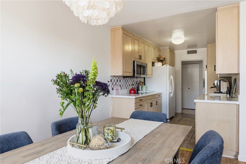 PRICE REDUCED. Located on the top floor of a well-maintained 3 story, this spacious 1,415 sf, 2-bedroom, 2-bath corner unit condo offers an ideal blend of comfort, light, and location. Built in 1969, the residence features a thoughtfully designed floor plan with generous living spaces and storage and abundant natural light throughout. The bright and airy living area opens to a standing balcony—perfect for plants and inviting the sunlight and fresh air in. There is room for a gas barbecue for year round grilling. Top floor and corner unit mean no neighbors above and only 1 shared wall, providing a quiet living sanctuary and remote working environment. The unit includes two covered parking spaces, a valuable convenience in this sought-after neighborhood. Residents enjoy access to resort-style amenities including a deep swimming pool, hot tub, and inviting outdoor entertaining area featuring new dining and lounge furniture. The building’s common areas and landscaping are clean, well-lit, and tastefully updated, reflecting pride of ownership throughout the community. Located in one of the most coveted pockets of Sherman Oaks south of Ventura Boulevard, the property offers exceptional accessibility, steps from the front lobby are home to some of Sherman Oaks’ most desirable family friendly streets. Head to nearby grocery stores such as Whole Foods Market and Ralphs, along with a wide array of shops, coffee houses, restaurants, and everyday conveniences just moments from your door. This top-floor condo presents a rare opportunity to enjoy spacious living in a prime Sherman Oaks location with outstanding amenities and neighborhood accessibility.