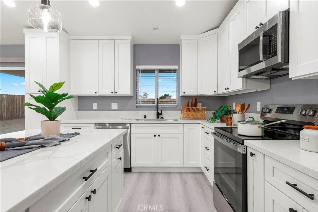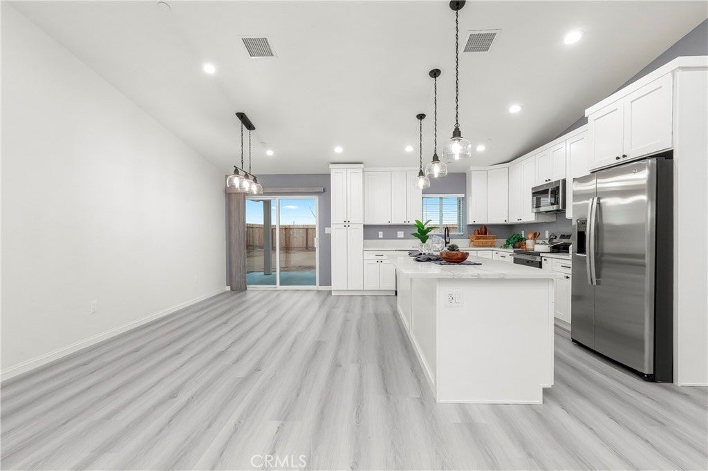 BEAUTIFUL BRAND NEW CONSTRUCTION!!!! Gorgeous 3 + 2, 1629 sq ft Single Family Home. This home has all the high-quality features that come with a modern semi-custom home. The standards that come with this home start with but not limited to a spacious, light and bright open floor plan, on-demand water heater, luxury vinyl plank flooring, dual pane argon gas filled windows, Quartz countertops, finger pull cabinets, quality appliances, ceiling fans and upgraded fixtures throughout, smart WI-FI thermostat, indoor laundry room, insulated garage, large fully fenced backyard, covered patio, front yard finished with beautiful hardscape, RV potential, exterior stucco and so much more. With all the modern conveniences of central heating & air, solar, and fire sprinklers, this house has it all!