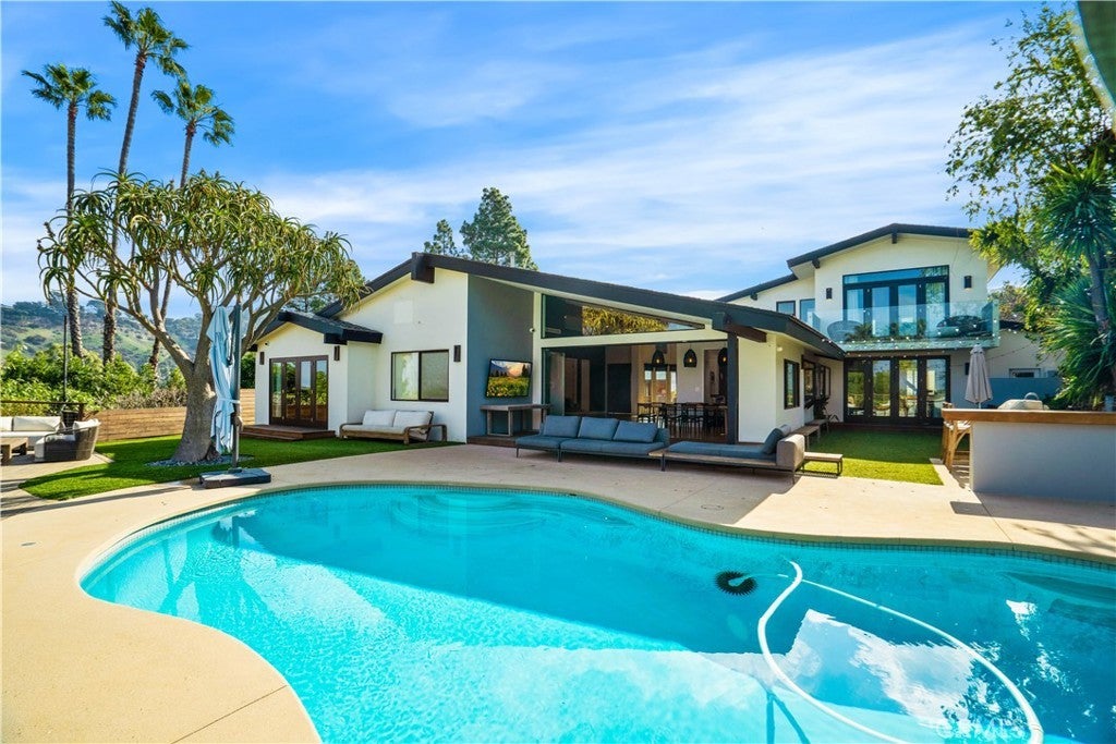 Spectacular single-story view home with a resort-style pool and a lush, grassy yard, an entertainer’s dream. Step inside to elegant stonework, bamboo floors, and a fabulous open-concept layout. The contemporary living room offers sweeping views and a cozy fireplace, flowing seamlessly into the formal dining area and a den/TV room. The designer kitchen features top-tier stainless steel appliances, a breakfast area, built-in desk, skylights, and abundant storage. The spacious primary suite opens directly to the yard and stunning vistas, complete with a spa-like bath featuring a soaking tub and serene finishes. Outside, enjoy a true resort atmosphere: a sparkling pool and hot tub framed by lawn on one side and an expansive viewing deck on the other, plus a built-in BBQ and outdoor living room. Exceptionally private and impeccably maintained, this is the one you want to lease.