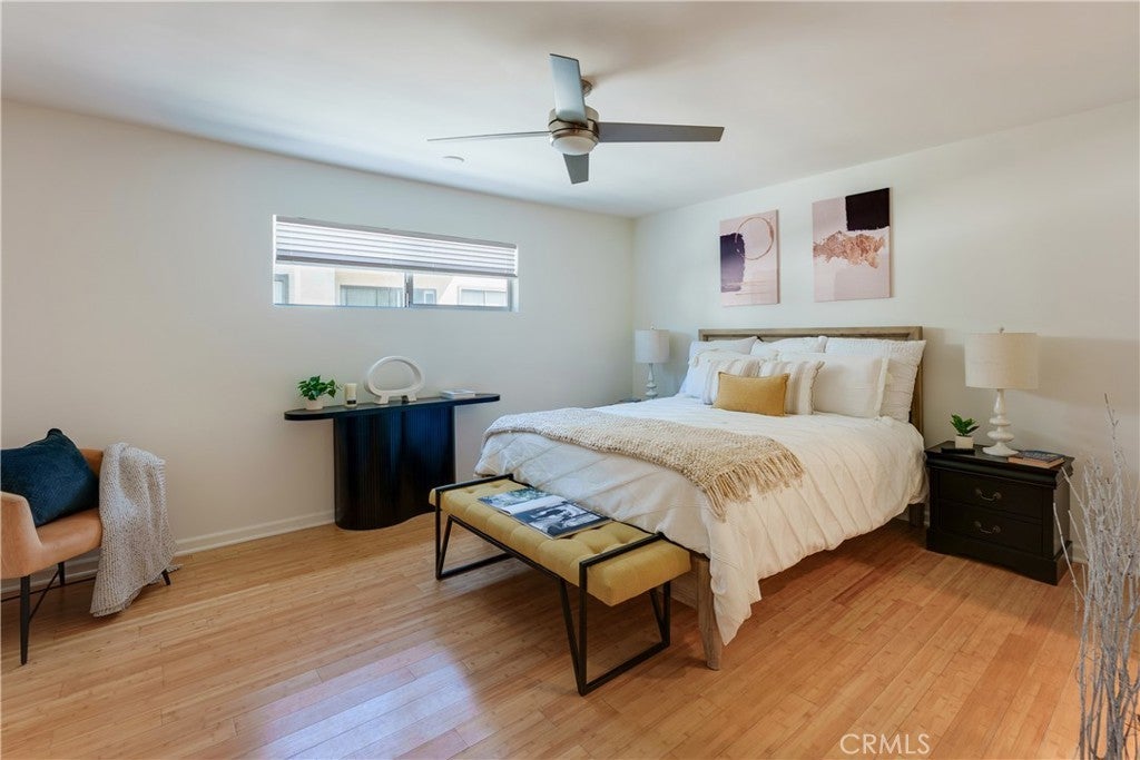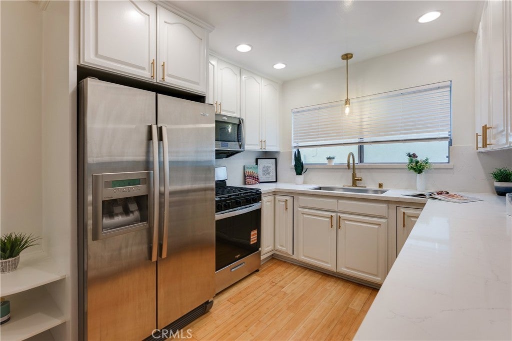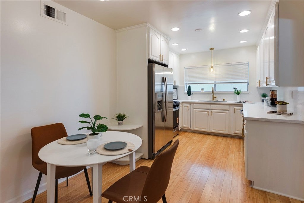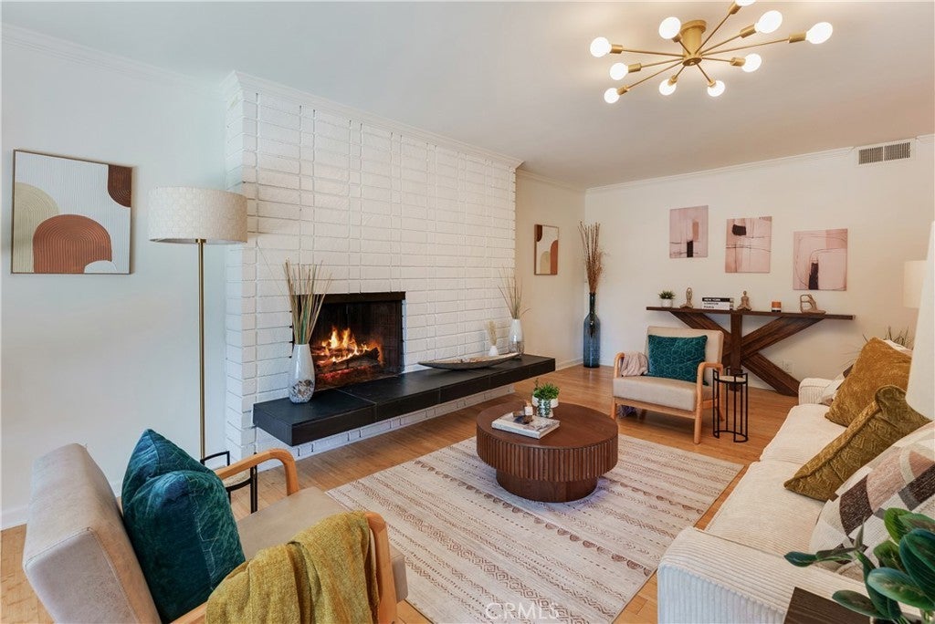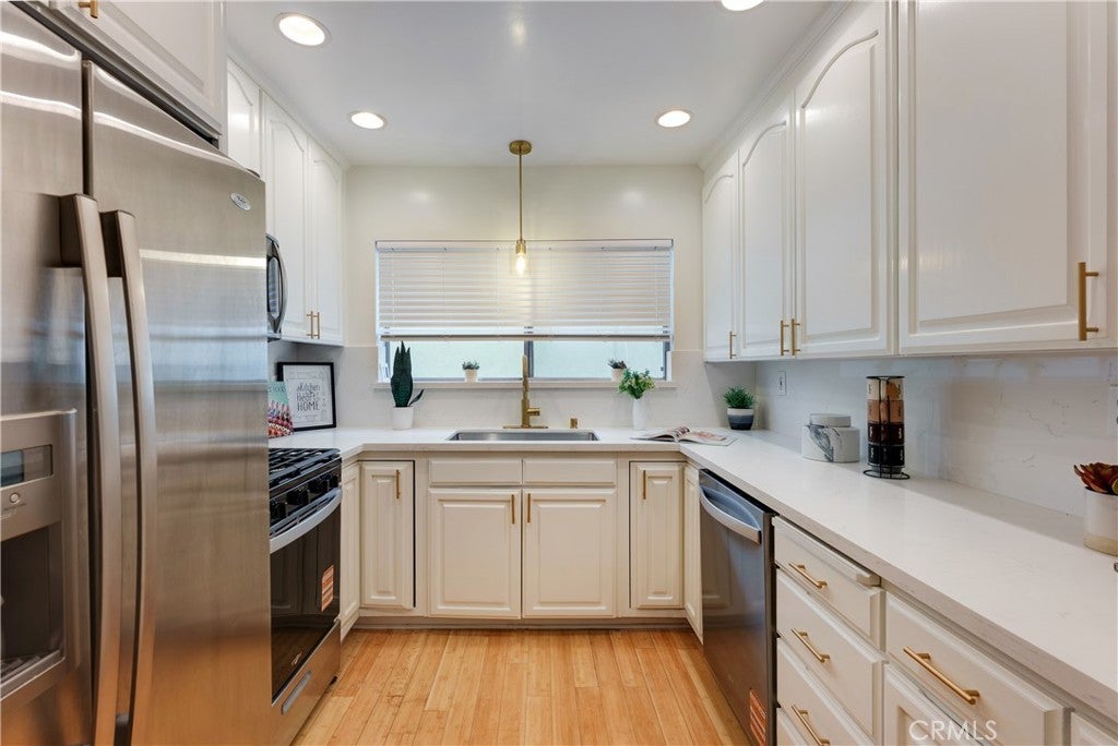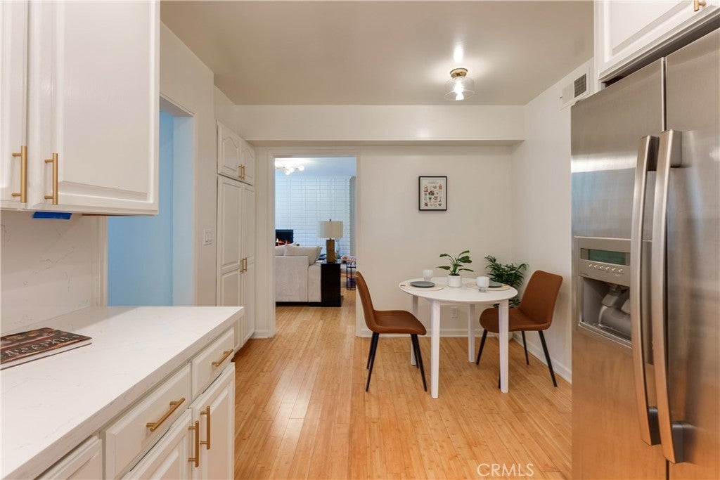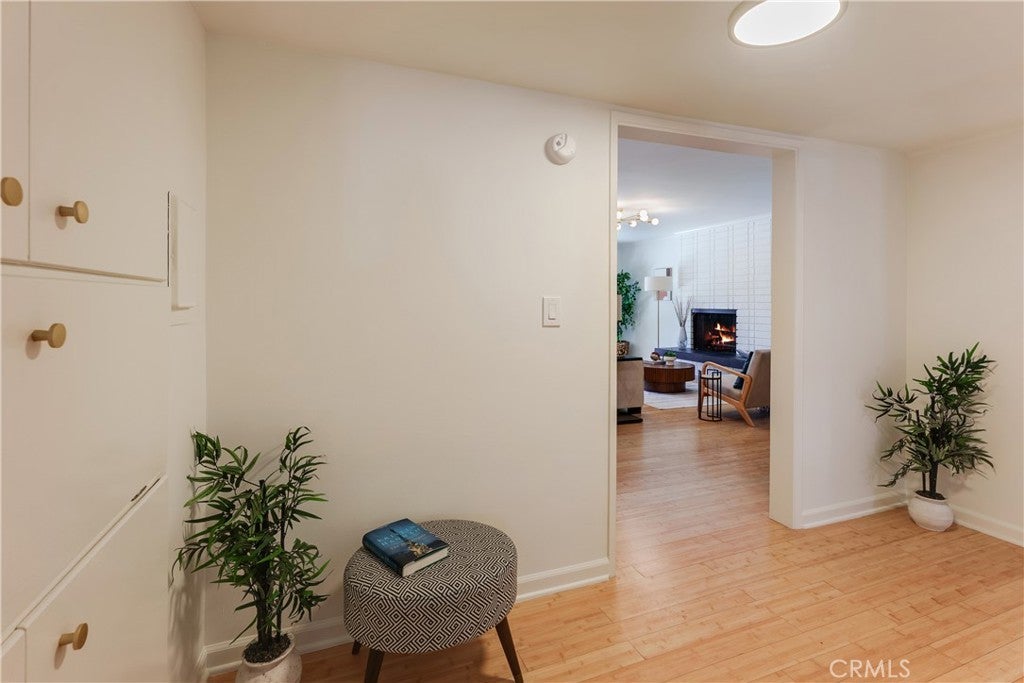 Step into this sleek mid-century modern condo, which offers the perfect blend of timeless design and contemporary upgrades. This spacious 2-bedroom, 2-bath residence features generously sized rooms and an open floor plan that creates a bright, airy feel throughout. The formal living room is anchored by a cozy fireplace, making it an inviting space to relax or entertain. The eat-in kitchen is both stylish and functional, showcasing quartz countertops and stainless steel appliances, including a brand-new stove and dishwasher. Bamboo flooring runs throughout the home, complemented by updated lighting that enhances the clean, modern aesthetic. Both bedrooms are well-proportioned, offering comfort and privacy. The large primary suite boasts abundant closet space and an ensuite featuring a remodeled bathroom with additional linen storage. The hall bathroom has been thoughtfully updated with a new vanity, countertop, floating shelves, and a tub/shower combination for added convenience. Located in an intimate 6-unit building on a quiet, residential street, this condo offers a shared two-car garage and a designated storage area. Enjoy the newly purchased washer and dryer , free of charge, steps away from the unit. Space to add washer and dryer in the unit. A perfect combination of classic mid-century charm and modern living. --