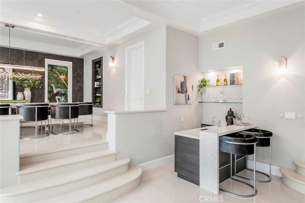 • Interior FeaturesBuilt-in Features, Breakfast Area, Crown Molding, Separate/Formal Dining Room, High Ceilings, Open Floorplan, Recessed Lighting, Storage, Bedroom on Main Level, Entrance Foyer, Primary Suite, Walk-In Closet(s), Coffered Ceiling(s), Tray Ceiling(s), Wet Bar, Wired for Sound