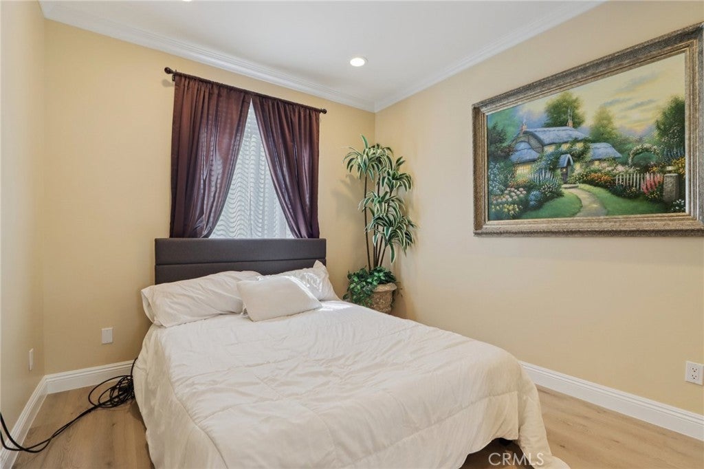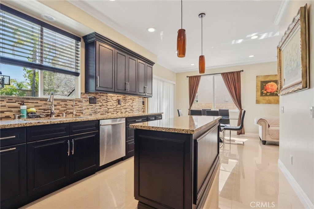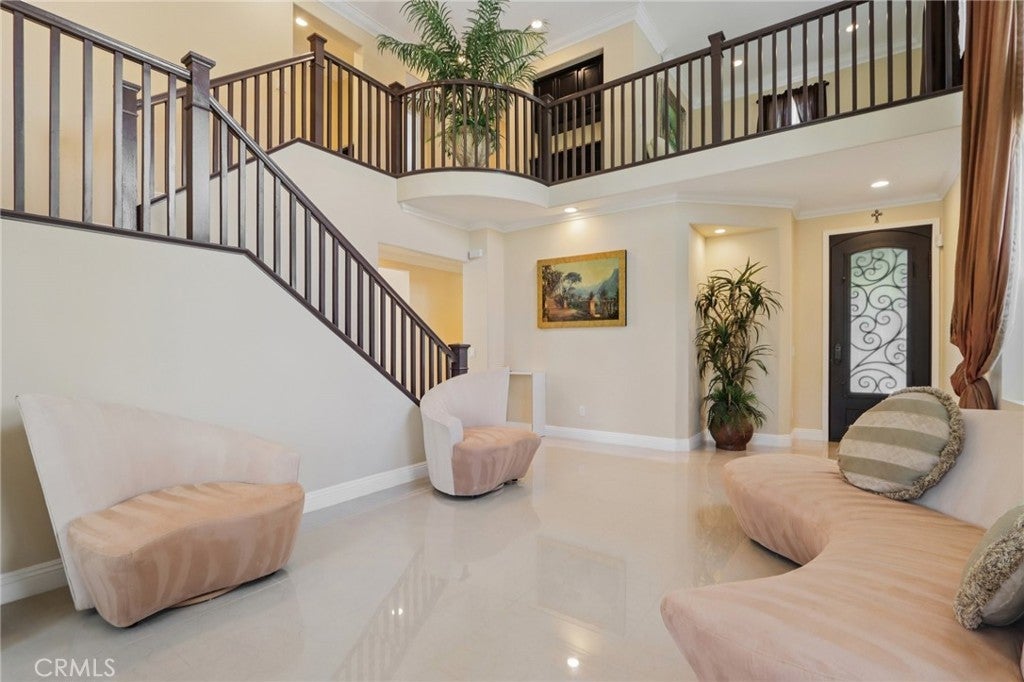 Stunning two-story home in desirable Stevenson Ranch featuring 4 bedrooms and 3 bathrooms, including a convenient downstairs bedroom and full bath. Offering approximately 2,698 sq ft of living space on a 5,656 sq ft lot, this beautifully remodeled home (2017) showcases a custom wrought iron entry door, high-gloss porcelain flooring, recessed lighting, and a formal living room with cathedral ceilings. The gourmet kitchen features a center island, granite countertops, custom cabinetry, and opens to the family room with fireplace and sliding glass doors leading to a landscaped backyard. Upstairs offers laminate wood flooring throughout, a bright primary suite with walk-in closet, and a spacious bathroom with dual sinks and walk-in shower. Secondary bedrooms are generously sized with ample closet space. Additional features include a separate laundry room with top-of-the-line washer and dryer, a security alarm system, and an attached 3-car garage with tiled flooring, built-in workstation, and automatic car lift.