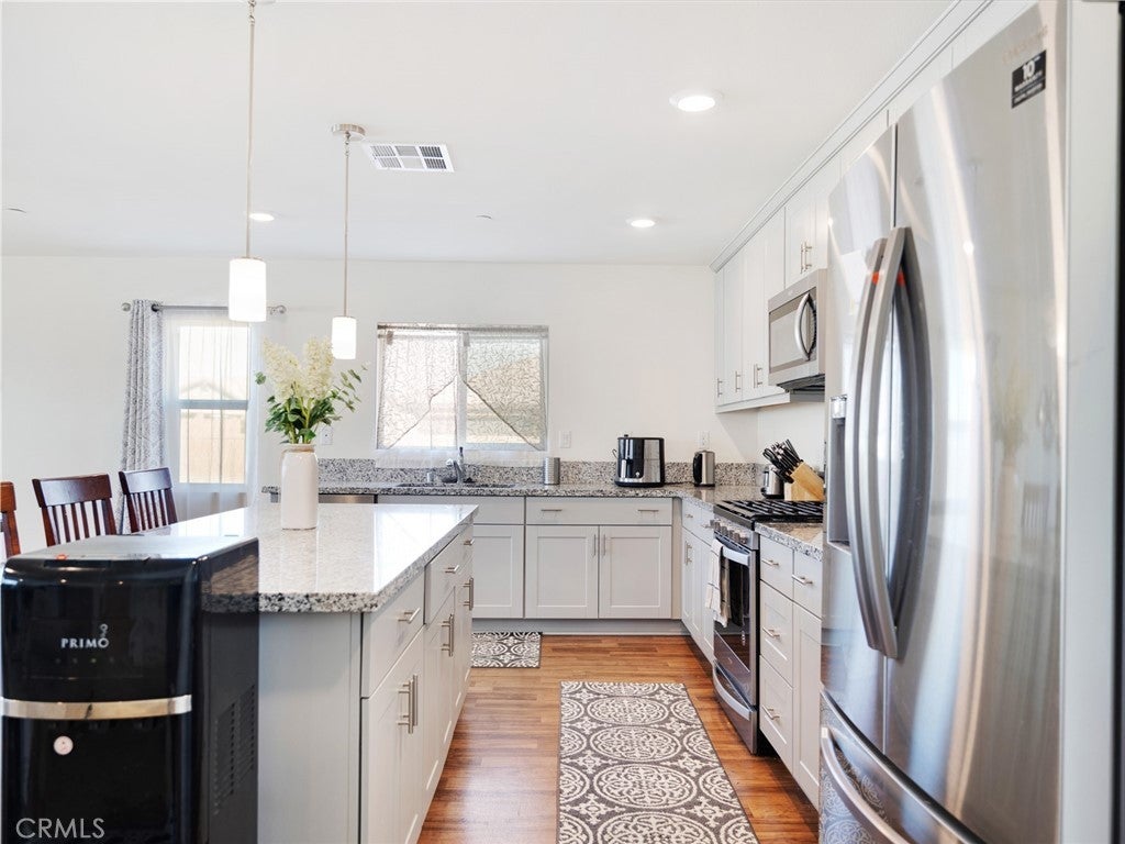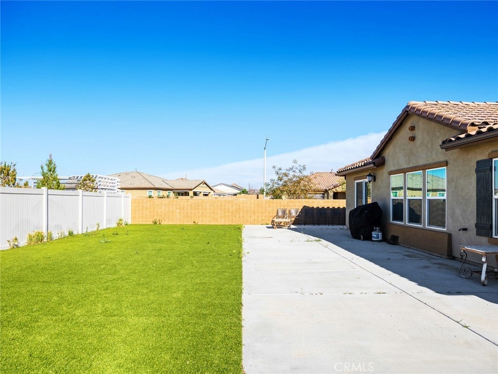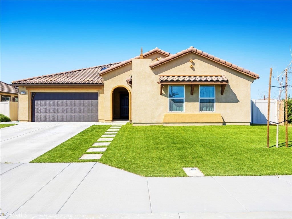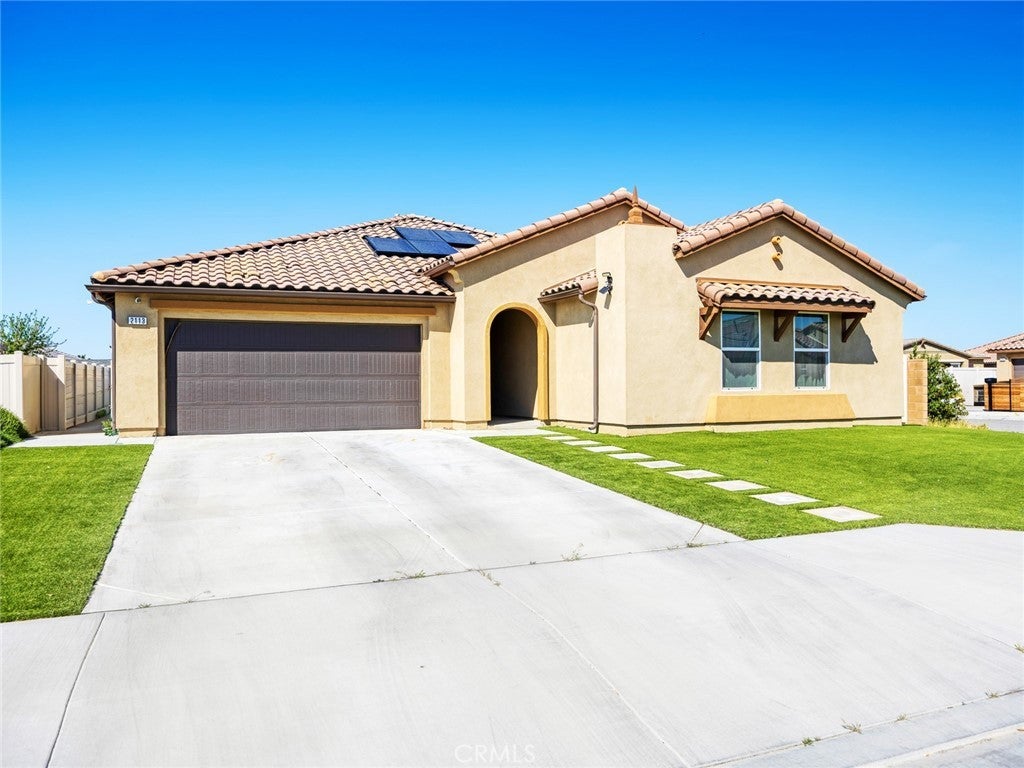 Modern living meets energy efficiency in this beautifully maintained 2020-built single-story home located in the desirable Sapphire Dunes tract with no HOA. Situated on a corner lot, this 3-bedroom, 2-bathroom home offers approximately 2,179 sq ft of living space, plus a den ideal for a home office or additional living space. Step inside to find a well-designed layout with a combination of durable flooring and comfortable carpeting throughout. The kitchen features stainless steel appliances and contemporary finishes, opening to the main living areas for easy everyday living and entertaining. Enjoy year-round comfort with central AC and the added benefit of solar panels for improved energy efficiency. The spacious lot provides a low-maintenance backyard with turf and concrete, perfect for outdoor gatherings. Complete with a 2-car garage and additional driveway parking, this home offers both convenience and functionality. Conveniently located near shopping and dining, including Super Walmart, Aldi, and Stater Bros., with easy access to local amenities. This move-in ready home is a great opportunity in a growing Lancaster community.