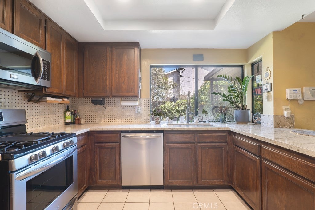 This wonderful Winnetka home with lovely curb appeal has 3 family bedrooms and 2.5 baths. The primary bedroom has vaulted ceilings and a private bath with dual sinks and dressing area. The large 2nd bedroom has the potential to be spilt into 2 bedrooms, making the home a 4 bedroom. The third existing bedroom has a large walk-in closet with built-in shelves. The home is 2,070 square feet and is situated on a 5,810 square-foot lot. You’ll enter through the double door entry into the spacious, sunbathed living room with vaulted ceilings and wood floors conveniently adjacent to the dining room. The large dining room is located convenient to the remodeled kitchen. The family chef will love the spacious remodeled kitchen with ample cabinets and counter space, quartz counters, decorator tile backsplash and easy-care tile floors, and a convenient breakfast bar. The kitchen also has a built-in desk, recessed lighting, stainless steel appliances including a gas range, built-in microwave, stainless steel dishwasher, large single basin sink and is open to the family room. The family room has a floor-to-ceiling brick fireplace with a custom mantle, wet bar, wood flooring and sliding glass doors leading to the entertainer’s backyard. The home’s many amenities include a tile roof, a ceiling fan in a bedroom, central air and heat for year-round comfort, and laundry conveniently located in the garage. There is also a energy-efficient tankless water heater and automatic sprinkler system in the front and back yards. You’ll enjoy entertaining family and friends in the private backyard with its covered patio, grassy play area and mature fruit trees and mature landscaping offering nice privacy. There is a 3-car garage with direct house access and an oversized concrete driveway for ample off-street parking. Close to schools, world-class dining and shopping at the Warner Center Village, Westfield Topanga Mall and The Northridge Mall, Pierce College and California State University Northridge and centrally located with easy Orange Line and freeway access.