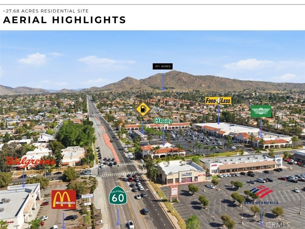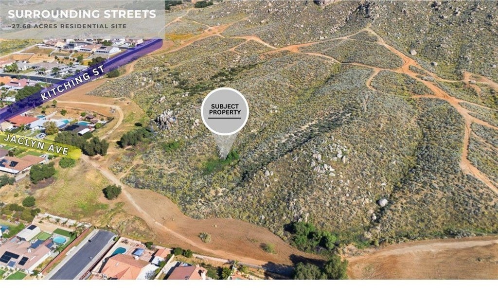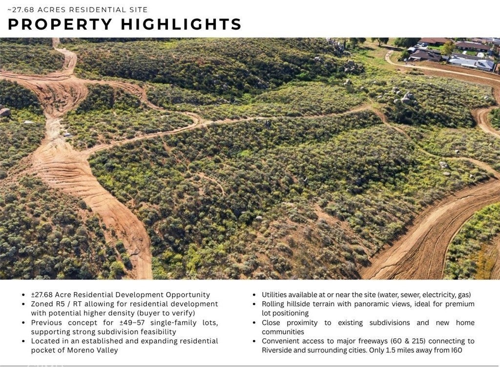 Exceptional residential development opportunity in Moreno Valley. This ±27.68 acre parcel is ideally located east of Kitching St and north of Jaclyn Ave within an established and expanding residential area. Zoned R5 (Hillside Residential), allowing for single-family residential development (buyer to verify with the City). Previous development concepts indicate the potential for approximately 49–57 single-family residential lots. The site features rolling hillside terrain with natural drainage channels and offers potential for scenic views. Surrounding properties include existing residential communities, providing strong context for future development. Utilities including water, sewer, electricity, and gas are near the site. A future project would require standard off-site improvements and infrastructure typical for development of this scale. Located within the growing Inland Empire region, the property benefits from strong housing demand and proximity to major transportation corridors including the i60 that is 1.5 miles away and the 215 freeways, as well as nearby schools, retail, and employment centers. Due diligence materials available include prior tentative tract maps, topographic survey, environmental information, and preliminary development concepts. No assigned street address. Property is identified by APN 474-100-025. Buyer to verify all information including zoning, utilities, development potential, and permitted uses with the City of Moreno Valley and applicable agencies.