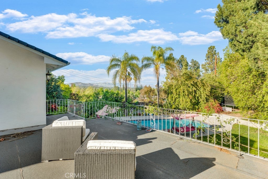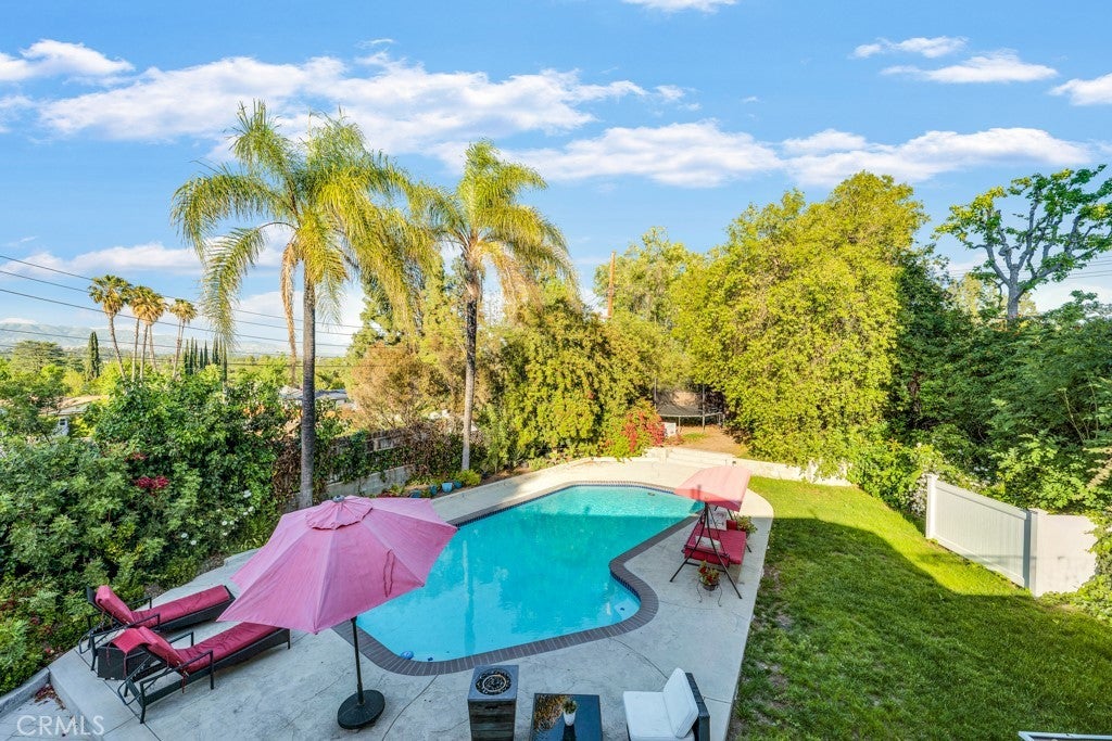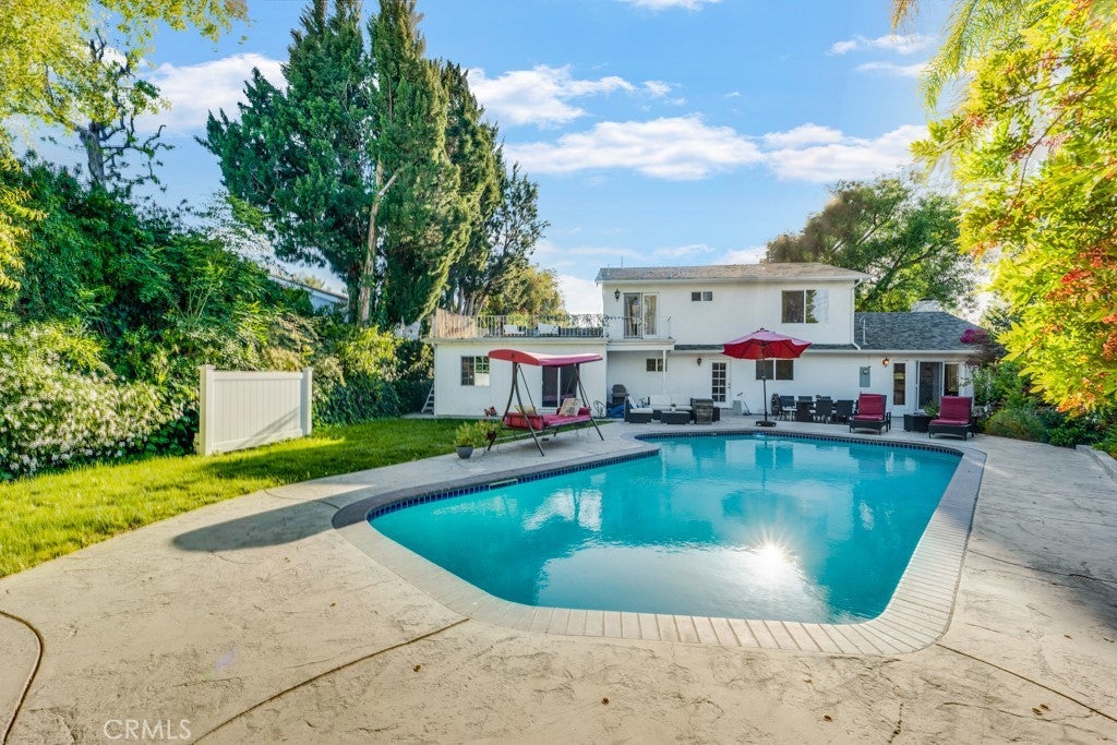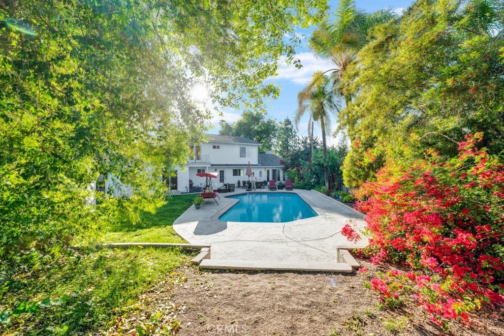 This luxurious 5 bed, 4 bath (3 full & 1 half) home boasts an open floor plan, recessed lighting, and a modern color scheme. Enjoy the cozy front porch, circular driveway, vibrant landscaping, and premium finishes. Inside, find stylish flooring, crown molding, and an expansive living room with a marble fireplace and custom cabinetry. The open concept kitchen features granite counters, and a wine refrigerator, with a dining area overlooking the backyard. The fully enclosed backyard is perfect for entertaining with a pool and lush landscaping. Upstairs, two primary suites offer serene retreats, including a main primary with a balcony and spa-style bathroom. Three additional bedrooms are downstairs. The exterior has been freshly painted for a pristine look. Conveniently located within walking distance to El Camino Real Charter High School and Hale Charter Academy.