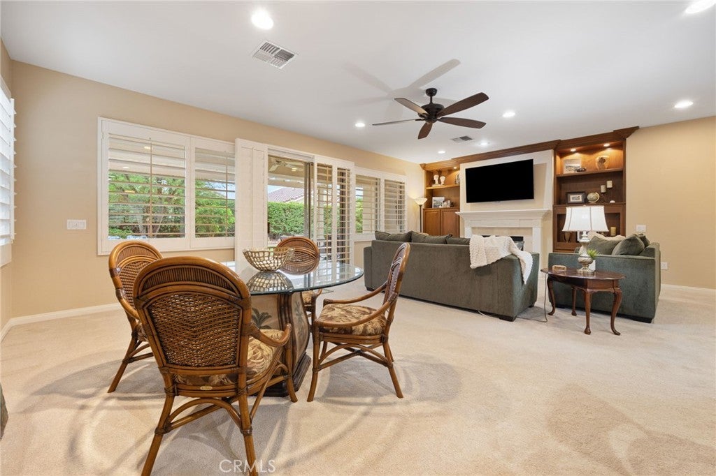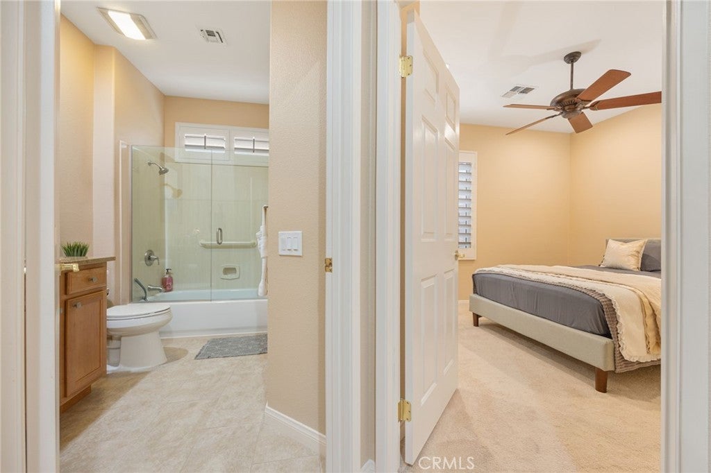 THIS IS A SHORT TERM RENTAL! Located in the best 55+ community in the valley, Sun City Palm Desert, this St. Croix model is the most popular floorplan in the subdivision. It has 2 bedrooms, 2 bathrooms and a den with an extra ''flex'' room that can be used for hobbies, an extra guest room, or an office etc. The HVAC system is approx.. 2 years old. The open concept of this home makes it super desirable. The kitchen is upgraded with slab granite, stainless appliances, original upgraded cabinets with hardware. custom backsplash, and is open to the dining room and living room with views out to the fabulous north facing backyard. The living room has a cozy fireplace with a marble surround, and a custom built-in entertainment center. The master bedroom has a bay window viewing the backyard, and the bathroom has a walk-in shower, soaking tub, walk-in closet, and some nice upgrades. The guest bedroom is inviting and is adjacent to the full 2nd bathroom. The laundry room has a sink, cabinets, and includes the washer and dryer. The backyard is beautiful, with real grass, lush landscaping, fruit trees, and it is very private. The extended garage has storage cabinets, a separate extended golf cart garage, a workshop, and a mini-split. Please contact us for more information on rates and availability.