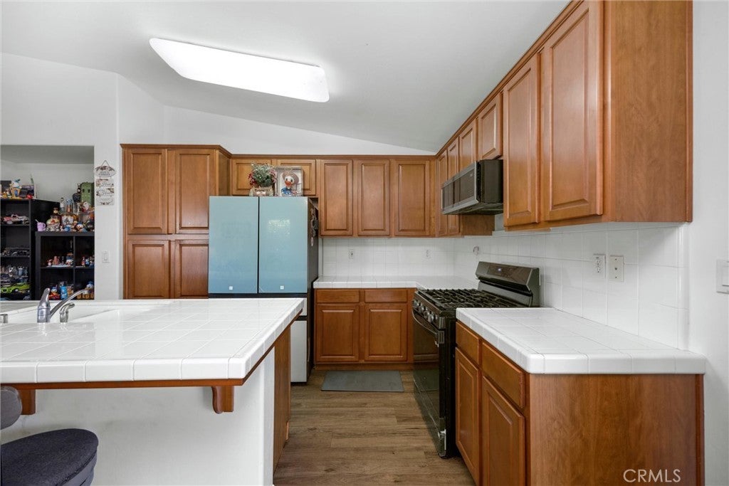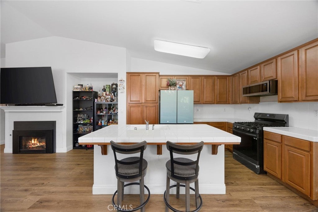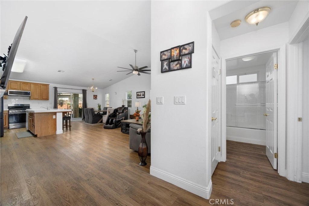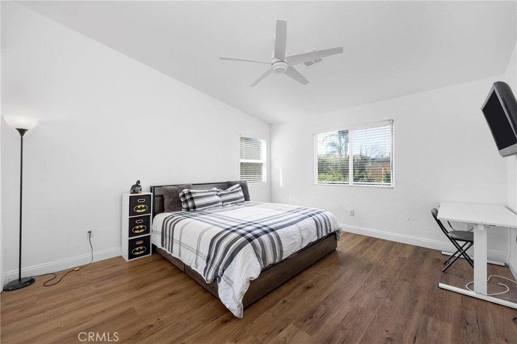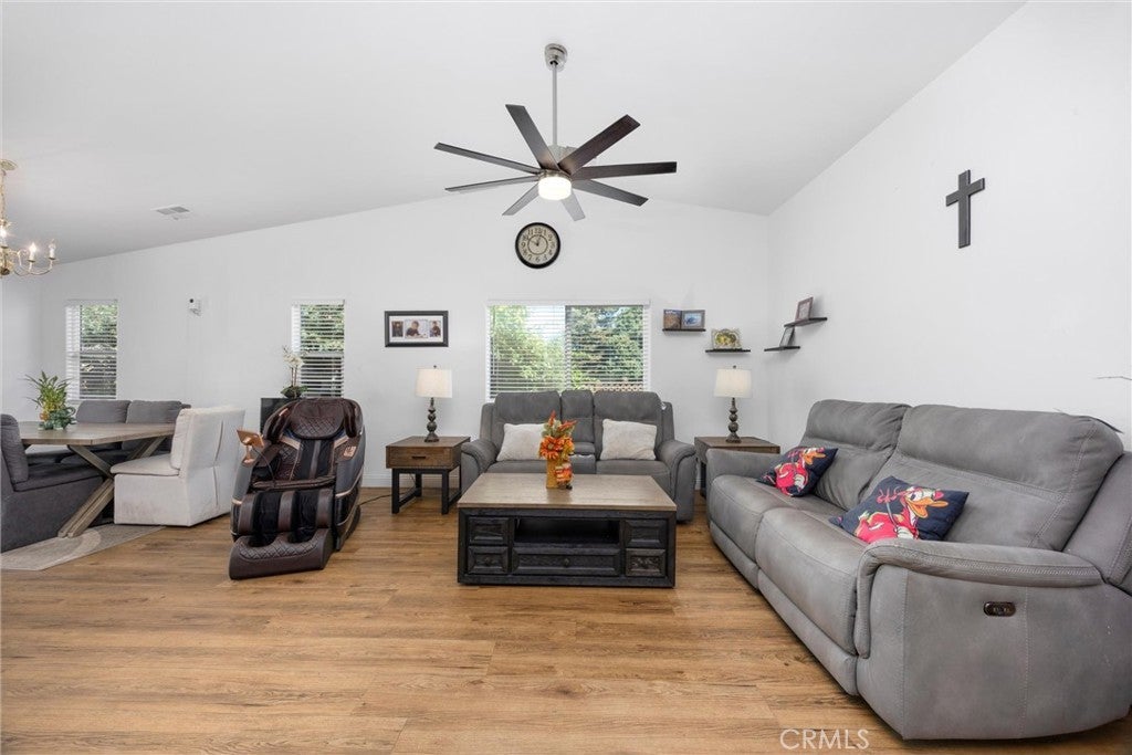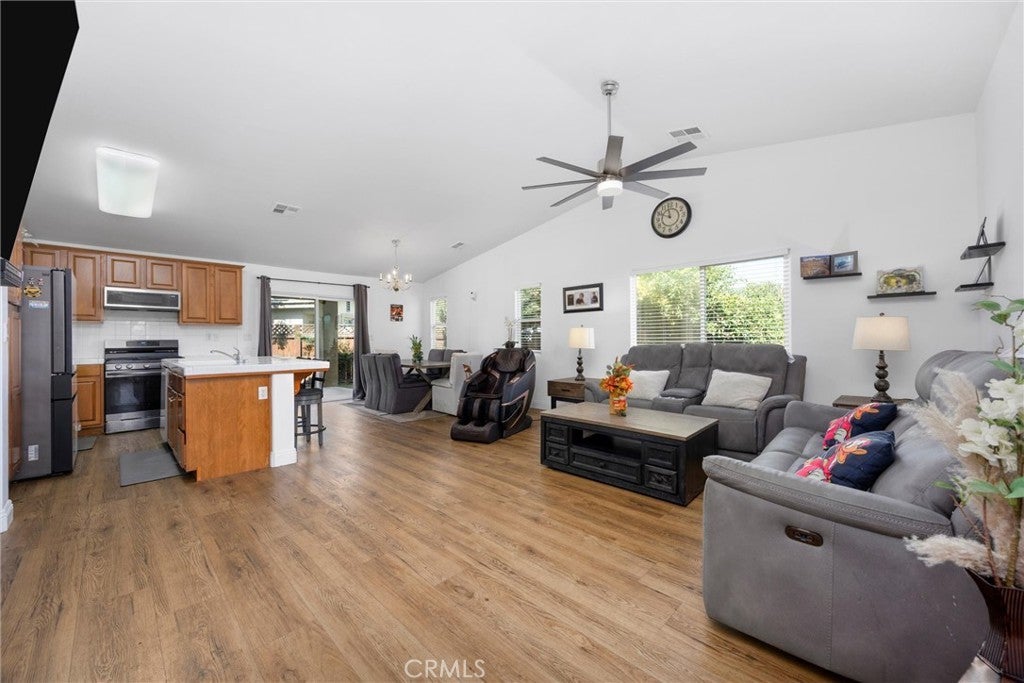 Welcome to this beautifully maintained home in the desirable Seven Oaks Place community. Designed with vaulted ceilings, wood-look flooring, and an open layout, this home offers style and comfort. The spacious living room with fireplace flows into the kitchen featuring rich cabinetry, breakfast bar, and stainless appliances. A bright dining area opens to the backyard for easy entertaining. The front bedroom is en suite with its own bathroom—perfect for guests or multi-generational living. With a prime location in Seven Oaks Place near shopping, dining, and top schools, this move-in ready home delivers comfort and convenience.
