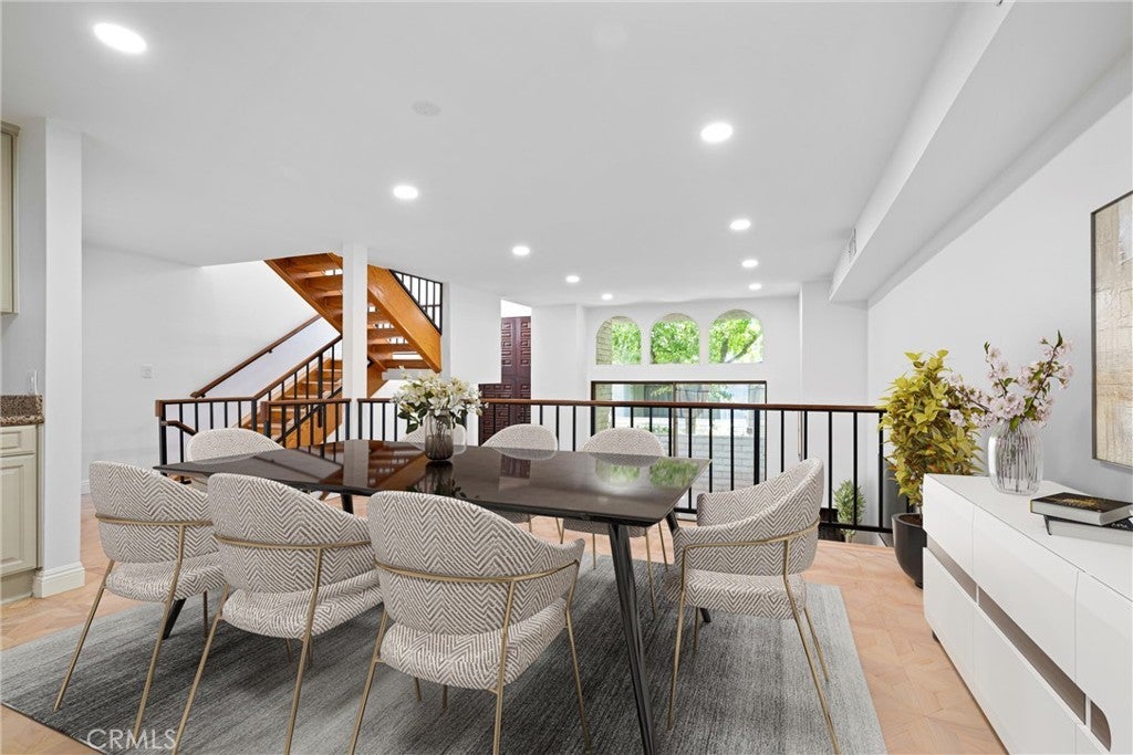 Located in the coveted Encino Spa East community, this gated, resort-style complex offers an exceptional balance of luxury and convenience. Tucked away from the main street, the building provides a peaceful and private setting while remaining close to the best of the area. This rear-facing unit is ideally situated within the community, offering enhanced privacy, tranquility, and pleasant views. The spacious multi-level floor plan features a bright and open living room with soaring ceilings and access to a private patio—perfect for relaxing or entertaining. Additional living spaces include a formal dining room, a comfortable family room, and an eat-in kitchen. Upstairs, the expansive primary suite boasts high ceilings, a walk-in closet, and a private en-suite bathroom. Two additional bedrooms and a full bathroom complete the upper-level layout, ideal for guests or family living. Recent upgrades include tile and hardwood flooring throughout, a remodeled kitchen with newer appliances, recessed lighting, and fresh interior paint. Bathrooms have been thoughtfully updated with designer fixtures, custom tilework, and a soaking tub for added comfort. Additional highlights include direct access to an attached garage and secure, controlled entry to the building. Community amenities include a pool, clubhouse, and beautifully maintained walking paths. Conveniently located near the 101 and 405 freeways, Ventura Boulevard, and an array of shops and dining options, this home offers the perfect blend of peaceful living and urban accessibility. HOA dues include cable TV, high-speed internet, water, earthquake insurance, and controlled access.
