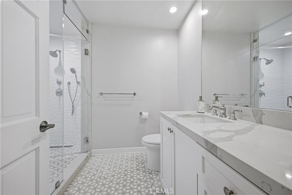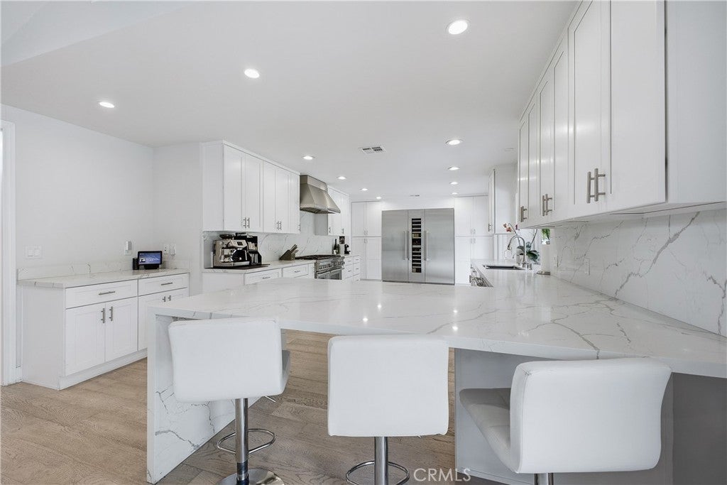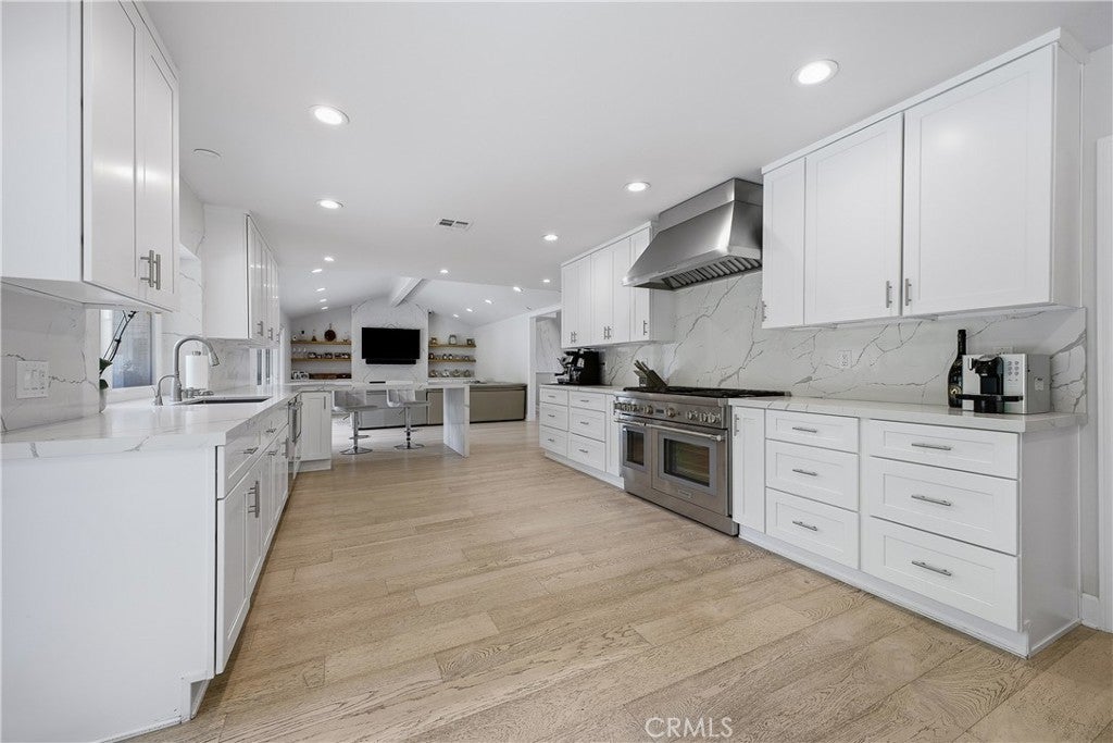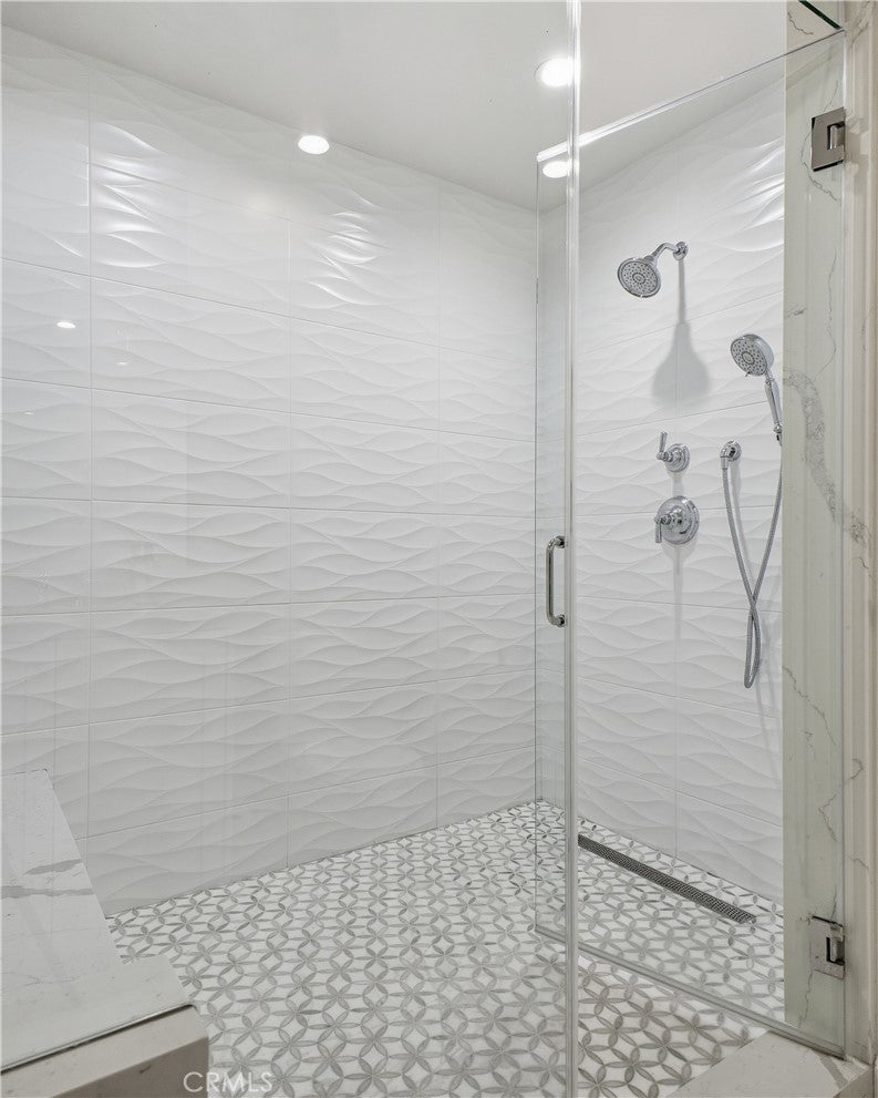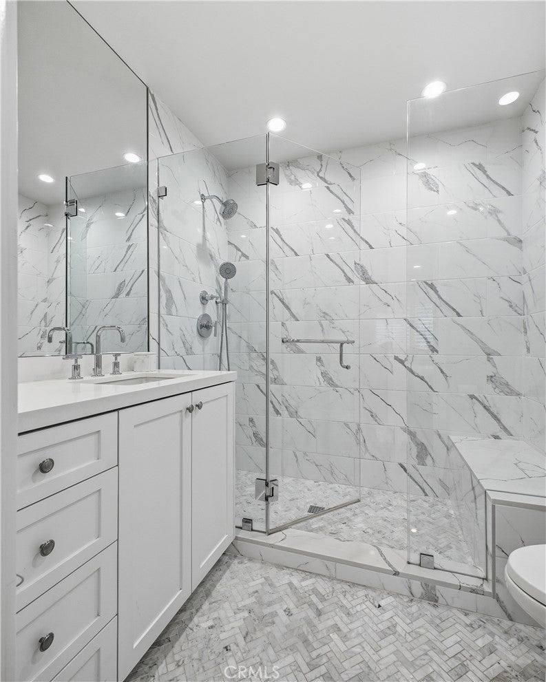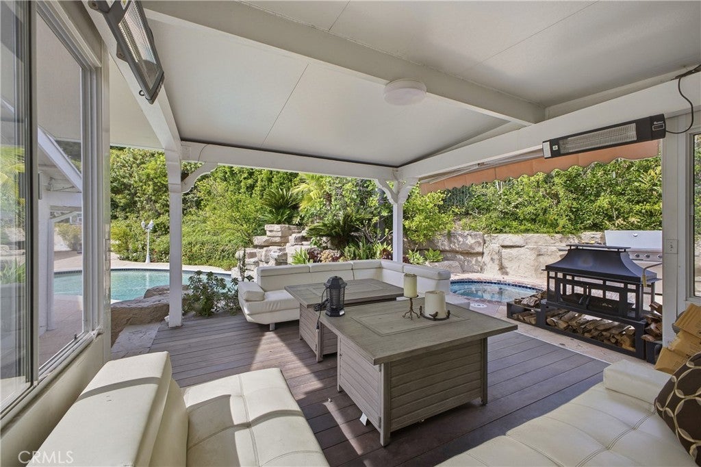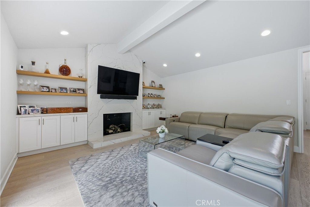 Discover this stunning and spacious 5-bedroom, 5.5-bathroom family home, ideally positioned at the end of a quiet and highly sought-after cul-de-sac. Step inside to a bright, airy interior featuring beautiful European oak flooring throughout and a thoughtfully designed open-concept layout, perfect for both everyday living and effortless entertaining. The expansive kitchen and family room seamlessly lead to a private, low-maintenance backyard oasis, complete with a sparkling pool and spa, as well as an inviting outdoor patio and lounge area featuring a fireplace and outdoor shower, ideal for enjoying outdoor living year-round. The kitchen is equipped with sleek countertops, high-end appliances, and a wine refrigerator, blending style with functionality. Both the formal living room and family room showcase elegant fireplaces with dramatic floor-to-ceiling marble feature walls, adding warmth and sophistication. The luxurious primary suite serves as a serene retreat, highlighted by French doors that open to the backyard and a newly remodeled, spa-inspired bathroom. This elegant space features porcelain tile throughout, dual vanities, dual separate toilet rooms, a walk-in shower, a freestanding soaking tub, and a spacious walk-in closet. Three additional bedrooms offer en-suite bathrooms, including one privately situated on the opposite side of the home, perfect for guests or multigenerational living. An additional hallway bathroom is beautifully finished with marble flooring, porcelain tile, and a steam shower, creating a true at-home spa experience. Additional highlights include newer solar panels, a well-appointed garage with built-in storage, and an overall sense of peace and privacy that makes this home truly exceptional. Located in a prime area, this is a must-see property you won’t want to miss.