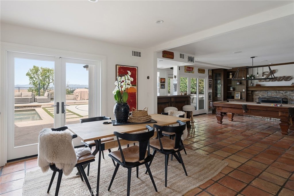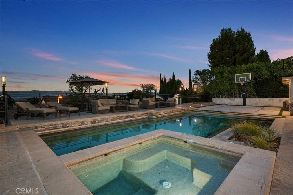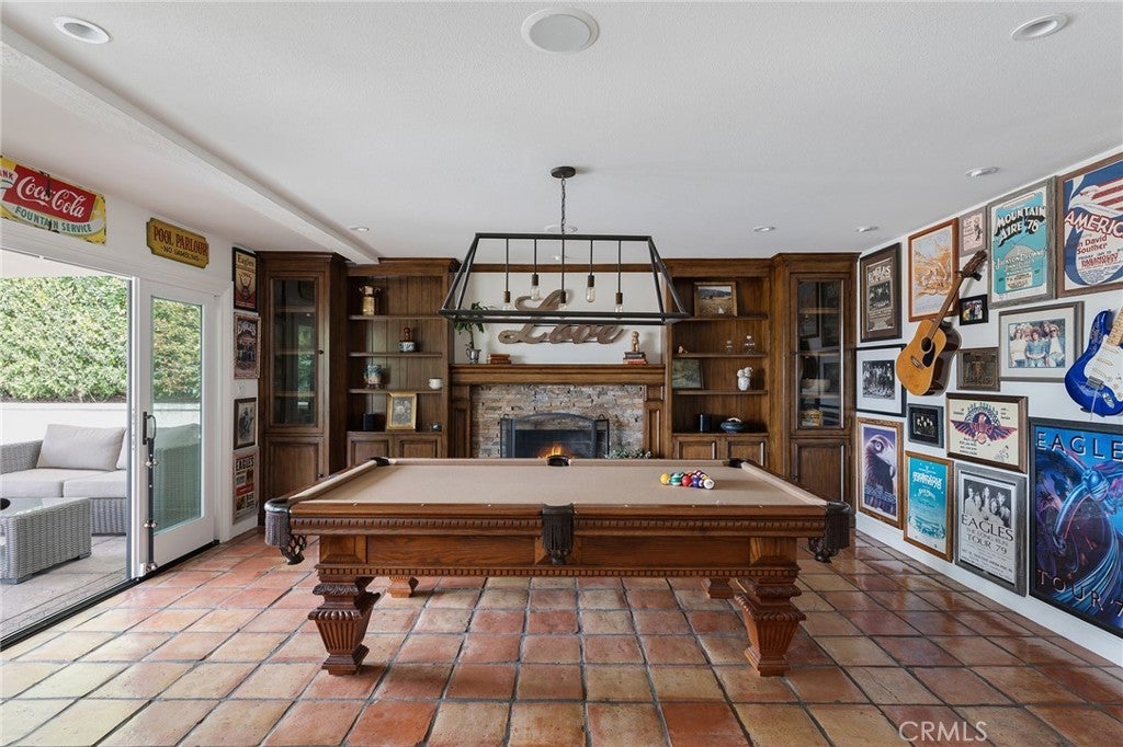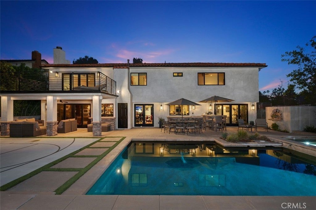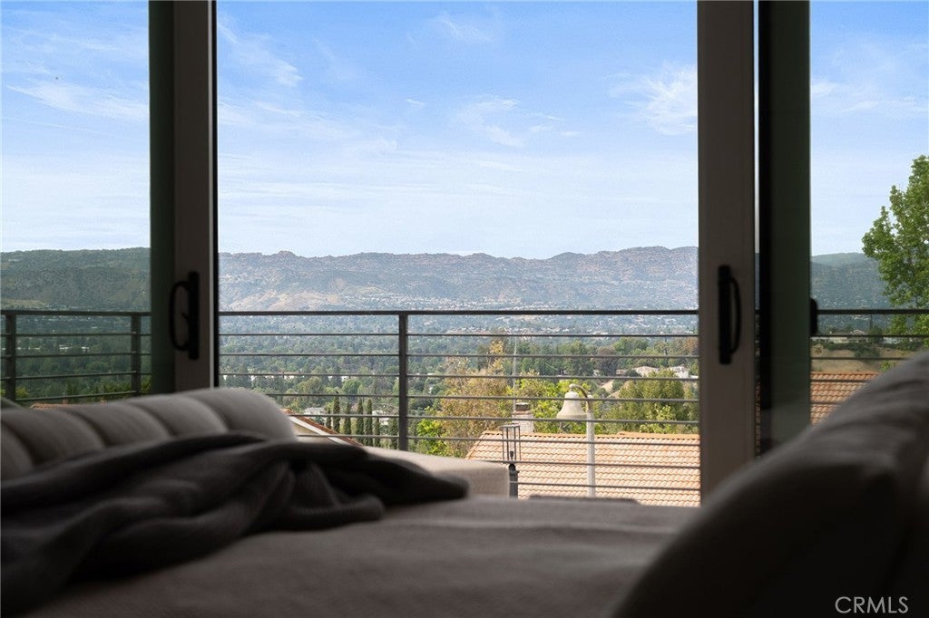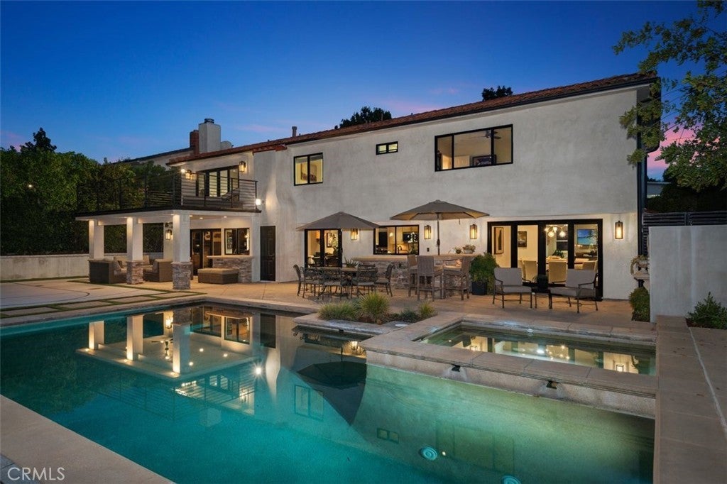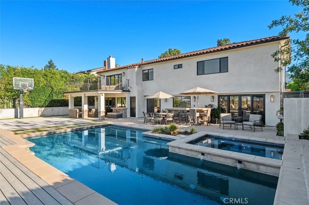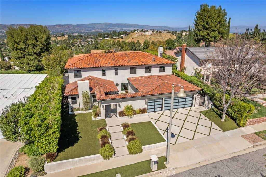 A rare offering in prime Mulwood with VIEWS, this warm Spanish style property is designed for effortless indoor-outdoor living and unforgettable entertaining. Spanning nearly 3,700 square feet, this home features 5 bedrooms and 5.5 bathrooms, including a desirable downstairs bedroom. The size, views and bedroom count are a unique find in Mulwood! A charming front courtyard welcomes you into a light-filled interior with several spots to gather, including a salon with a pool table and bar, a light and bright den and a more formal sitting area that flows into the courtyard. Newer glass doors throughout allow for a seamless flow to the outdoors. The layout is ideal for both everyday comfort and elevated entertaining. Upstairs, the spacious primary suite offers a private retreat with a cozy fireplace, walk-in closet, balcony, and sweeping views. Two of the three additional upstairs bedrooms include en-suite baths, providing both privacy and flexibility. The resort-style backyard is complete with a pool, oversized spa, covered patio, deck, half sport court, and a covered dog run - perfectly blending function and lifestyle. A finished 3 car garage currently serves as a gym, adding even more versatility. The downstairs bedroom has its own full bathroom and is ideal for multi generational living or an office. With its rare size, unique Spanish character, and exceptional indoor-outdoor experience, this is a standout offering in one of Calabasas’ most sought-after neighborhoods. Truly a special home ready for you to make lifelong memories! In close proximity to all three assigned public schools and Gelson’s shopping center, this property really has it all!