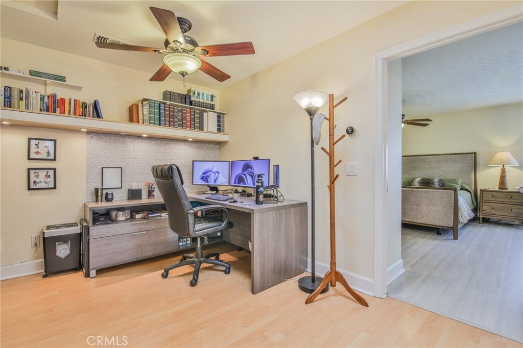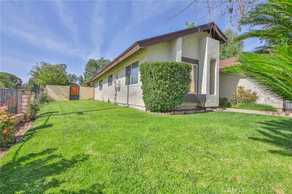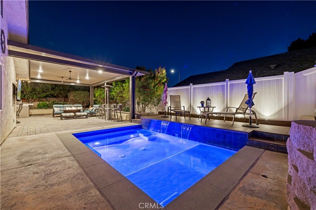 Nestle in the desirable Valencia community, this well-maintained single-family residence offers 3 bedrooms 3 baths, and appoximately 2,083 square w feet with of throughtfully designed living space. A gated front entry welcome you with manicures landscaping, creating an inviting first impresion. Inside, the home opens to a bright and spacious living area featuring clean tile flooring at the entrance, and warm laminate floors throughout the main living space, enhanced by abundant natural light. The Kitchen is positioned to the left of the home and offers generous functionality with ample cedar cabinetry, quarts countertops, a stainless-steel-faucet, and dedicated space for dinning. Additional features include a breakfast bar and a built-in wine refrigerator, making it ideal for both everyday living and entertaining. The right wing of the home has been fully remodeled and includes a comfortable family room, three bedrooms with walking in closet, and a dedicated office space. One bathroom is conveniently designed with dual access between two bedrooms, while the primary suite offers privacy with is own bath, featured with dual sinks, a separate enclosed shower and toilet area, and an expansive walk-in- closet. The primary bedroom also showcases a custom ceiling design and upgraded lighting. The back yard is designed for relaxation and entertainment, accessible through sliding glass doors. Enjoy a fully equipped outdoor space complete with a built-in barbecue, patio furnishings, a swimming pool with waterfall features, and retractable awing controlled via mobile divice. The surrounding greenbelt enhances privacy and provide a tranquil setting. Additional features include integrated cable wiring and smart home capabilitieexa enables control. This is a true turnkey property, ready for immediate occupancy.
