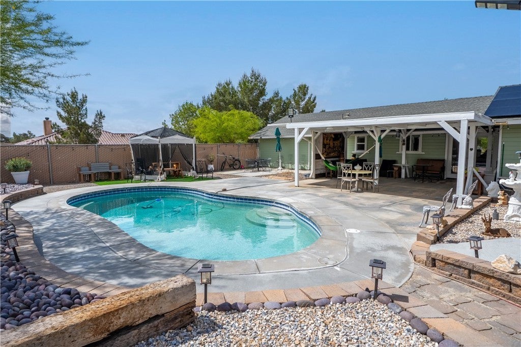 As you step into this cozy Apple Valley retreat, the first thing you feel is warmth. The living room welcomes you with a charming chimney that instantly makes the space feel like home. To your right, you will find a hallway leading you to three inviting bedrooms, two well designed bathrooms, and a convenient laundry room, everything right where you need it. Back in the heart of the home, the kitchen and dining area open naturally to the outdoors. One step through the back door and you’re greeted by a sparkling pool set against stunning mountain views. It’s the kind of backyard that makes every sunrise and sunset feel special. On the left side of the home, the attached two car garage and long driveway offer plenty of space for vehicles, RVs, and toys. With fully paid off solar panels and a brand-new central AC system, this home blends comfort with smart, energy efficient living. All of this sits on a little over 1 acre of land.