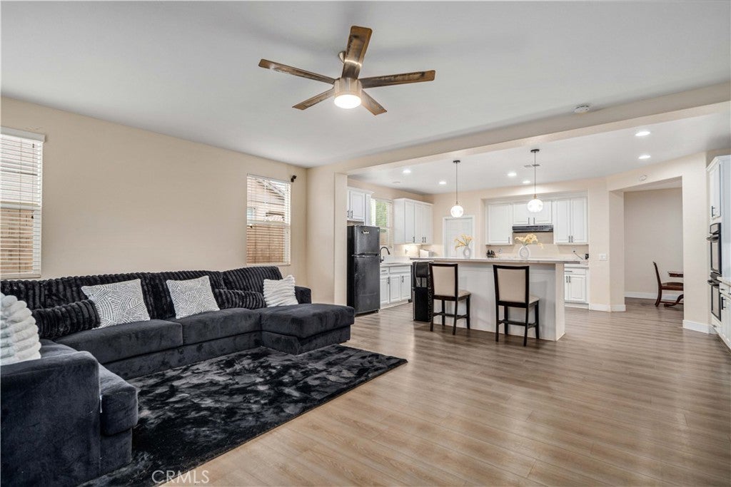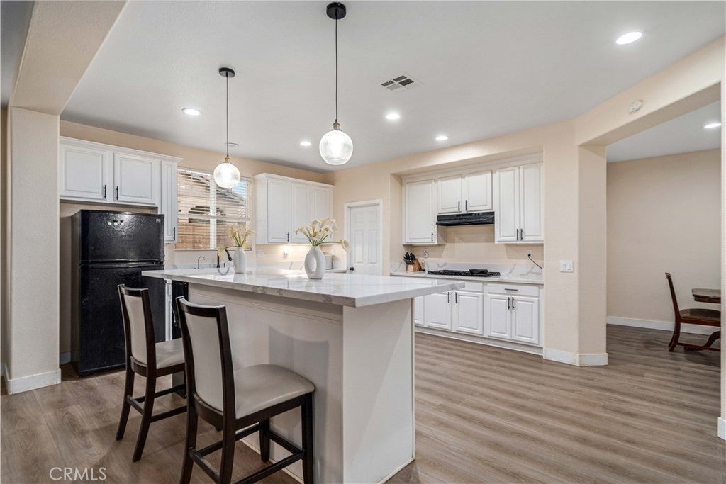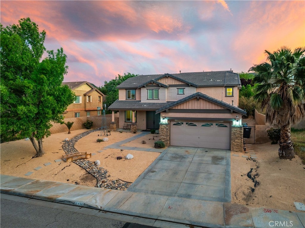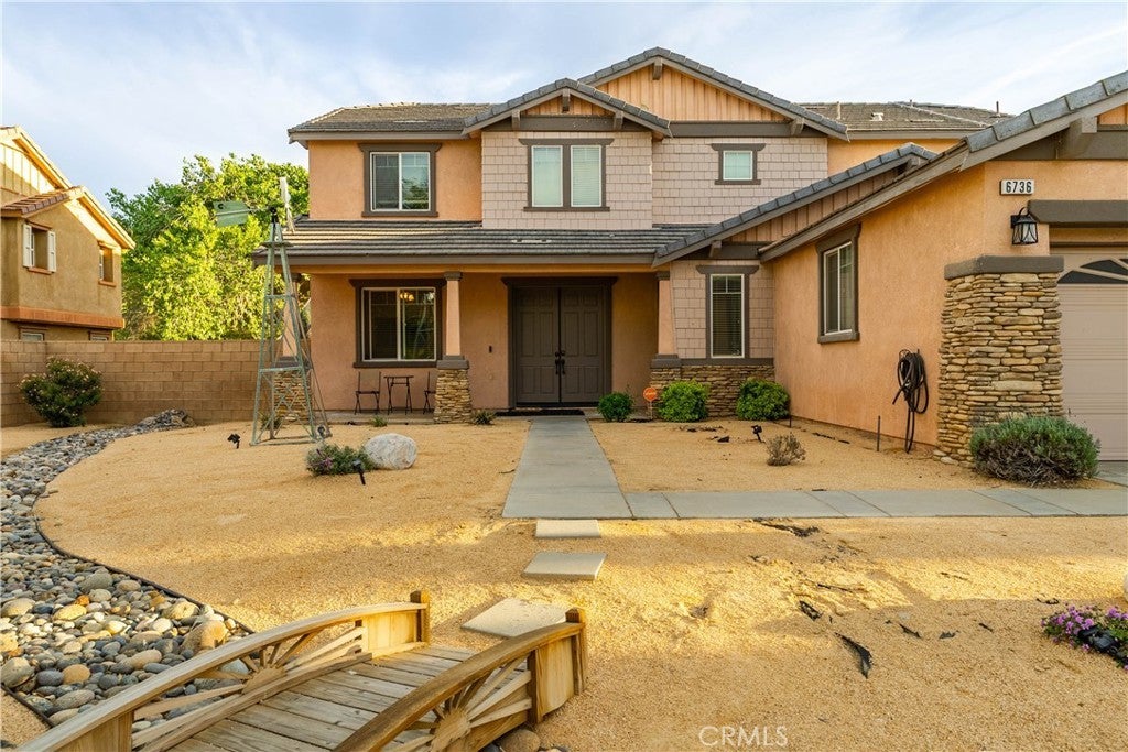 ***LIVE BEAUTIFULLY*** Stunning Two Story Palmdale Home with a Modern Upgraded Interior! Welcome to this beautifully upgraded residence that blends comfort and contemporary style. Enter through grand double doors into a striking foyer with cathedral ceilings and a chandelier that creates a memorable first impression. Recessed lighting and upgraded flooring carry throughout the home, leading into a spacious living area designed for both everyday living and entertaining. The kitchen features quartz countertops, white cabinetry, pendant lighting, bar seating, and a large center island, and opens seamlessly to the family room with a fireplace and a formal dining space. The main level also includes a bedroom and full bathroom, ideal for multi generational living or guests. Upstairs, a large loft offers flexible space for a media room, office, or play area and connects to the primary suite. The primary bathroom includes dual vanities, quartz countertops, a soaking tub, a glass walk in shower, and a walk in closet, while the secondary bathroom also features dual vanities for added convenience. The front yard showcases drought tolerant landscaping with decorative rock accents and a charming wooden bridge, and the expansive backyard provides plenty of room for entertaining, relaxing, or creating your ideal outdoor space. This home offers a thoughtful layout with modern upgrades and inviting spaces throughout. This Modern Upgraded Palmdale home is truly a must-see! Schedule your private tour today and experience this remarkable property for yourself!