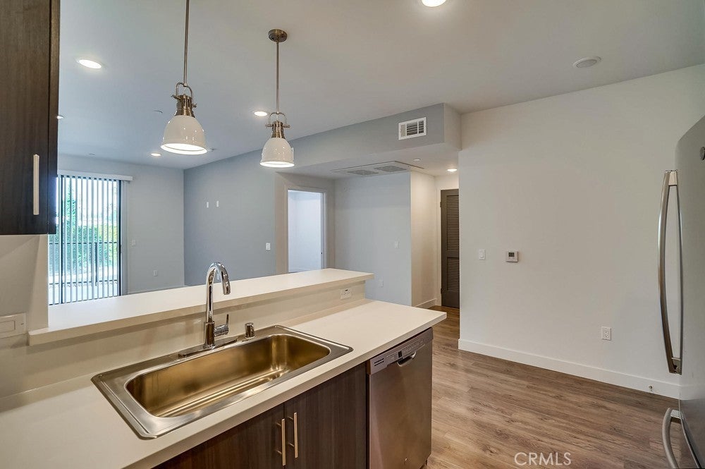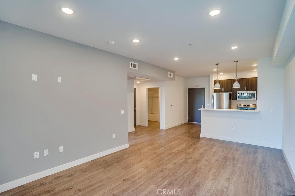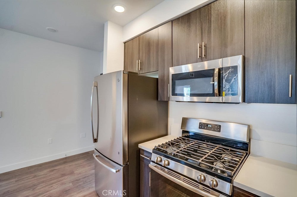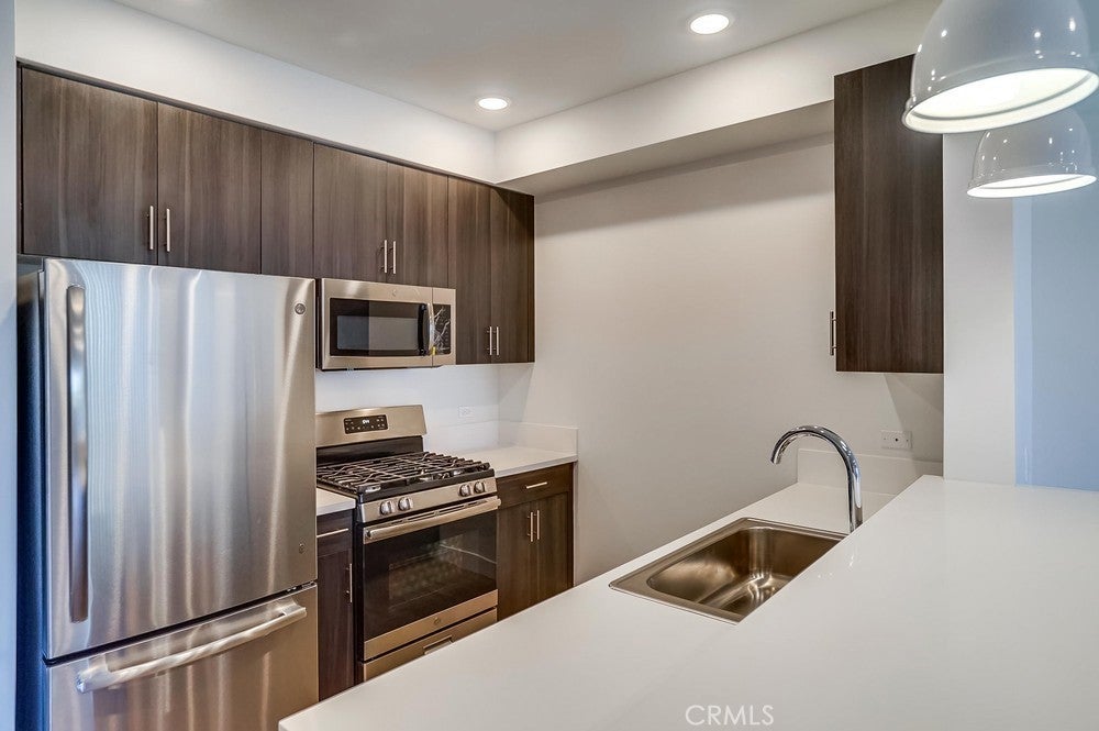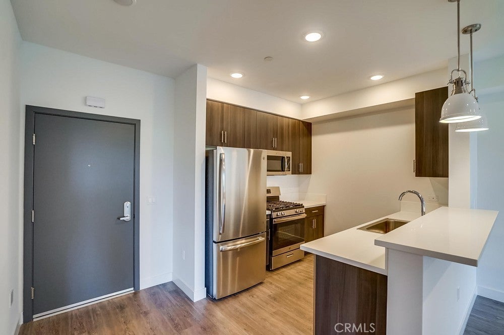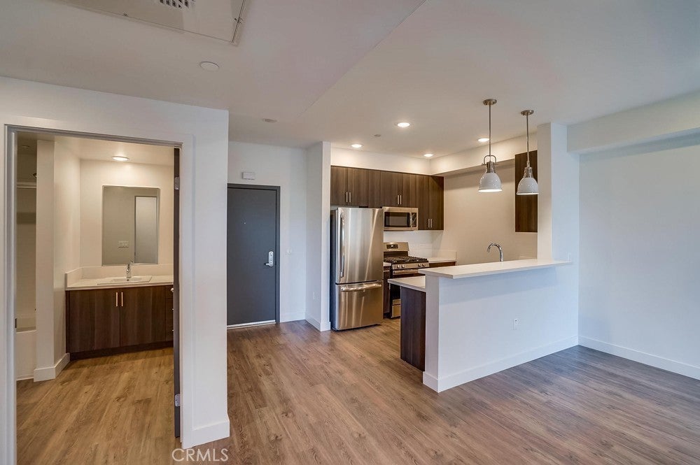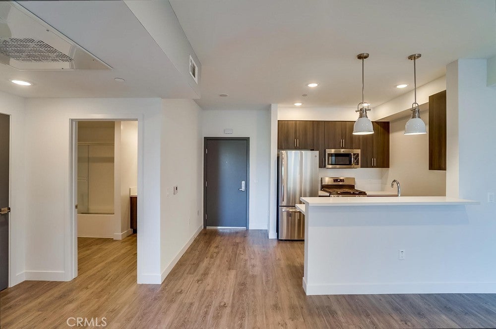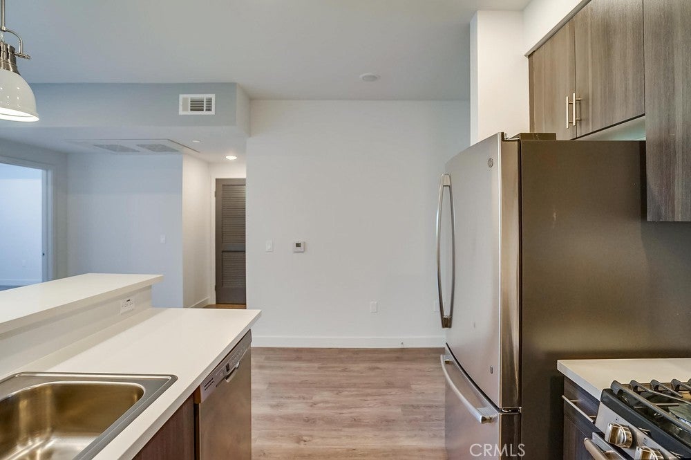 Nearly brand new construction (built in 2020) one block away from all the amazing dining, shopping and entertainment Sherman Oaks and Studio City have to offer. This incredibly updated corner unit, located away from the major streets, offers such modern amenities that include wood laminate flooring (no carpet), double pane windows, Quartz countertops, recessed LED lighting and more! The kitchen is open and offers a high breakfast bar for more casual dining. It features Quartz counters, custom cabinetry & all stainless steel GE appliances, which includes a gas range, refrigerator with pull-out bottom freezer, dishwasher and micro-hood. The living room is light, bright and spacious! It's adorned with a stylish sliding door granting you access to your private balcony that overlooks the quiet neighborhood. The LED lighting continues into the bedroom, which also offers a walk-in closet with custom built-ins. Adjacent to the bedroom rests the bathroom, complete with a spacious vanity featuring Quartz counters and plenty of storage, as well as a tub/shower combo with stylish subway tile walls and glass shower door enclosure. Lastly, you have your own in-unit FULL SIZE WASHER & DRYER! This unit comes with 1 dedicated parking space in the gated subterranean parking garage, which has EV CHARGING & is easily accessible from the nearby elevator, in addition to a community rooftop deck with sitting areas and a gas bbq.
