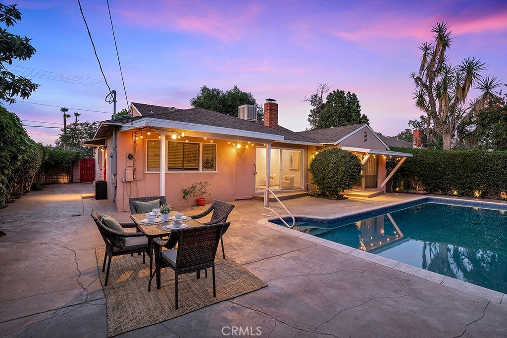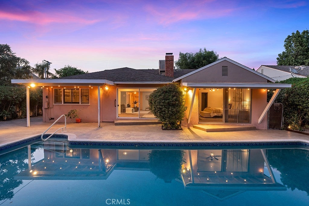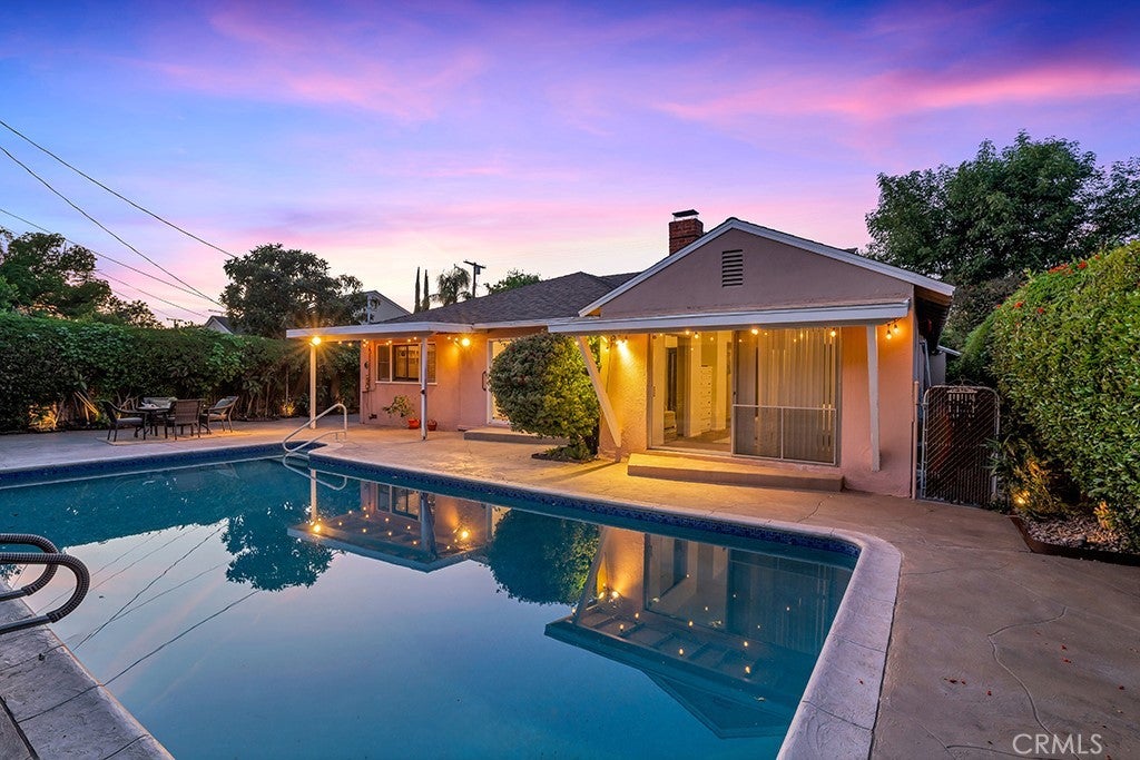 Welcome to 12312 Erwin Street — Valley Glen Living at Its Finest Nestled in the heart of the highly sought-after Valley Glen neighborhood, this stunning 3-bedroom, 3-full-bath ranch-style home makes an unforgettable first impression. A sweeping brick-accented driveway curves gracefully to the front, flanked by vibrant gardens bursting with color, mature trees, and a lush lawn kept green year-round by a built-in sprinkler system. The warm red Dutch door with glass panels is your first hint at the character that waits within. Step inside to a welcoming foyer with rich hardwood floors and a warm gold flush-mount fixture setting an elegant tone. The formal dining room impresses with a statement gold chandelier, gorgeous hardwood floors, and a charming diamond-pane window — designed for special occasions. The charming kitchen features white shaker-style cabinetry, black hardware accents, generous counter space, and a sunny breakfast nook perfect for morning coffee. A dedicated laundry room with utility sink adds everyday practicality. The expansive living room features a classic brick & stone fireplace, track lighting, and a large sliding glass door framing sparkling pool views — a room made for gathering and making memories. The separate den opens directly to the backyard, ideal as a media room, playroom, or casual retreat. The private office boasts stunning custom built-in cabinetry, shelving, and hardwood floors — an inspiring workspace that easily doubles as a 4th bedroom. The primary suite is a true sanctuary with direct sliding glass door access to the pool and backyard. Two additional bedrooms are bright and well-appointed with ceiling fans and ample closet space. Three full bathrooms serve the home with ease. Outside, a sparkling pool, stamped concrete patio, string lights, ground lighting, mature privacy hedging, and a full backyard sprinkler system create a resort-style retreat. A 2-car garage completes this exceptional property. Don't miss this Valley Glen gem — schedule your private tour today!