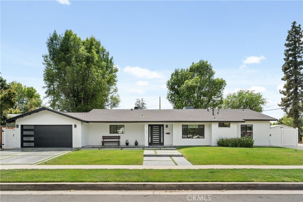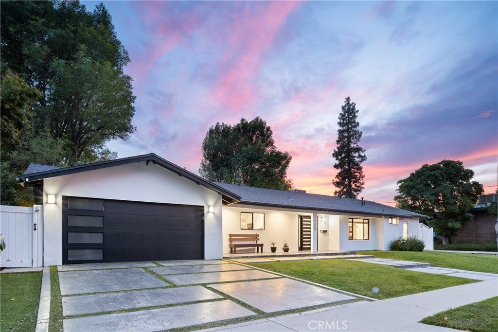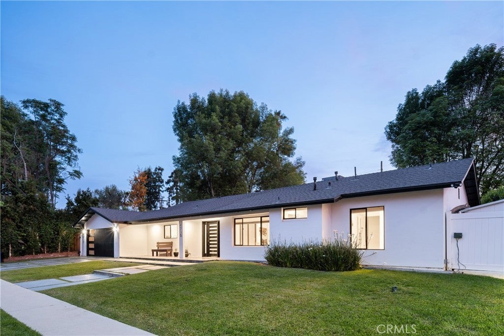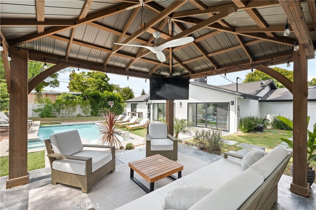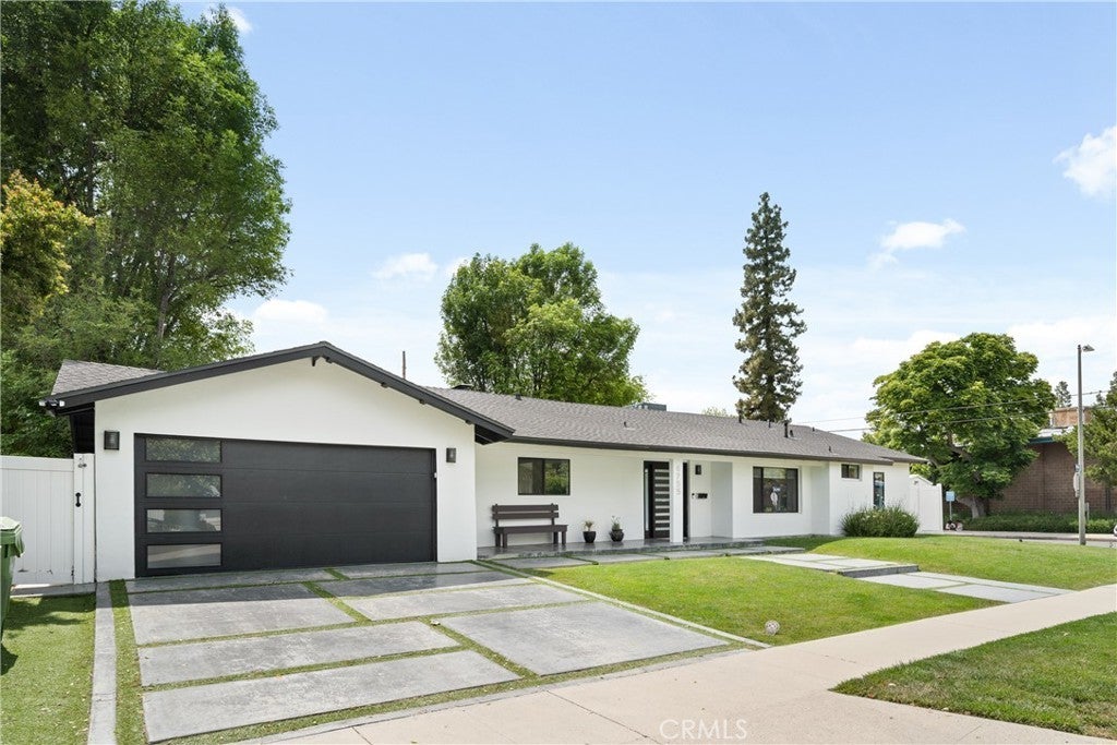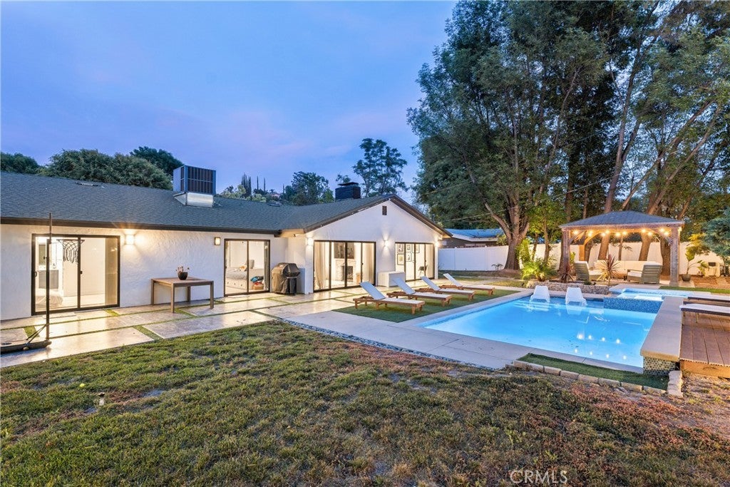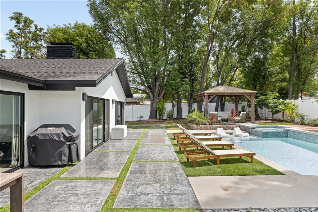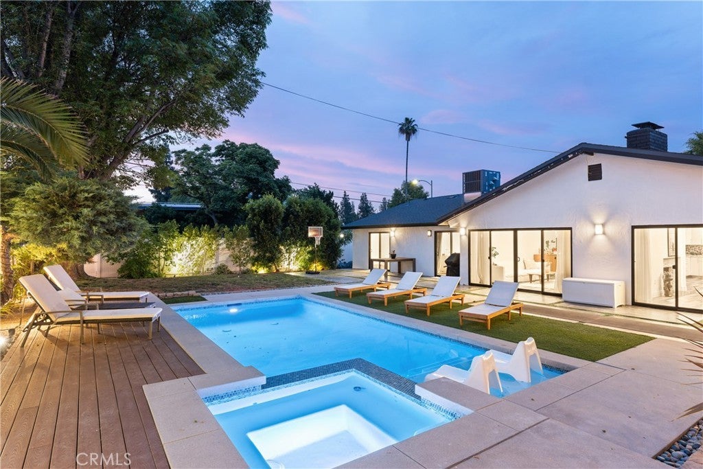 Mid Century Modern, Charles DuBois property, located South of Ventura blvd in a quiet neighborhood. This single story home was meticulously renovated with impeccable taste and great attention to detail. A spacious open floor plan, with plenty of natural light, features 4BR/3BA, living room, dining room, laundry room inside, vaulted ceilings, stunning floors, floor to ceiling double-sided fireplace, recessed lights, Milgard windows and sliders. You will love the gorgeous open kitchen with its wide island, that will be the center of all your parties and gatherings, but also the heart of your home. Custom cabinetry, quartz countertops, Kitchen Aid stainless steel appliances, including 42” built-in refrigerator, 36” built-in range, double oven, built-in microwave, 46-bottle wine cellar. Beautiful primary suite, with views and access to the pool and backyard. Remodeled primary bathroom with double sinks, walk-in shower and freestanding bathtub. Other features include newer roof, newer central air/heat, new electrical panel, newer pool/spa. Relax in this entertainment resort like backyard with a new built sparkling saltwater pool and hot tub. Enjoy this private oasis with elevated deck, lush landscaping and synthetic lawn space, a dream gazebo where you could watch some movies or football games by the fire. The home, nestled away from busy main streets, is situated on a large corner lot by great award winning schools and walking distance to Bristol Farms and Old Town Calabasas. Close to 101 fwy, Topanga Mall and the Village at Topanga, shops, restaurants, parks and hikes. Easy access to Malibu, Calabash, Hale and El Camino Real Charter Academy.