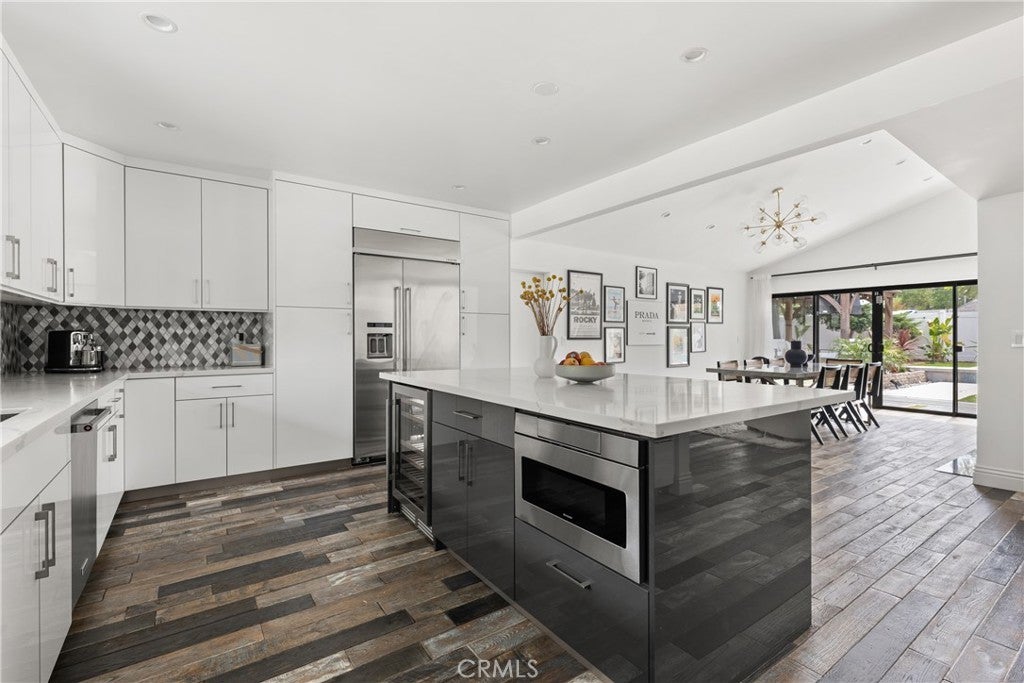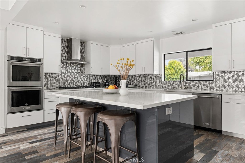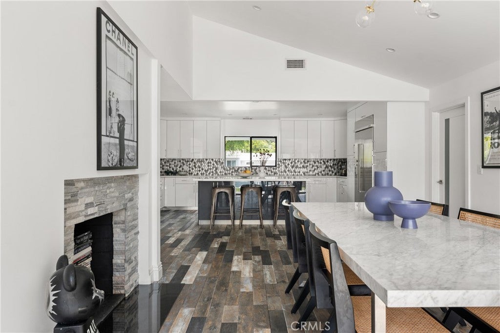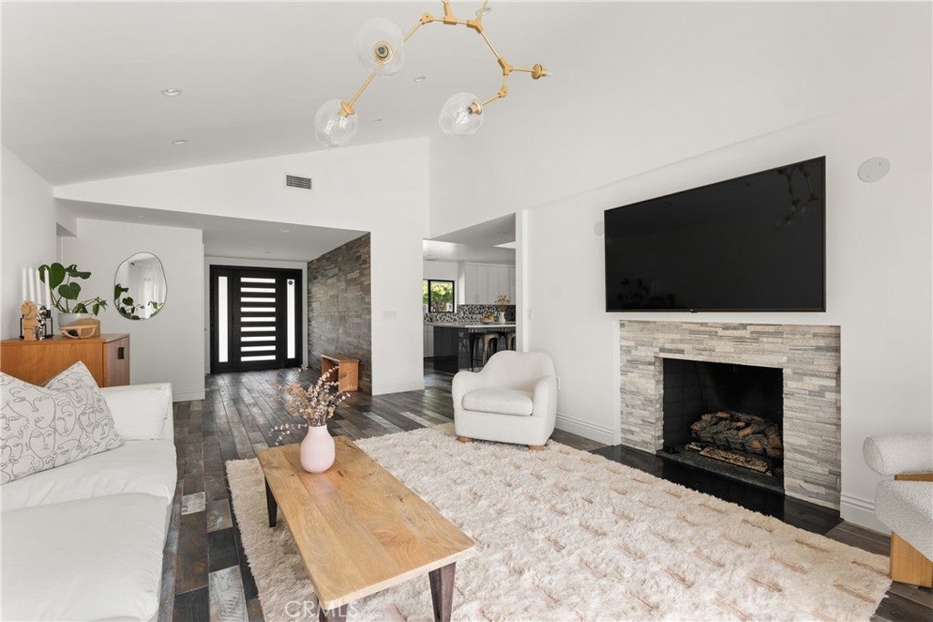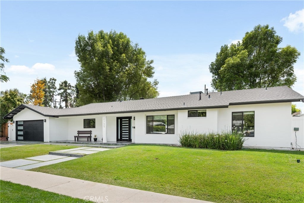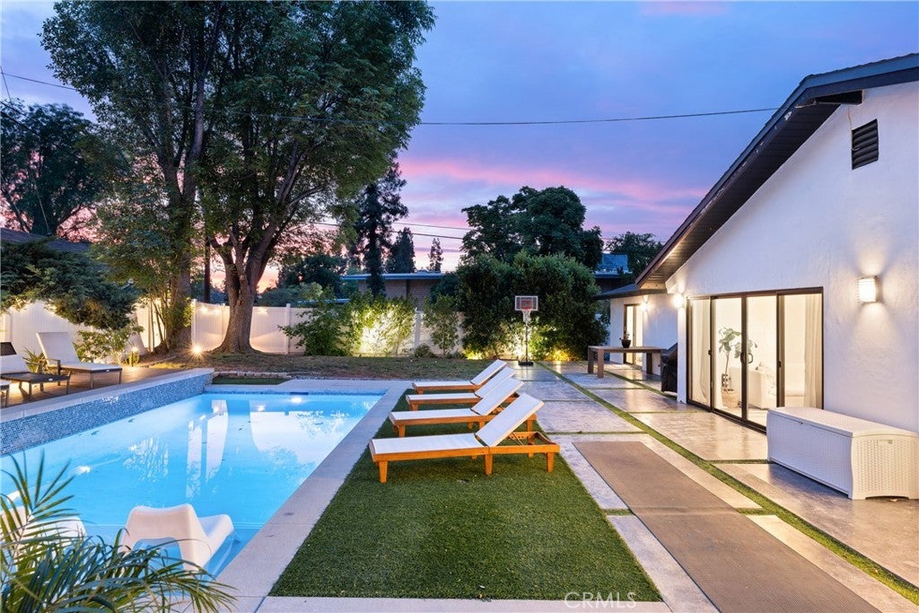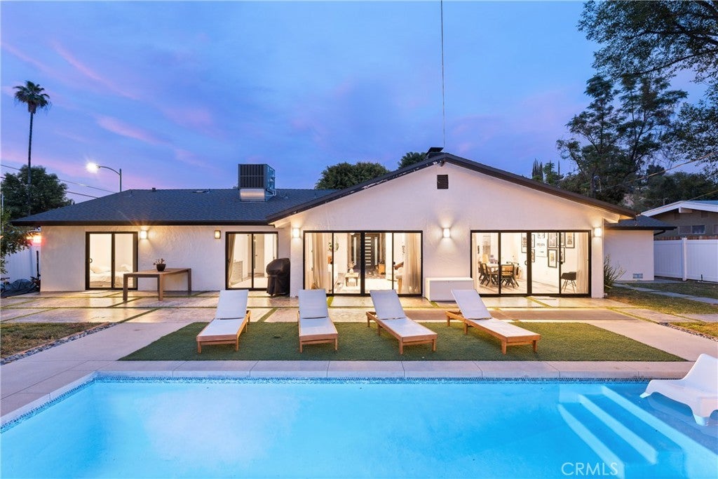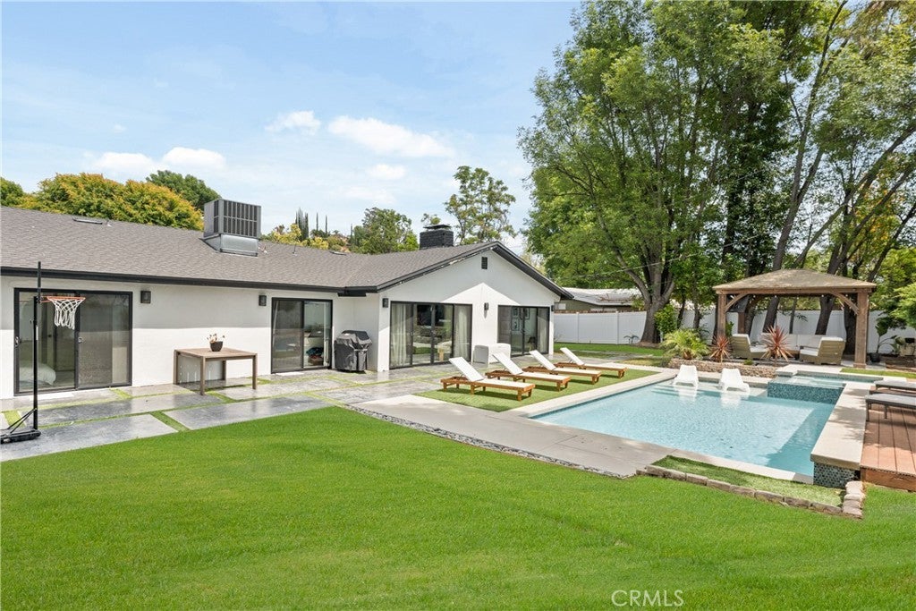 Mid Century Modern, Charles DuBois property, located South of Ventura blvd in a quiet neighborhood. This single story home was meticulously renovated with impeccable taste and great attention to detail. A spacious open floor plan, with plenty of natural light, features 4BR/3BA, living room, dining room, laundry room inside, vaulted ceilings, stunning floors, floor to ceiling double-sided fireplace, recessed lights, Milgard windows and sliders. You will love the gorgeous open kitchen with its wide island, that will be the center of all your parties and gatherings, but also the heart of your home. Custom cabinetry, quartz countertops, Kitchen Aid stainless steel appliances, including 42” built-in refrigerator, 36” built-in range, double oven, built-in microwave, 46-bottle wine cellar. Beautiful primary suite, with views and access to the pool and backyard. Remodeled primary bathroom with double sinks, walk-in shower and freestanding bathtub. Other features include newer roof, newer central air/heat, new electrical panel, newer pool/spa. Relax in this entertainment resort like backyard with a new built sparkling saltwater pool and hot tub. Enjoy this private oasis with elevated deck, lush landscaping and synthetic lawn space, a dream gazebo where you could watch some movies or football games by the fire. The home, nestled away from busy main streets, is situated on a large corner lot by great award winning schools and walking distance to Bristol Farms and Old Town Calabasas. Close to 101 fwy, Topanga Mall and the Village at Topanga, shops, restaurants, parks and hikes. Easy access to Malibu, Calabash, Hale and El Camino Real Charter Academy.