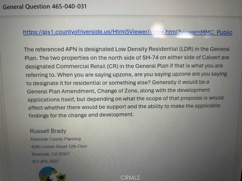 11.47 acre APN#465-040-031 city sewer, city water, electric and gas in calvert , lot touches a commercial lot at corner of 74 and calvert .