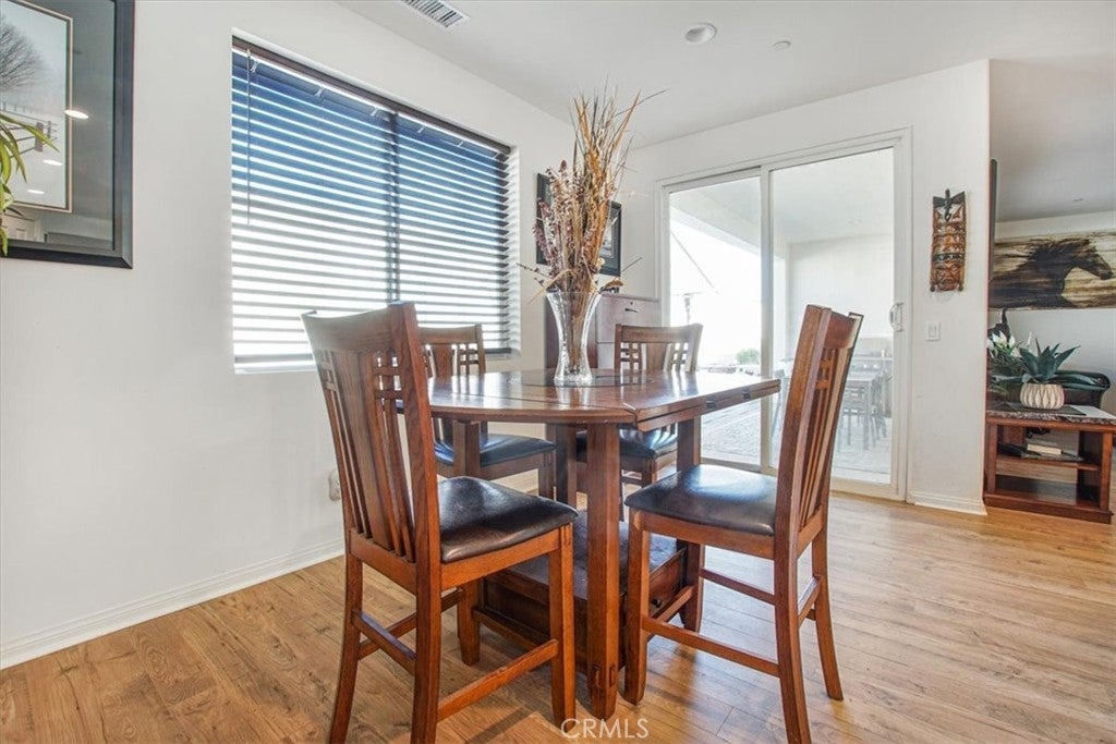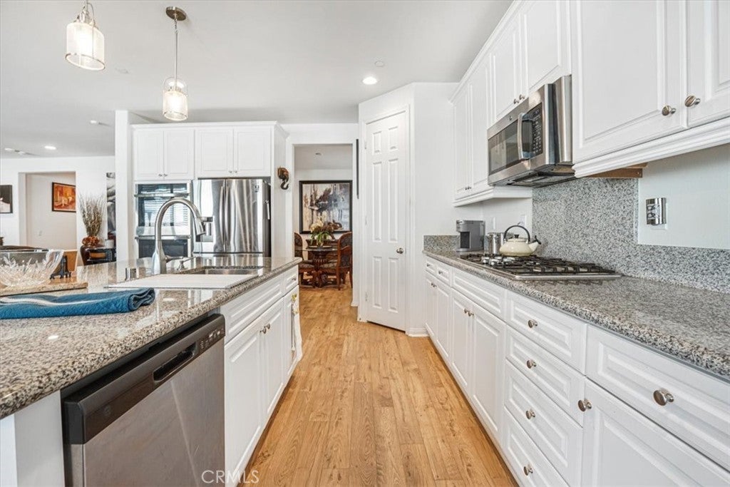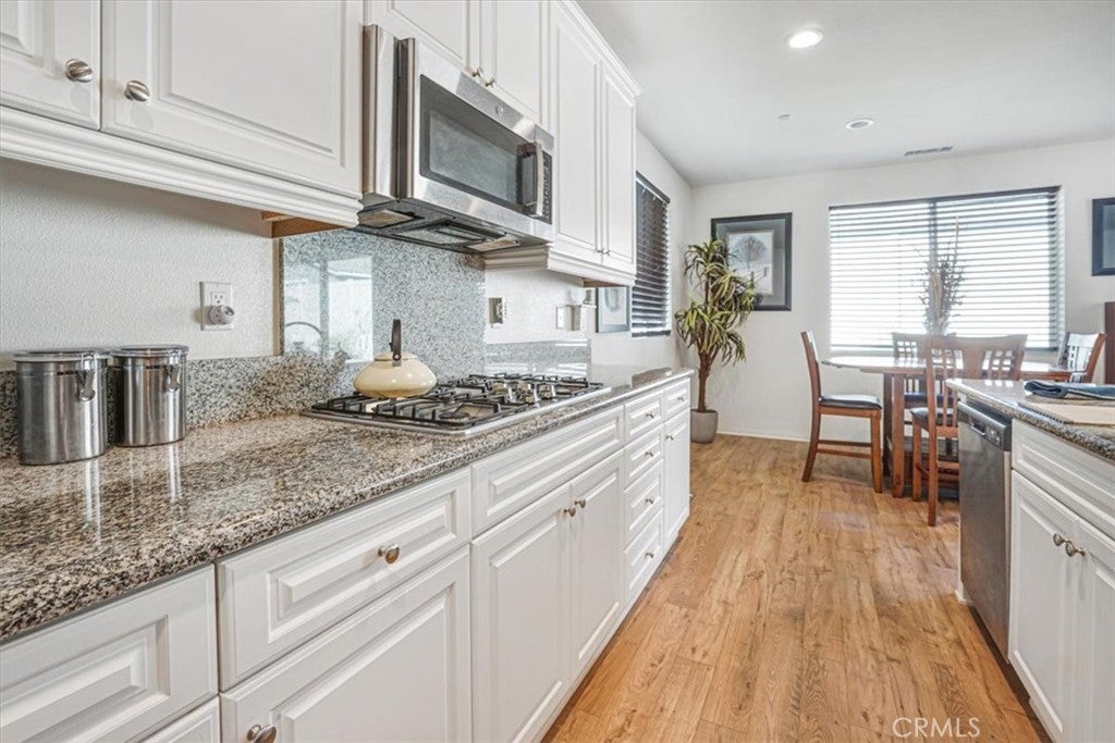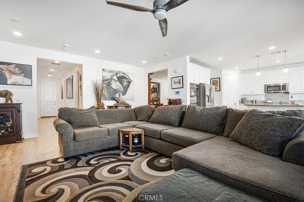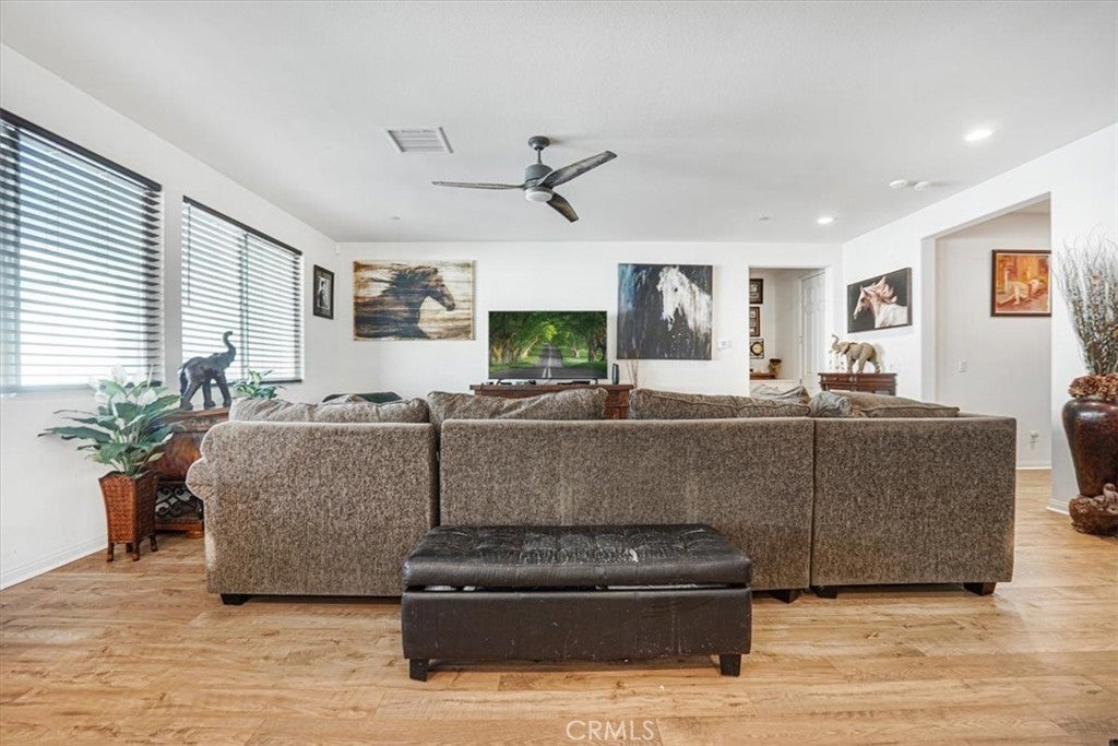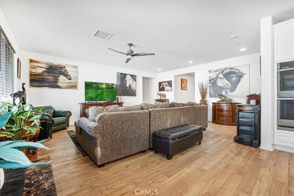LETS GET TO ESCROW! This desirable home has 3 bedrooms and 2 full baths & oversized powder-room with pedistal sink. The long and inviting entryway leads you to a spacious open floor plan, the engineered wood flooring & neutral color carpeting in bedrooms makes this entire space so cozy and comfy! Who doesn't enjoy natural light! The home offers many options that you need to see to appreciate. There are lots of builder upgrades such as the gourmet kitchen with beautiful white cabinetry, a large walk-in pantry, a spacious Island with breakfast bar, butlers pantry, granite countertops, upgraded stainless steel appliances, which include a gas cooktop, double-oven, a microwave and dishwasher! The dining /breakfast area opens to the kitchen and a spacious family room. Ceiling fans in all rooms. Other home amenities are a large master suite with a huge spa-stlye custom shower, an oversized laundry room with tons of storage and utility sink; window blinds throughout, 8' doors, Private back yard with built-in patio area for your family to enjoy, a side yard area for a possible dog run and astro-turf for all the kings and queens of the castle. Low maintenance front and back yards, block walls. There are dog/child walking and bike trails, kid parks nearby, and the beautiful front view of mountains from your front door can't be beat. Make appointment to see TODAY! BEST PART SOLAR IS PAID OFF!