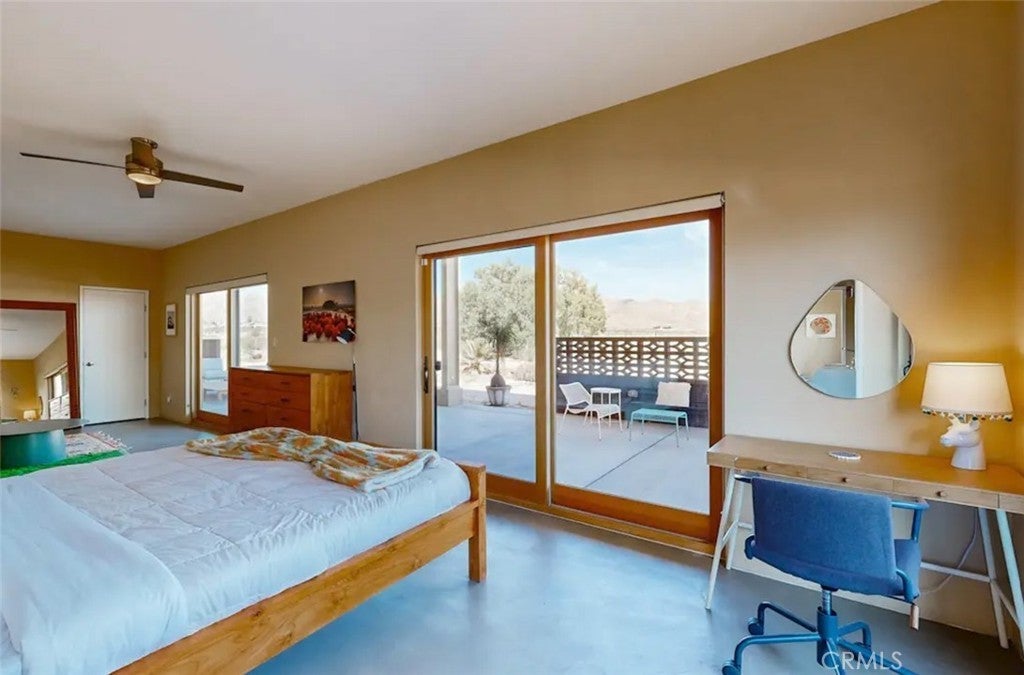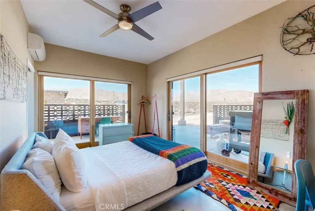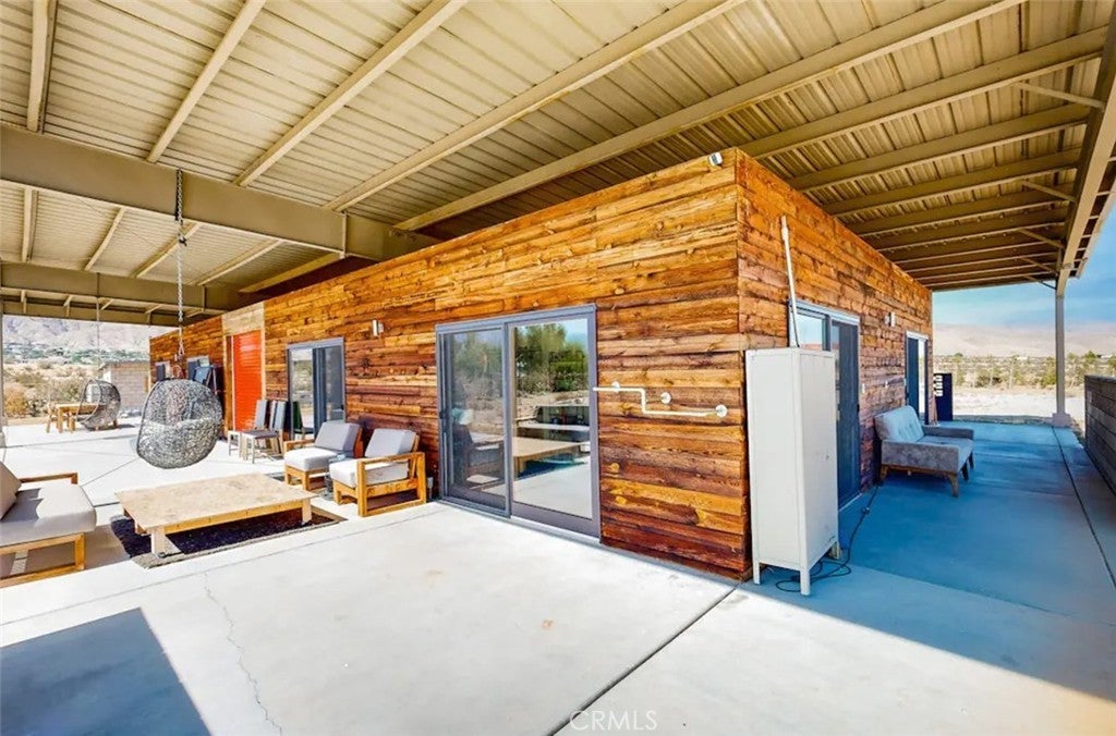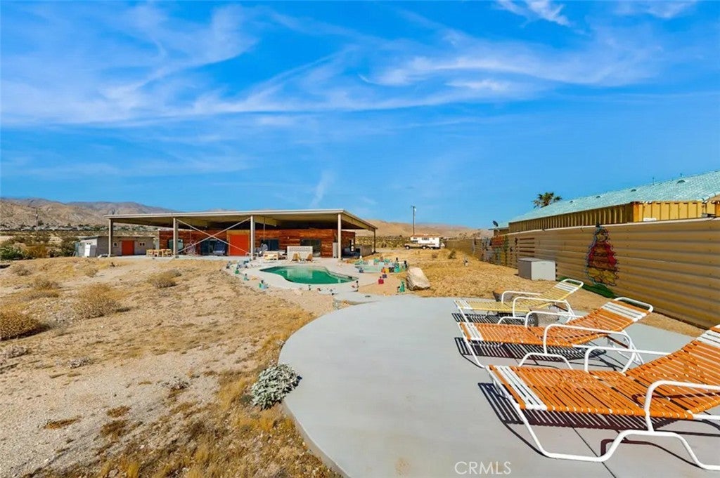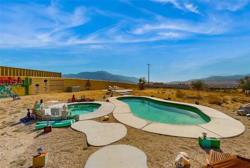 Discover the Elemental Retreat House, a modern home designed by a renowned San Francisco architect and nestled on a 1.25-acre secluded lot located just outside of Desert Hot Springs. This 2000 sq.ft., 3-bedroom, 2 bath home offers tranquility, eco-conscious design and income-generating potential, all just 20 minutes from downtown Palm Springs and a short drive to Coachella. Large double-pane sliding doors positioned, every 8 feet, frame breathtaking 360-degree mountain and desert views. The home is divided into two 1000 sq. ft. wings, connected by a covered central space with pull up door, creating a weather protected indoor/outdoor living area. The main wing houses a guest bedroom with bath, a spacious living room, dining area and fully equipped kitchen. The other wing houses two expansive 450 sq.ft. master suites, featuring 2 sliding doors each that open to spacious covered patios, perfect for morning coffee or stargazing under the desert sky. The innovative double-roof design, with a 5,000-square-foot top roof, shields the home from the desert sun while channeling cooling breezes between the roofs, ensuring comfort even in the hottest months. Wrapped in 18 inches of Styrofoam insulation and clad in elegant cedar, this super-insulated home achieves near-zero energy consumption, complemented by a one-year-old solar system that virtually eliminates electricity costs. The heart of the Elemental Retreat House is its therapeutic mineral water well, delivering odorless, 85°F mineral-rich water year-round. Packed with health-enhancing minerals, this water fills the oversized pool, luxurious jacuzzi, and all showers, transforming your home into a private spa retreat. Additional amenities include a large laundry/storage room with a sink and new water heater, mini split air conditioners for personalized comfort, and smart home features controlling the pool, spa, lighting, and security system via Wi-Fi. Guests on a recognized short term rental site have awarded this property a 5-star rating, praising its wellness-focused amenities and serene ambiance, making it a proven income generator with an active short-term rental permit from Riverside County. Situated on the outskirts of Desert Hot Springs, known as California’s Spa City, this property combines seclusion with proximity to world-class attractions. Enjoy the vibrant arts, dining, and festivals of Palm Springs, or explore nearby Joshua Tree National Park and San Bernardino National Forest.