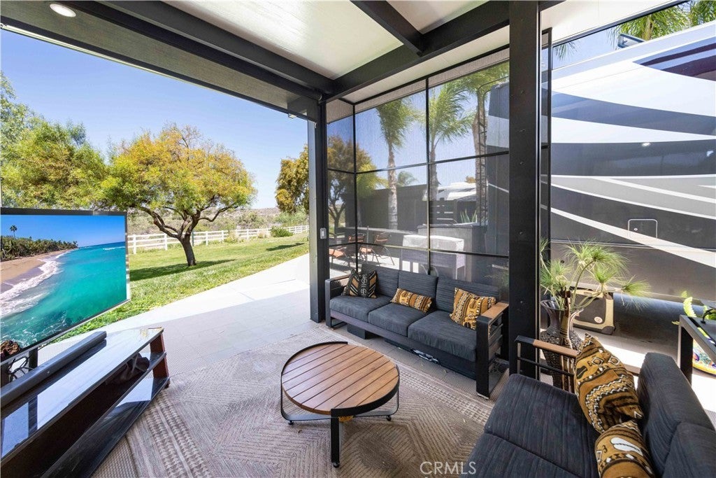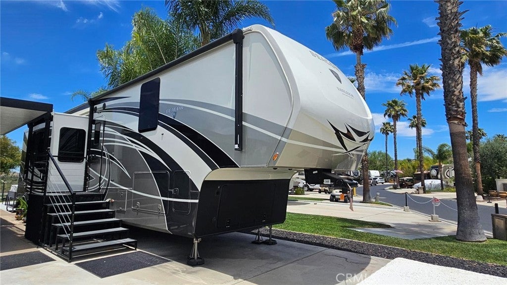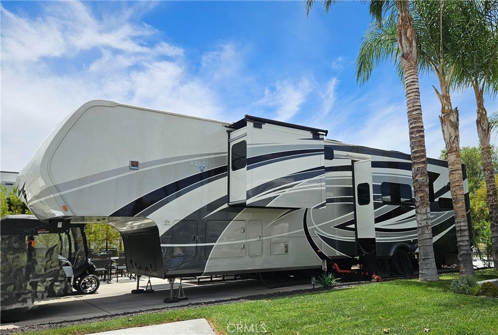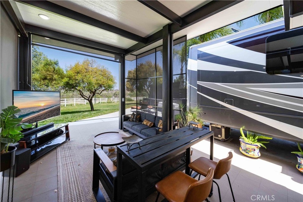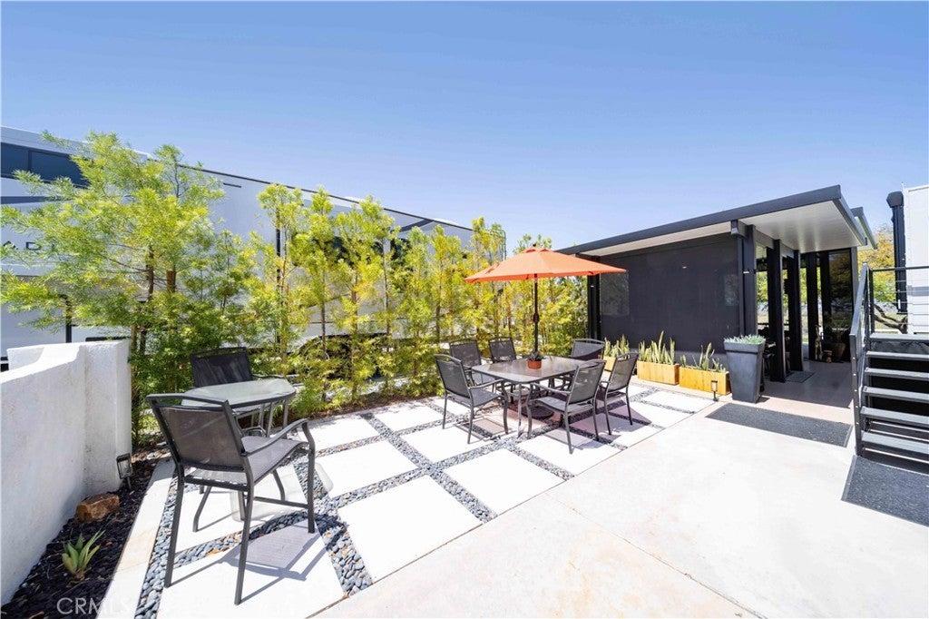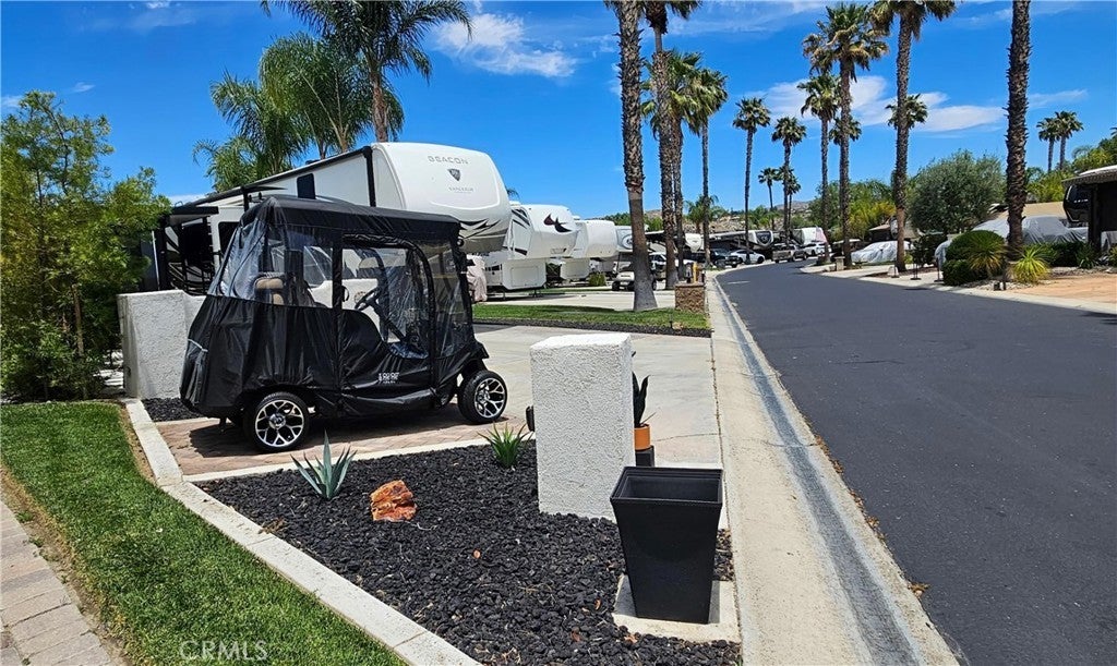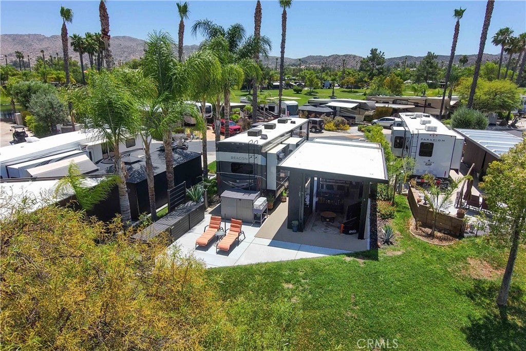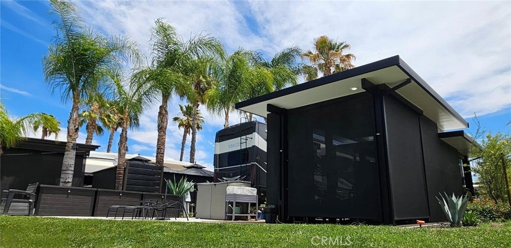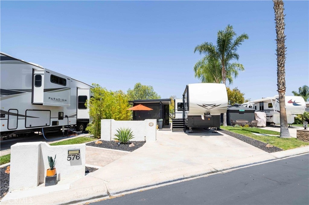 Welcome Lot #576 - "The Safari Lodge", located in the highly sought after, spectacular sunset view section of the RCRVR 500s. This property is a new Black & White Mid-Century Modern style Alumawood buildout, with a layout for entertaining and paved golf cart parking! The patio buildout is a double roof line tilted Mid-Century style with recessed lighting, an upgraded insulated roof, rain gutters, bistro lighting in the BBQ & covered dining area, and ceiling beams in the living room! There is seating for 19-people...this includes 2-dining tables, bar counter & seating, and a counter height bistro table for two! There is also a private area at the rear of the lot with 2-chaise loungers for catching the many sunset views at that Golden Time of Day. This modern and unique lot includes custom planter boxes with drought tolerant plants, a raised floating floor that keeps the stylistically appointed area rugs dry, and custom canvas shades. In the large courtyard area, you will find 30" custom concrete pavers and black Mexican beach pebbles, solar accent lighting, and tall privacy trees lining the side of the courtyard. The property includes plenty of storage, decorative artificial plants, and 2-security cameras with motion, night vision, and app for self-monitoring your lovely property. The sides of "The Safari Lodge" are landscaped in black lava rock and lovely drought tolerant plants. The quiet Bath-house #5, pool, & laundry, only 4 sites down.. Financing Available...