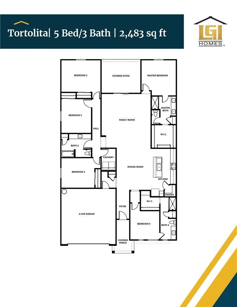 The Tortolita floor plan presents an elegantly designed single-story home that excels in both comfort and functionality. Boasting five generously sized bedrooms, this layout includes a master suite with a dual sink vanity, a step-in shower, and a separate private toilet room for added privacy. One of the additional bedrooms features its own full bathroom, providing a private retreat for guests or family members. The open-concept design of the home seamlessly integrates the kitchen, family room, and dining area, creating an inviting space for both everyday living and entertaining. The kitchen stands out with modern stainless-steel appliances, stylish plank flooring, and a convenient walk-in pantry. A covered porch and patio extend the living space outdoors, perfect for relaxation and social gatherings. A well-appointed mud room enhances the home’s practicality, offering a designated area for managing everyday items and keeping the home organized. Additionally, a dedicated laundry room adds to the overall efficiency and convenience of this thoughtfully designed residence.