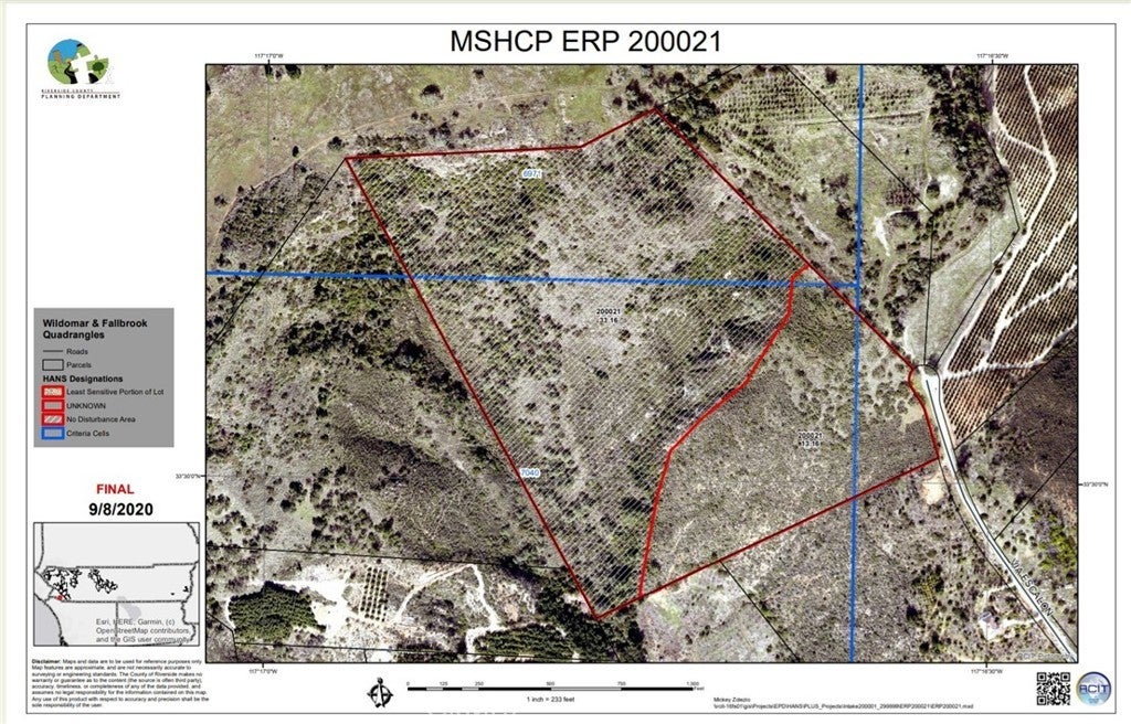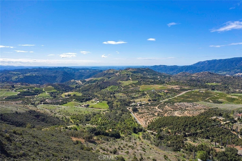 46.45 Acres with Panoramic Views in De Luz Located at the end of a quiet cul-de-sac in the scenic De Luz area, this stunning 46.45-acre parcel offers rare privacy, breathtaking views, and endless potential. Surrounded by citrus groves, the property sits at the northwest end of Via Escalon and enjoys sweeping panoramic vistas—including views of the Pacific Ocean on clear days. The land features a mix of gentle slopes and steeper hills, ideal for a custom estate, retreat, or expanding your own grove. The northern property line borders the Santa Rosa Plateau Ecological Reserve, adding natural beauty and long-term privacy. This property falls within the criteria area established by the Western Riverside County Multiple Species Habitat Conservation Plan (MSHCP); however, the seller has invested significant time and effort to complete the ERP (Equivalent Residential Project) Application for Single-Family Homes. As a result, the property has already been approved for development on 13.16 acres of its least sensitive land—clearing the way to proceed with obtaining a grading permit for the construction of a single-family residence. Water is available at the street, and a fire hydrant is already in place. Buyer to investigate water benefit zone fees and water meter installation costs. Excellent sun exposure makes it ideal for solar energy and pool heating. Just minutes from Temecula and Fallbrook, this is a rare opportunity for peaceful rural living with modern convenience.