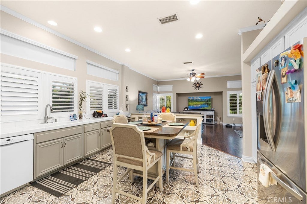 • Interior FeaturesBreakfast Bar, Built-in Features, Ceiling Fan(s), Separate/Formal Dining Room, Eat-in Kitchen, High Ceilings, Open Floorplan, Pantry, Tile Counters, All Bedrooms Down, Bedroom on Main Level, Entrance Foyer, Main Level Primary, Multiple Primary Suites, Primary Suite, Walk-In Closet(s)