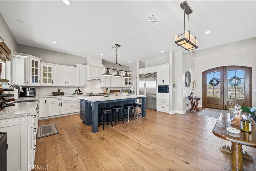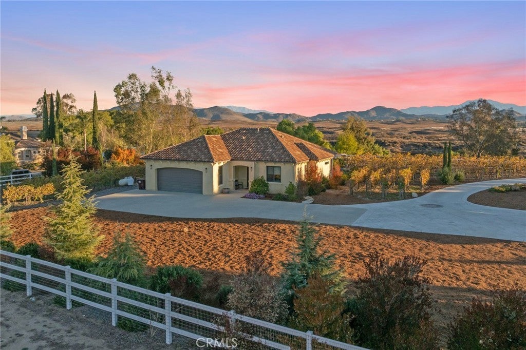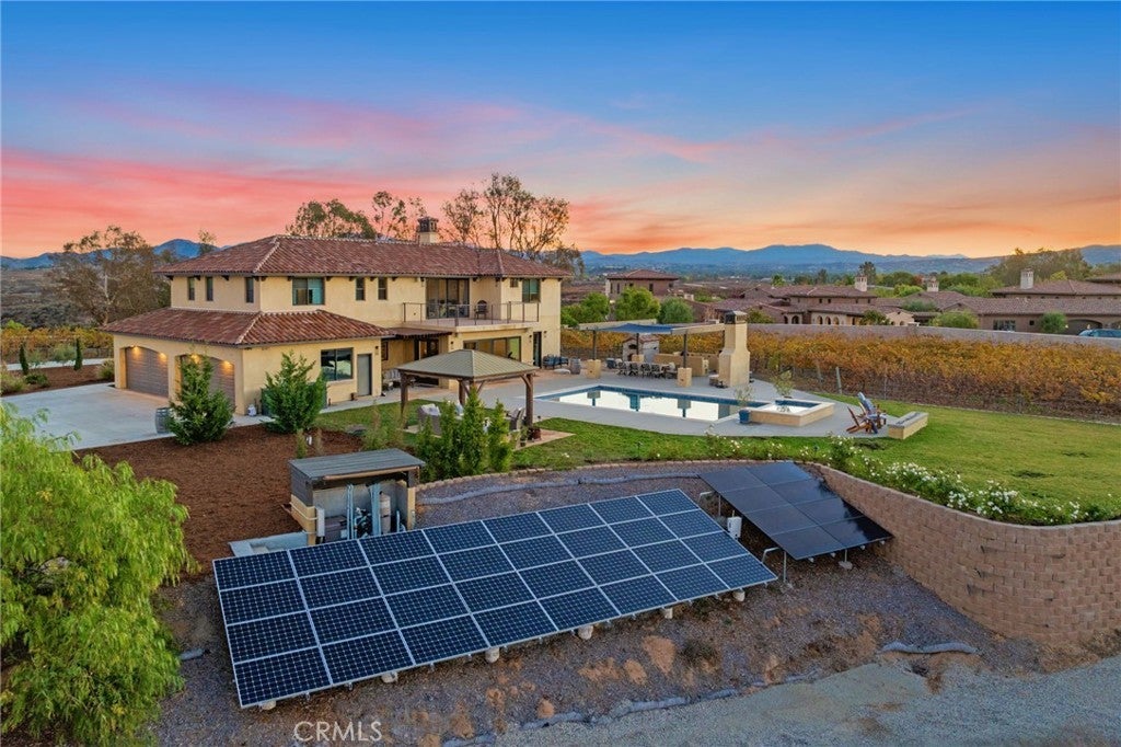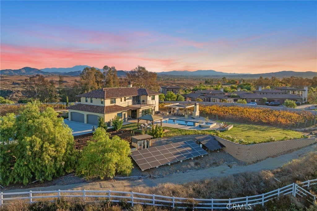 INCOME POTENTIAL! Live in one and rent the other! SMART opportunity to own not ONE but TWO Tuscany inspired homes perched on a hill offering STUNNING views from every angle. Perfectly situated on just over 2 acres these 2 Temecula wine country homes are dripping with old world sophistication. Cul-de-sac location means little to no traffic. The security gate at bottom of the driveway makes for a DRAMATIC ENTRANCE, leading you to up to the estate, passing vineyards and 3-bedroom residence on the right bringing you to the 4-bedroom main residence on your left. Main house offers a brand-new custom pool with smooth pebble tech coating & Lunada bay glass tile complimented by a 10 person spa. Have THE BEST soirée with your own custom wood fired pizza oven, outdoor wood burning fireplace & gas firepit. Step through the custom knotty Alder entry doors and notice the soaring ceilings while taking in the breathtaking valley views through the solarian windows past the pool, spa and firepit. Formal dining room sits in the Solarian window setting perfect for evening entertaining and taking in the valley lights. Just off the GREAT room adorned with a fireplace, you’ll find a spa inspired junior suite with a full bath opposite the office and downstairs powder room. Kitchen features high end appliances & finishes offering side-by-side Subzero fridge, Wolf range oven, 2 Bosch dishwashers, Wolf microwave, Kohler faucet, Cambria Ella quartz island counter w/contrasting quartz counter, & handmade Spanish Subway tile backsplash. Upstairs, a secondary private family room, separating the generous Primary Bedroom & Bath from 2 additional Bedrooms and Baths. Just off the family room, an OVERSIZED balcony w/ INCREDIBLE VIEWS overlooking the tranquil vineyard. Flooring upgrades include Colonial Collection European oil finish Oak, Custom American Oak stair treads & a combination of Quartz, Marble & Granite throughout. In addition, custom wood cabinetry, solid core interior doors, Dual System high efficiency AC units, whole house attic fan, Santa Barbara smooth stucco, Gas burning fireplace w/flagstone facade w/ custom live edge oak marble, authentic clay roofing, and sound system. 2ND home offers 3 beds/3 baths~situated offering sweeping views of San Jac mountains w/Stainless Steel appliances, Quartz counters, & fire pit. Drip irrigation means annual water bill <than 1700.00 for both homes. 40 owned Solar covers most if not all usage. FIRE SPRINKLERS AT BOTH HOMES. LOW MAINTENANCE!