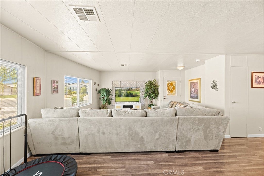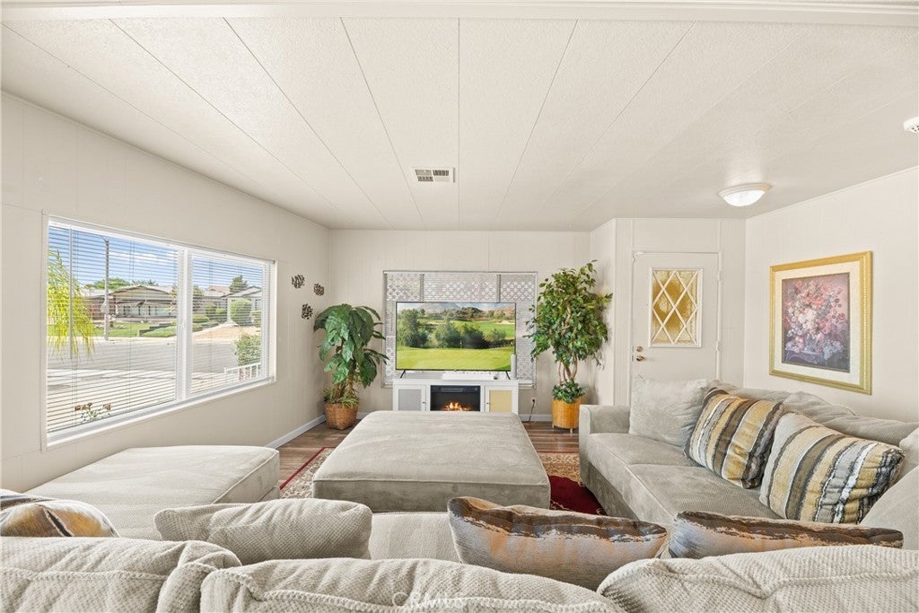 Beautiful corner lot home in a senior golf community with low HOA and county taxes access your home through the front or back! This home is a 3 bed, 2 bath with an office space! This home is on permanent foundation with a 433C. The layout includes a private third bedroom with a kitchenette behind the garage—perfect for a caregiver, guest, or multigenerational living. Beautiful updated kitchen with plenty of space that features a pot-filler above the stove for added convenience. Brand new roof, new flooring & paint. Enclosed porch opens with sliding doors to the family room & office space, offering extra living space and natural light. Master bedroom includes added closet space. Large, private patio overlooks a lush garden with a variety of fruit trees—ideal for relaxing or entertaining. A rare and flexible floor plan in a peaceful, amenity-filled community!