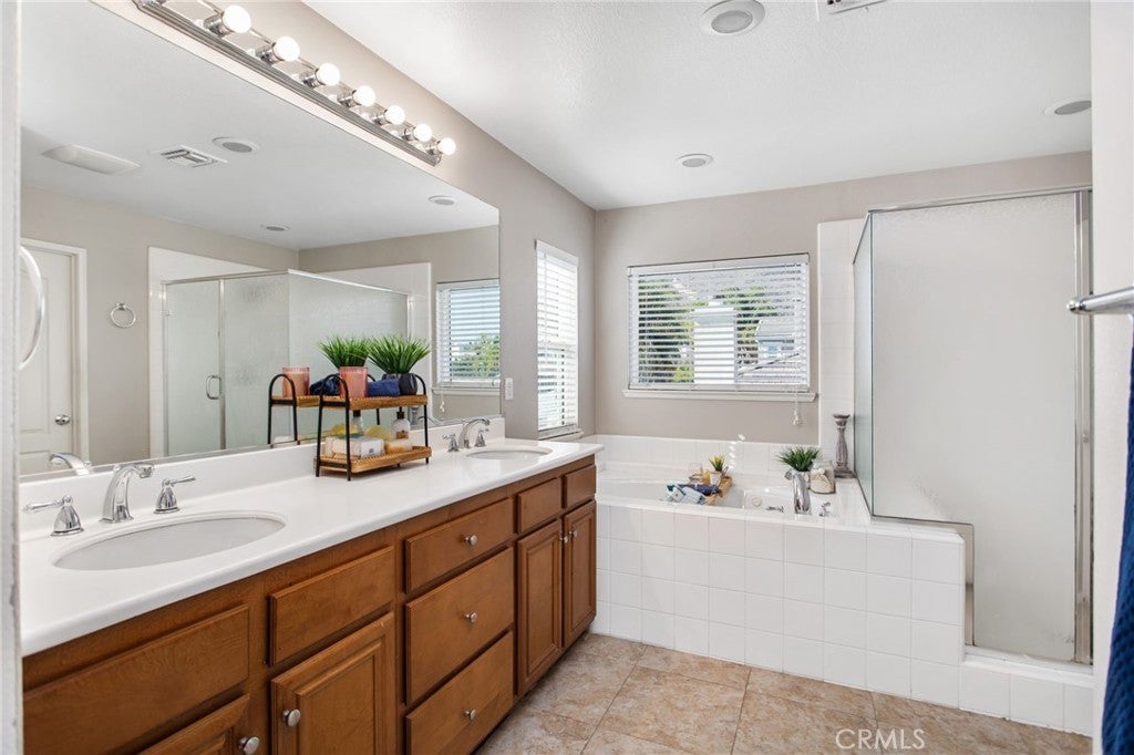Located in the highly sought-after Heritage Lake community, this beautifully maintained 4-bedroom, 2.5-bathroom home offers over 2,400 square feet of spacious living on a desirable corner lot in Menifee. From the moment you arrive, you'll appreciate the curb appeal, expansive front yard, and the natural light that pours into every room. The flexible floor plan features multiple living areas and a generous kitchen perfect for hosting family and friends. All bedrooms are upstairs, including a spacious primary suite with dual sinks, a soaking tub, and a walk-in closet. Step into the backyard to find freshly laid sod and a covered alumawood patio, ready to be transformed into your own private outdoor retreat. Whether it's summer barbecues or quiet evenings under the stars, this space is made for enjoying Southern California living. Heritage Lake offers residents access to scenic walking trails, parks, a clubhouse, and a private lake. With shopping, schools, and freeway access just minutes away, this home offers the perfect blend of community, comfort, and convenience.