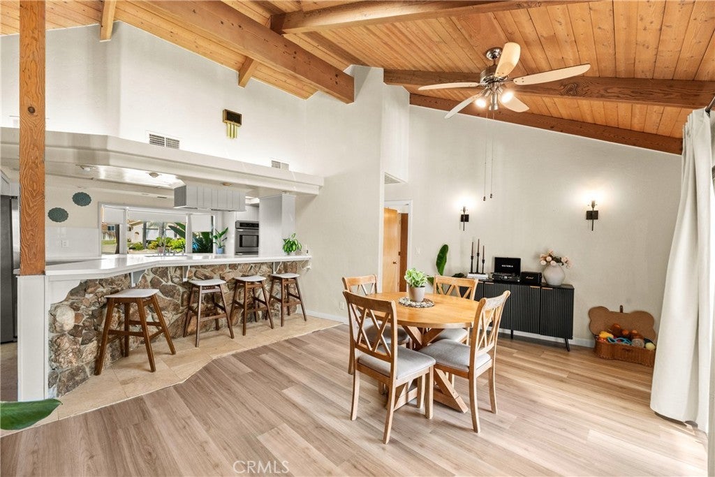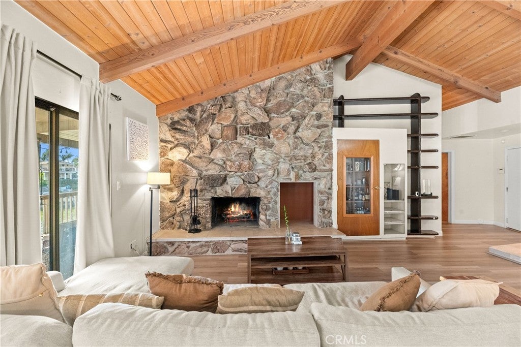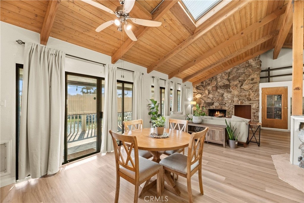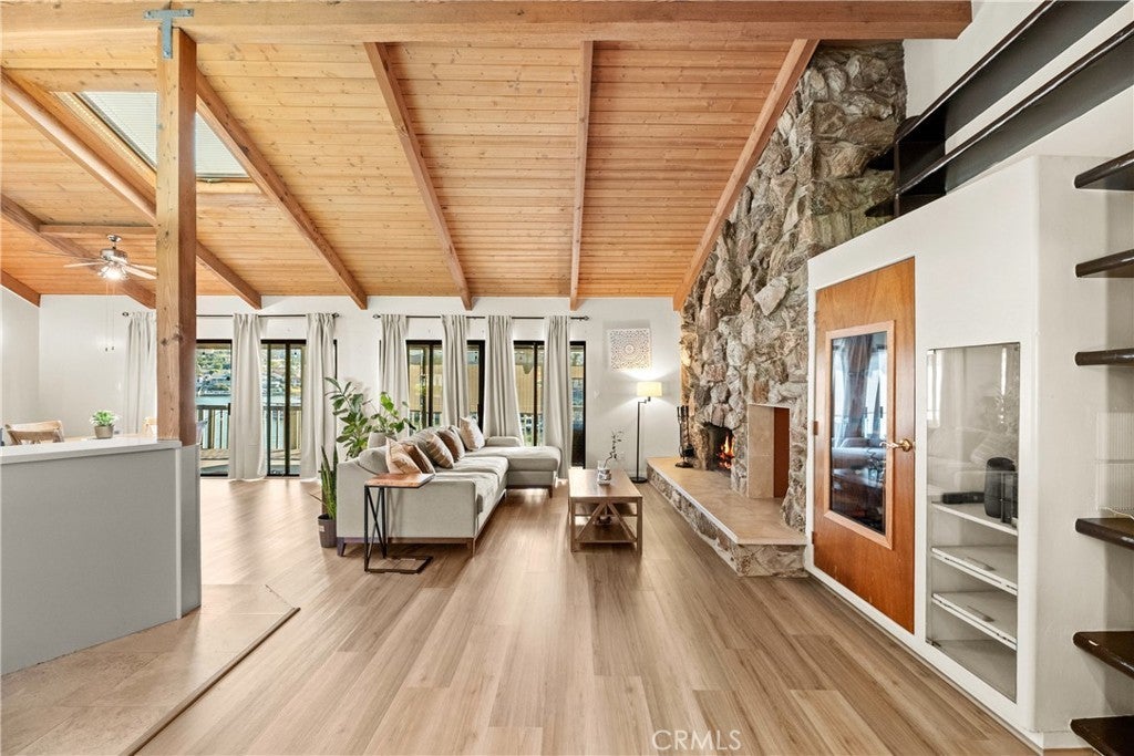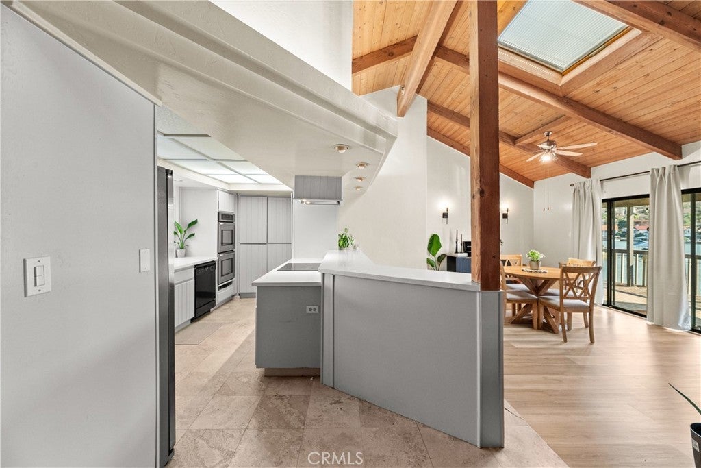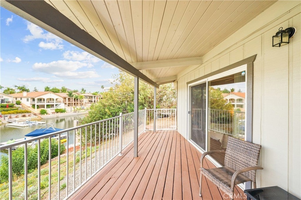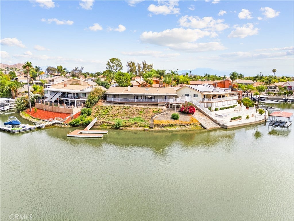 PRIVE IMPROVEMENT - Enjoy true waterfront living in this rare 3-bedroom, 2-bath home situated on a generous pie shaped lot at the end of a quiet cul-de-sac. This single-story gem boasts a private boat dock and a spacious wrap around deck overlooking the water perfect for relaxing mornings and stunning sunsets. Inside, soaring vaulted wood-beam ceilings and a skylight create an open, airy feel. Floor-to-ceiling glass sliders flood the living space with natural light and provide seamless access to the deck and lake views. A dramatic stone fireplace anchors the great room, creating a cozy focal point. The kitchen is designed for entertaining and daily living alike, featuring stainless steel double ovens, a cooktop facing the living area, a large breakfast bar peninsula, and a pantry with pull-out shelving. Charming details like a garden window over the sink and stone accented breakfast bar add character. The master suite is a lakeside retreat with vaulted ceilings, a ceiling fan, and private deck access. Its en-suite bath includes a soaking tub, separate walk-in shower, dual sinks, and ample storage. Two additional bedrooms also offer vaulted ceilings and ceiling fans, with one providing private deck access and a walk-in closet. Step outside to your private boat dock and a terraced backyard stretching to the shoreline, perfect for water activities or creating a resort-like outdoor space. The attached 2-car garage and extended driveway provide ample parking for vehicles and guests. Living in Canyon Lake means access to resort-style amenities like a private lake for boating, fishing, swimming, an 18-hole golf course, tennis and pickleball courts, Olympic-sized pool, parks, playgrounds, and a vibrant social community. The home’s location near the East Gate offers quick access and nearby community features such as the dog park and sports courts. 30199 Windward Drive is more than a home it’s a lifestyle. Don’t miss this rare opportunity to own a waterfront oasis in one of Southern California’s most sought-after gated communities.