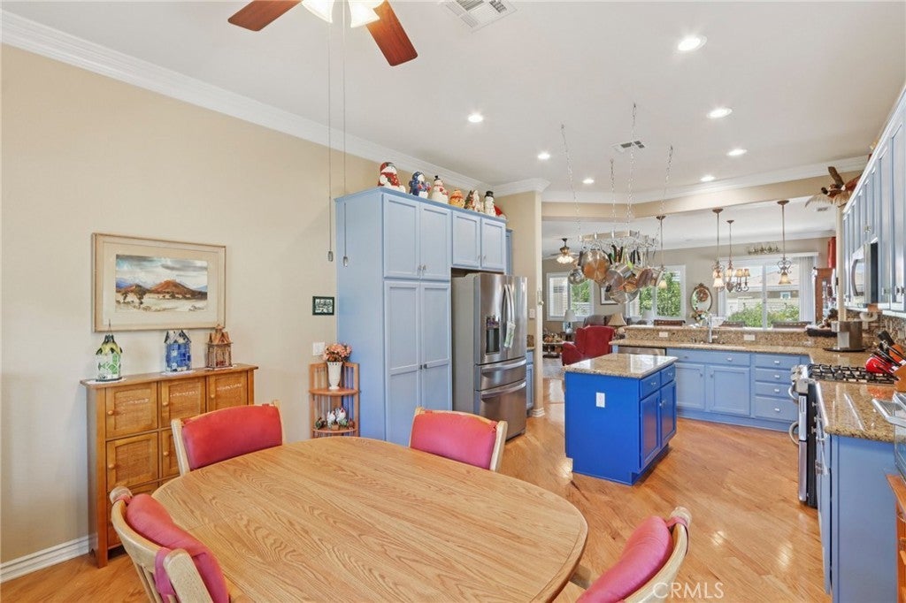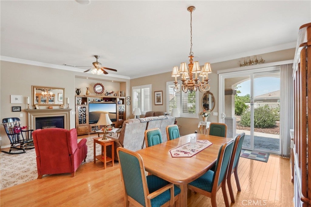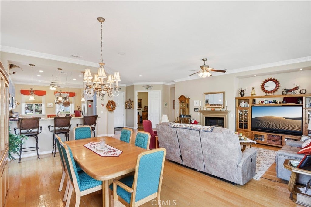 Location, location, location! Tucked away on a quiet cul-de-sac lot, this stunning home in the highly sought-after Solera Diamond Valley by Del Webb offers comfort, style, and community living at its finest. From the moment you arrive, you’ll love the drought-tolerant artificial turf front landscaping and the beautiful iron gate framing a welcoming front porch—perfect for your morning coffee or sunset chats. Step inside to a bright and inviting open-concept floor plan, where the kitchen flows seamlessly into the dining with cozy fireplace and living areas. The kitchen is a chef’s delight with granite countertops, a center island with breakfast nook, tile backsplash, stainless steel appliances (refrigerator conveys!), pots and pans rack, and loads of cabinet storage. The living room is complete with plantation shutters, while crown molding, upgraded fixtures, and ceiling fans add a touch of elegance throughout. This home features 2 bedrooms, 2 full baths, plus a den/office—ideal for hobbies, work, or guests. The primary suite is exceptionally large, with a spa-like bath boasting both a bathtub and step-in shower. Guests will appreciate the upgraded bathroom with its step-in shower as well. The laundry room is thoughtfully designed with a sink, cabinets, washer, and dryer all included. Out back, discover your premium retreat—a true entertainer’s dream! The yard showcases a California-style patio cover, stamped concrete, professional landscaping, a tranquil fountain, small pergola, and a handy shed. With wood floors and all the right upgrades, this home is ready to impress.