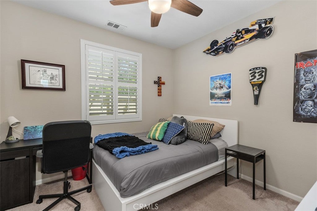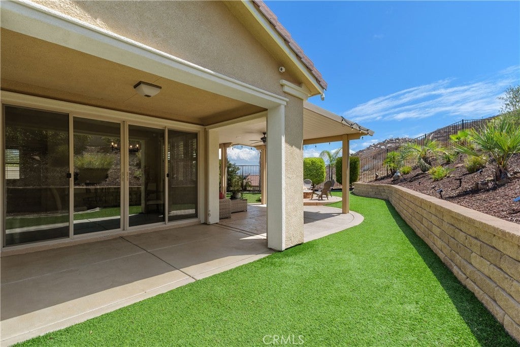 This stunning single-story home, built in 2015, is located in the highly sought-after Canyon Hills Community. Located on a large corner lot with beautiful mountain views. With soaring 12-foot ceilings and an open-concept design, the spacious kitchen features elegant granite countertops and seamlessly flows into the family and dining rooms, perfect for both daily living and entertaining. The versatile attic/bonus room offers extra space for recreation or relaxation. Throughout the home, you'll find beautiful double-pane windows with custom shutters and gorgeous wood flooring. Outside, the low-maintenance yard is designed for easy enjoyment, featuring a 4-panel sliding glass door that leads to a covered patio with outdoor fans and a cozy gas firepit – ideal for hosting gatherings or unwinding in the evenings.