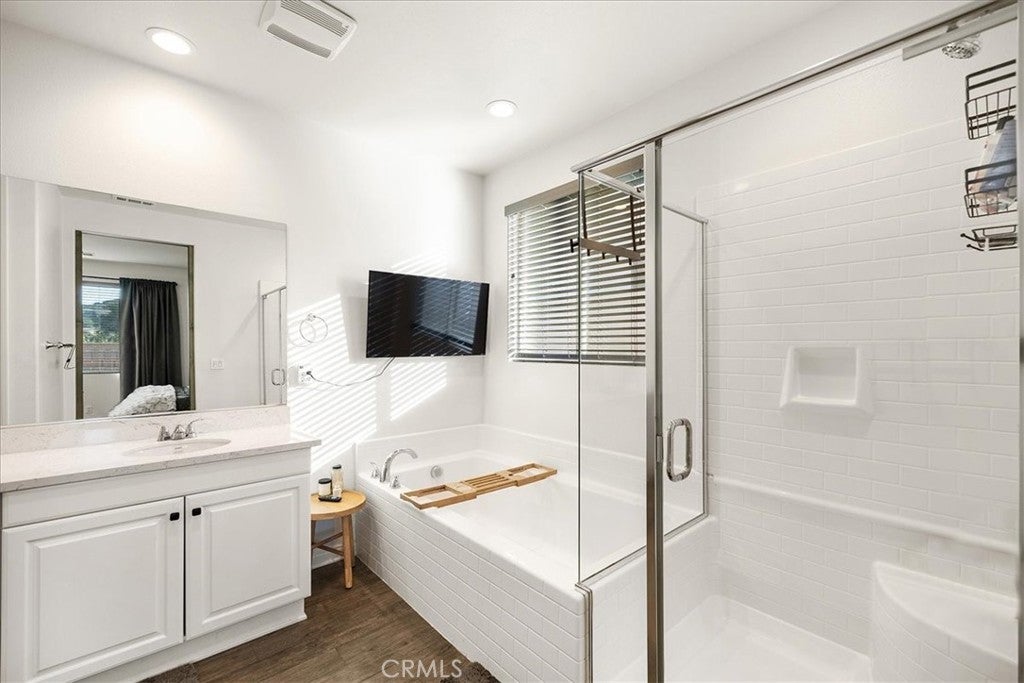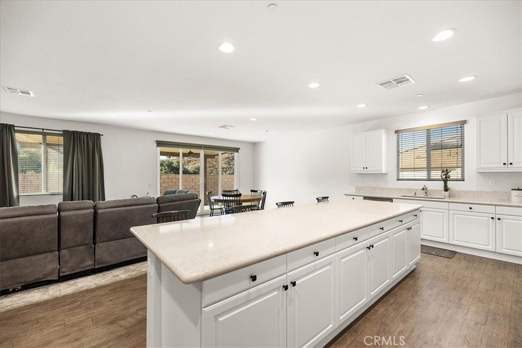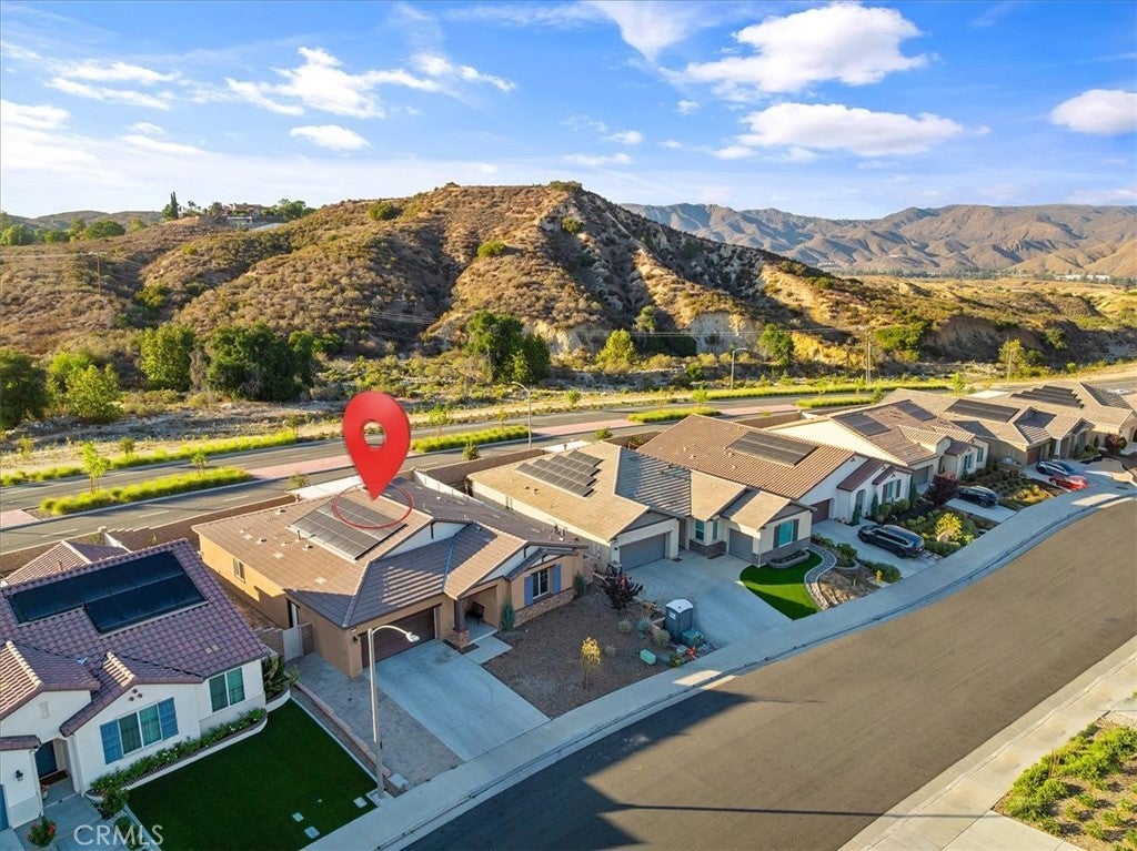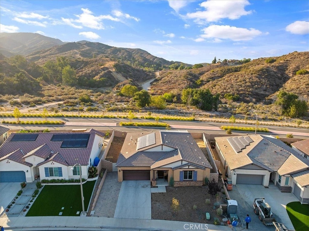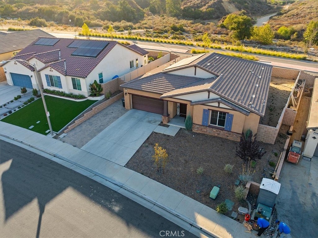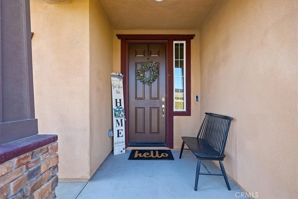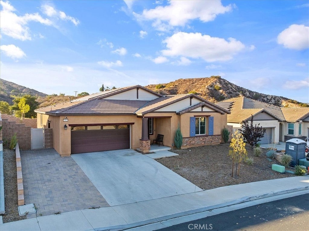 Welcome to this stunning Single-Story residence offering 2,514 sq. ft. of thoughtfully designed living space with 4 Bedrooms, 3 Bathrooms, perfectly blending functionality and luxury. With no neighbors behind and stunning views of the local mountains, this home has a peaceful feeling. Three of the Bedrooms are located in the front of the home, two of which are connected by a Jack and Jill bathroom, and one with its own hallway bathroom providing comfort for family or guests. The Primary Bedroom Suite is tucked away at the back of the home offering added privacy. The Primary suite feels like a peaceful retreat with a custom barn door leading into a spa-like bathroom featuring dual sinks, a walk-in shower, an oversized soaking tub, separate toilet room, and a spacious walk-in closet with custom shoe shelving. The heart of the home is the Gourmet Kitchen boasting white cabinetry, Carrera marble countertops, an extended center island/countertop, stainless steel appliances, a 36-inch commercial range top, and a professional-grade stainless steel sink. It is OPEN to the Family Room and Dining Area and promotes family gatherings and entertaining. There is a Good size walk-in Pantry for food storage. Practical upgrades include a three-car Tandem Garage equipped with a tankless water heater, 240V EV charging station and two 1,500-lb overhead storage racks. The laundry room is indoors, and comes with built-in shelving. PAID OFF SOLAR through SunRun and NO HOA are MAJOR added benefits! The Whole house fan helps cool off the home quickly and efficiently during the warmer months. There is ample room for all your "toys" as this property features an extended driveway with vehicle-rated pavers designed for vehicle or boat parking at the Front Left side of the home. Enjoy California outdoor living with an extended concrete patio, alumawood patio cover, and ceiling fans with lights. Use your imagination to design the rest of the Back yard to your own desires. This home checks every box with its combination of modern elegance, thoughtful upgrades, Paid Off Solar and No HOA.