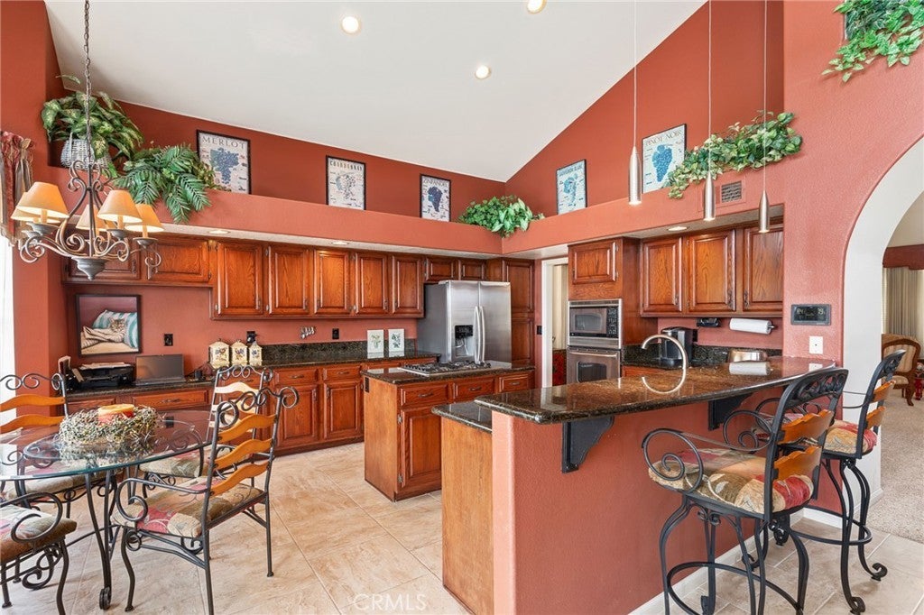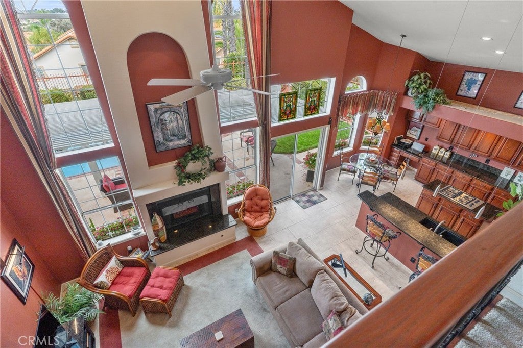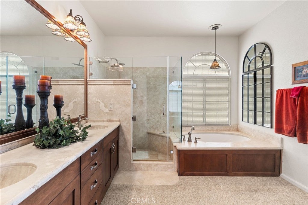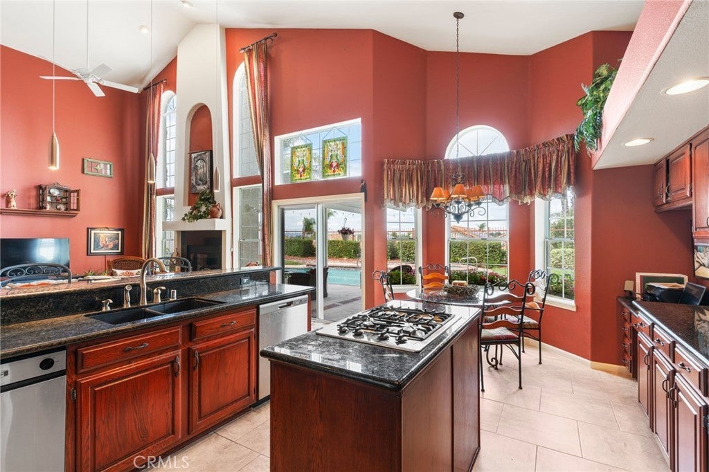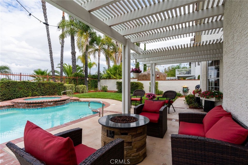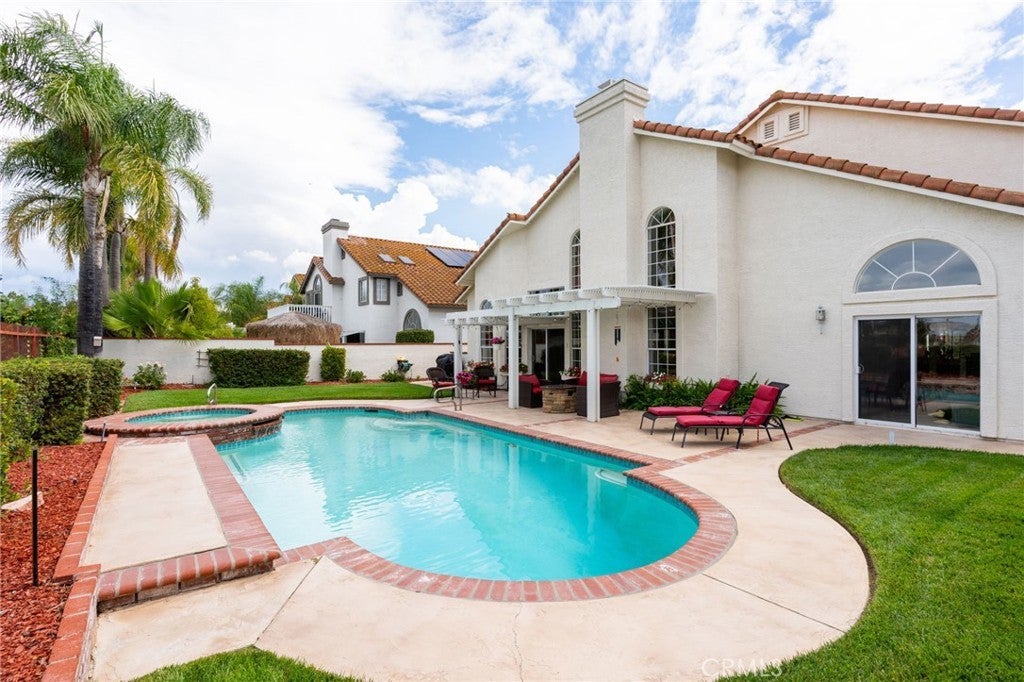 Beautifully maintained home offering spacious living areas, refined architectural details, and a true resort-style backyard. The main level features multiple living and dining spaces, high ceilings, archways, and abundant natural light. The well-appointed kitchen includes rich wood cabinetry, granite countertops, stainless steel appliances, double ovens, a gas cooktop, large prep island, and an extended breakfast bar that opens to the family room with fireplace. Upstairs you’ll find generously sized bedrooms, including a large primary suite with a soaking tub, walk-in shower, dual sinks, and an expansive vanity area. Additional bedrooms offer comfortable layouts and plenty of natural light. The home also features a spacious laundry room and well-designed storage throughout. The backyard is an entertainer’s dream with a sparkling pool, elevated spa, mature landscaping, covered patio, and multiple seating areas for outdoor dining and relaxation. This property offers excellent indoor-outdoor flow and is ideal for gatherings or quiet evenings at home. A wonderful opportunity to own a beautifully cared-for residence with standout curb appeal, quality finishes, and an inviting atmosphere in every room.
