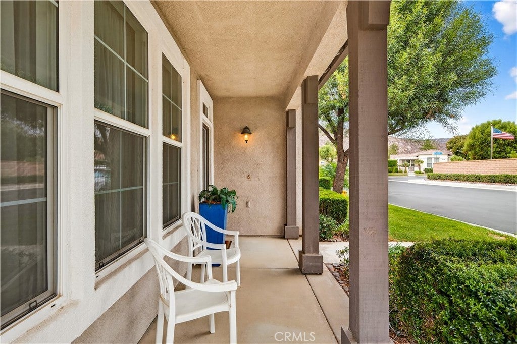 Charming home located in the 55+ fully gated, 24/7 Four Seasons community, surrounded by scenic hills and the Hemet Golf Course. Ideally situated close to the lodge and all its resort style amenities. This two bedroom, two bath home also features an office/den/craft room and boasts a spacious open floor plan with carpet and wood flooring throughout. The bright, white kitchen offers an island with bar seating, white appliances, and ample cabinet space. A wall of windows fills the living areas with natural light, while French doors open to a beautifully landscaped, covered patio, perfect for relaxing or entertaining. Additional highlights include a large masted bedroom with attached bathroom, an inside laundry room and a roomy 2-car garage. Enjoy a vibrant lifestyle with endless activities for the active senior, including tennis, pickleball, swimming pool, and spa. The community also features a beauty salon, fitness center, and a lodge offering a bistro, movie theater, computer room, craft room, billiards, ballroom, and so much more