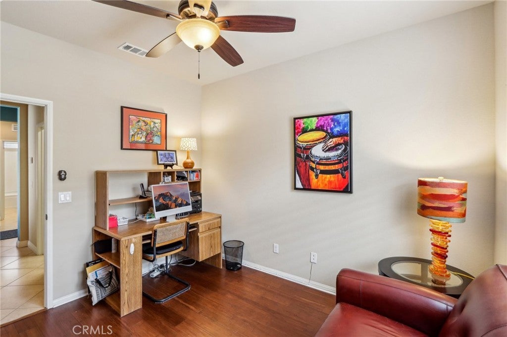 Welcome to resort-style living in the highly sought-after 55+ Solera Diamond Valley Community by Del Webb! This meticulously upgraded 2-bedroom, 2-bathroom home with a den/office offers 1,734 square feet of stylish and functional living space designed for comfort and elegance. From the moment you arrive, the exceptional curb appeal is evident with top-of-the-line drought-tolerant landscaping and a river rock bed creating a stunning, low-maintenance front yard. The beauty continues in the backyard with equally impressive water-wise landscaping—your private outdoor oasis. Inside, you’ll be impressed by the tile flooring laid diagonally at a 45-degree angle, elevating the home’s custom feel. The open-concept kitchen is a true showstopper, featuring an upgraded stainless steel appliance package, a built-in range, a walk-in pantry, designer tile backsplash, a huge center island, and sleek upgraded fixtures. Whether you’re hosting or enjoying a quiet night in, the layout flows beautifully into the living and dining areas. A gorgeous sunroom adds extra living space and includes a cozy fireplace, perfect for year-round relaxation. The spacious primary suite serves as a serene retreat, complete with a generous walk-in closet, a luxurious bath, dual sinks, and a step-in shower. The guest bedroom and second full bath are perfect for visitors or multi-purpose use. Need a home office or hobby room? The dedicated den/office offers flexible space to meet your needs. A well-appointed laundry room with extra storage keeps everything organized, and the garage includes built-in cabinets for even more storage solutions. The community amenities are second to none, offering something for everyone. Stay active in the state-of-the-art fitness center with a walking track, or enjoy socializing in the library, billiard room, or theater room. Two outdoor pools, an indoor pool, bocce ball, tennis, and pickleball courts provide endless opportunities for recreation. With a busy calendar of daily, monthly, and annual events, this vibrant community is the perfect place to enjoy your next chapter. Don’t miss out on this incredible home and lifestyle!