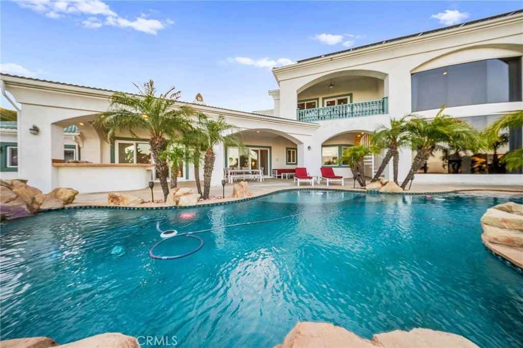 Exquisite Custom Estate with Panoramic Views in Prestigious La Cresta. Discover one of the most extraordinary homes currently available in Murrieta, offering over 6,400 sq ft of refined luxury on more than 5 acres, nestled in the highly coveted La Cresta community. Boasting 4 spacious bedrooms and 4.5 bathrooms, this exceptional property delivers the perfect blend of elegance, comfort, and functionality. Enter through a private, gated driveway to a grand double-door entrance, where you're welcomed by soaring ceilings and a dramatic foyer with rich finishes. The open-concept layout is designed to highlight the sweeping 180-degree views of the Murrieta and Temecula Valleys, visible from nearly every room in the home. Walls of windows and glass doors seamlessly connect the indoor living space to the stunning backyard oasis. Step outside to experience true resort-style living with a sparkling pool and spa, built-in custom BBQ island, and a private guest cabana complete with its own bathroom and shower, ideal for hosting or extended stays. Entertain, relax, and soak in all this property offers. The gourmet chef’s kitchen is a culinary masterpiece, complete with high-end stainless steel appliances, granite countertops, custom cabinetry, a large center island with seating, and walk-in pantry. Entertain with ease in the formal living and dining rooms, breakfast nook, and expansive family room, all showcasing incredible views. A fully-equipped custom bar, complete with sink and mini fridge, anchors the impressive game room featuring a billiards table, shuffleboard, and a temperature-controlled wine cellar. Downstairs includes two private ensuite bedrooms, one is currently utilized as a home office with a separate entrance. Upstairs, two additional ensuite bedrooms with walk-in closets. The luxurious primary suite is a true retreat- enjoy sunrises from your private balcony, unwind in the jetted tub, sauna, or massive walk-in shower, and enjoy the expansive walk-in closet with built-in cabinetry and an adjacent private gym. Additional features include an attached 4-car garage with built-in storage, central vacuum system, water softener, security system with cameras, and a solar power system. Set within one of Murrieta’s most sought-after communities, this property offers tranquility, privacy, and easy access to top-rated schools, shopping, dining, and the renowned Temecula wine country. This one-of-a-kind estate is a rare opportunity-schedule your private tour today!