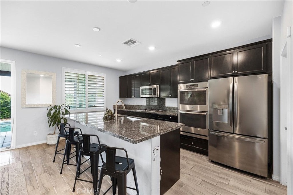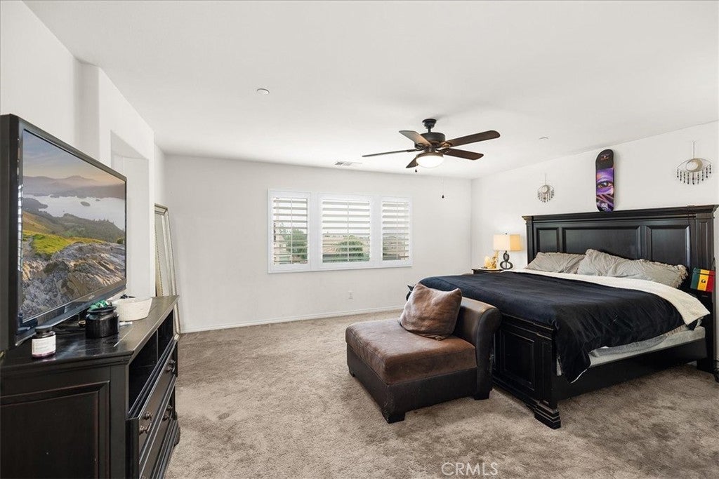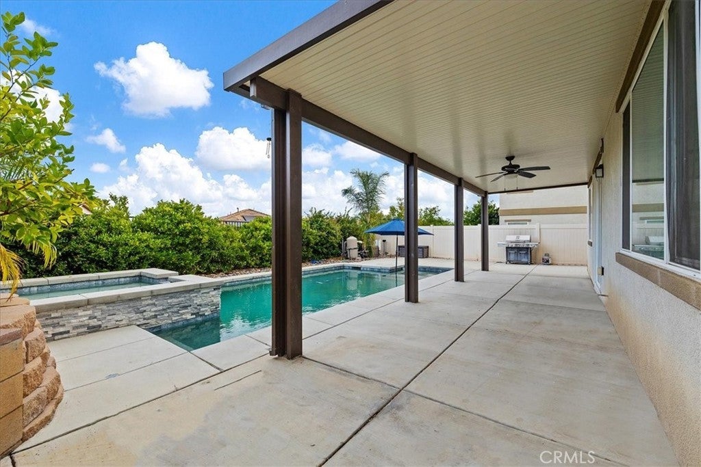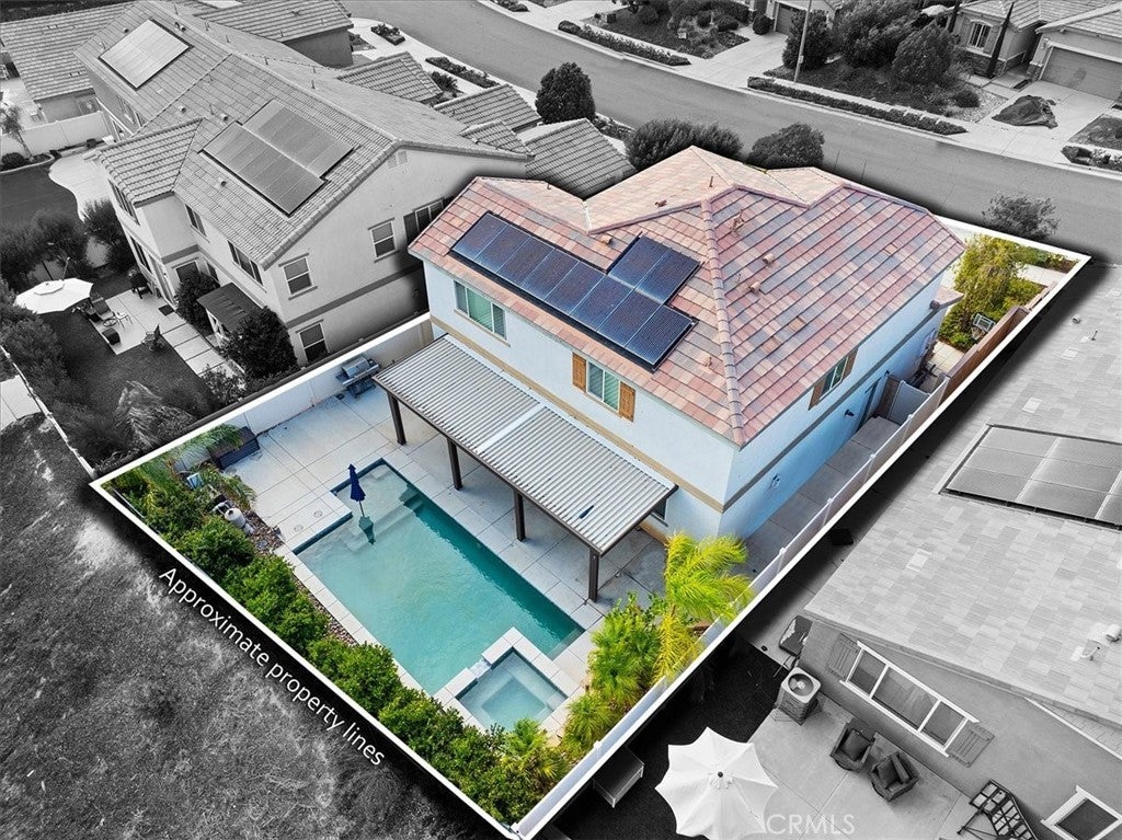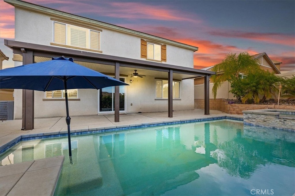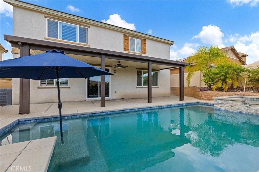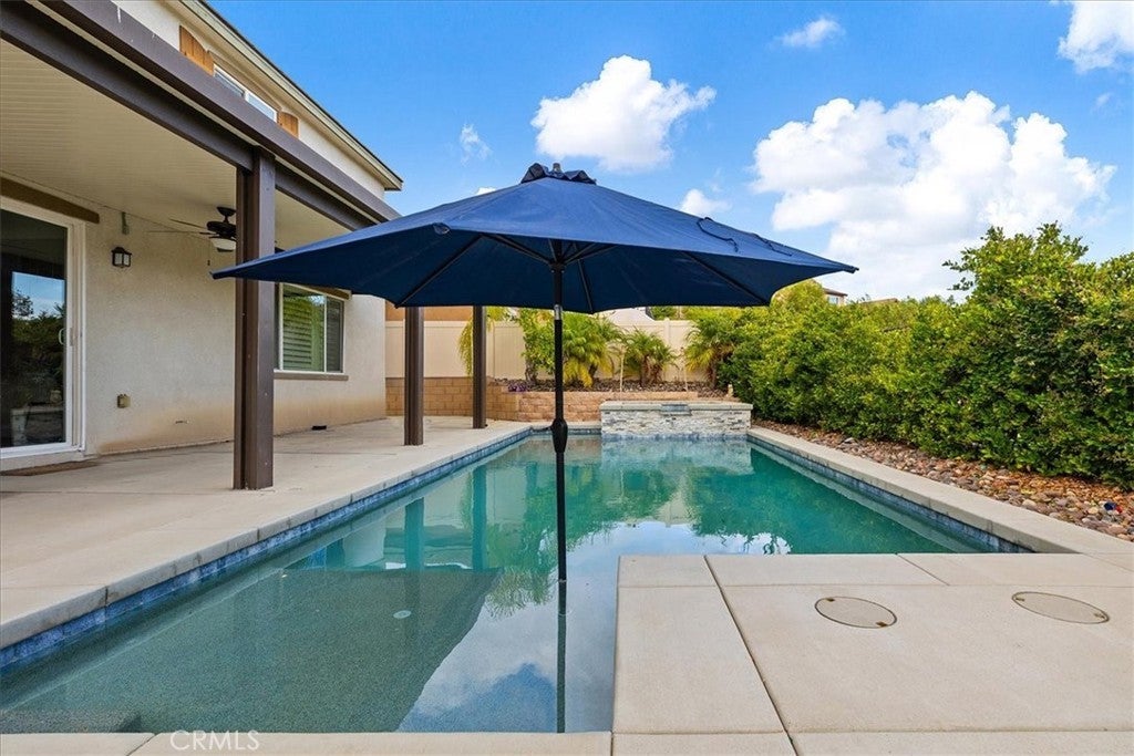 Beautiful Pool & Spa Home in the Heart of Wildomar! Welcome to this stunning two-story, four-bedroom, three-bath home offering 2,389 sq. ft. of comfortable living space. Built in 2015 and ideally located near Inland Valley Hospital, this home combines modern style with everyday functionality. One bedroom and full bathroom are conveniently located downstairs—perfect for guests or multigenerational living. The spacious kitchen is the heart of the home, featuring an extended center island with bar seating, sleek quartz countertops, stainless steel appliances, a double oven, six-burner cooktop, built-in microwave, and an industrial-style stainless steel sink. The open-concept layout flows seamlessly into the family room, where you’ll find built-in shelving, a cozy gas fireplace, and beautiful plantation shutters. Upstairs, the primary suite is a good Size and the Primary Bathroom offers a relaxing retreat with dual sinks, a vanity area, a soaking tub, separate walk-in shower, large walk-in closet, and private water closet. Two additional bedrooms are upstairs with a Full Bathroom with a Tub-in-shower. Also Upstairs is a Private Laundry Room, close to most of the bedrooms and has a large storage closet for linens, towels and supplies. An open loft provides the perfect space for a play area, home office, or media room. Step outside to your private backyard oasis featuring a sparkling pool and spa, Alumawood patio cover with a fan, and plenty of room for entertaining or relaxing year-round. The 2-Car Garage is being used as a gym currently. There is an EV Charger for electric vehicles, a tankless water heater and some of the garage shelving remains. Solar lease to be transferred to the buyer. Conveniently located near shopping, dining, schools, and easy freeway access—this Wildomar gem truly has it all!