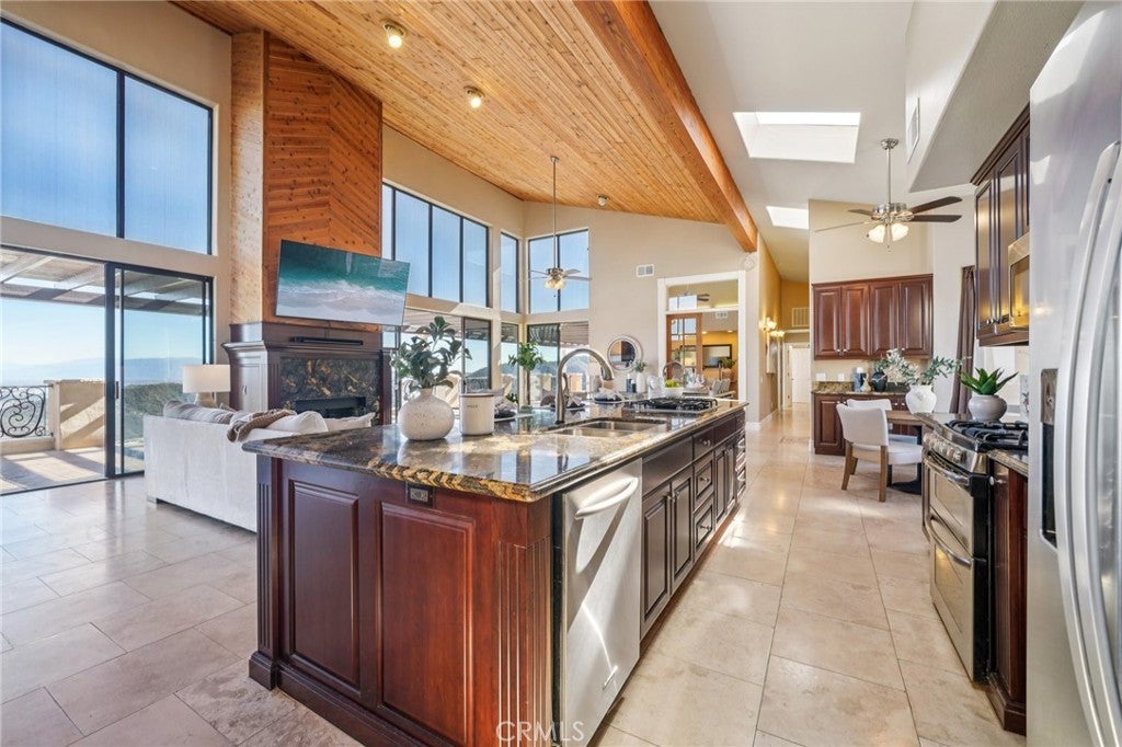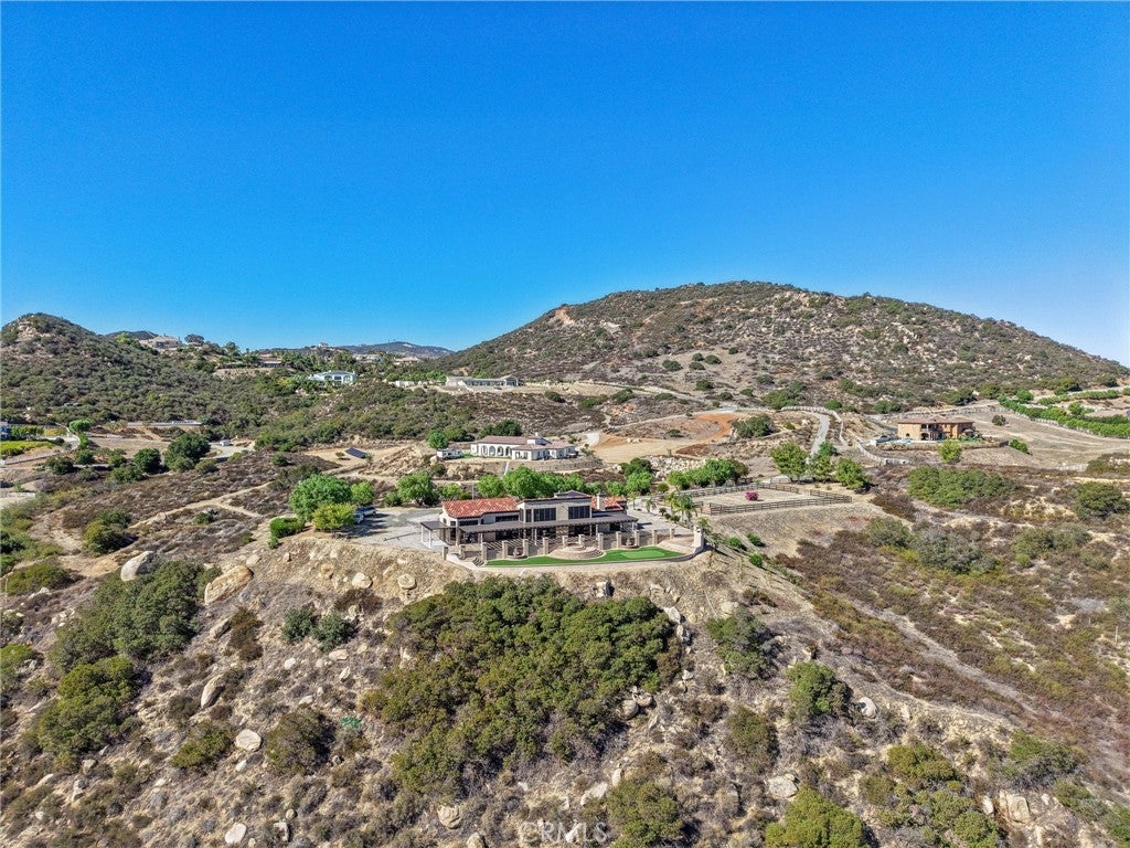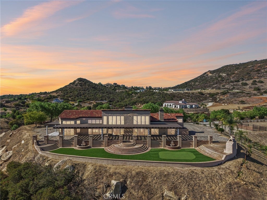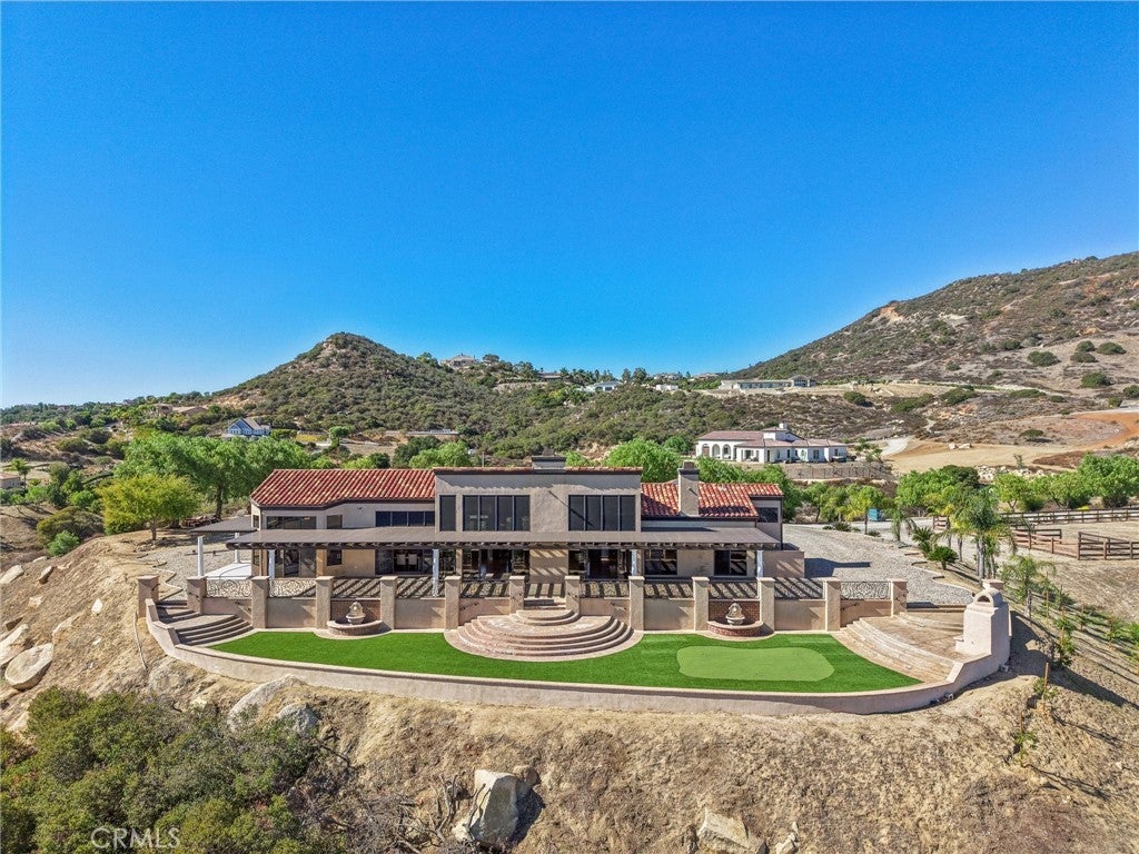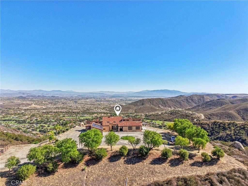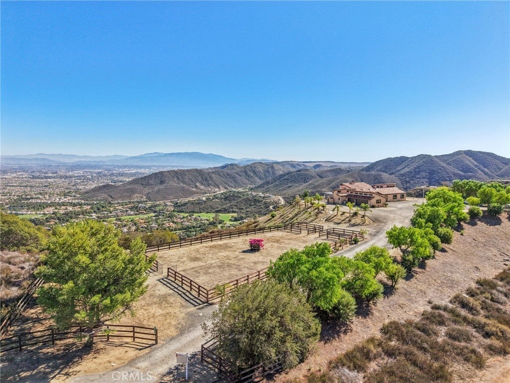 SINGLE-STORY LA CRESTA ESTATE on 10+ private acres with breathtaking panoramic views of the Bear Creek Golf Course, Santa Rosa Plateau, Temecula/Murrieta Valleys, Mount San Jacinto, and sparkling city lights. A private gated driveway sets a grand arrival to this serene, luxury retreat. Enjoy Semper Solaris solar backed up by two Tesla Powerwalls, plus 33 guava trees—including strawberry, white, lemon, and pineapple varieties—with room to expand your orchard or plant a vineyard. The expansive great room boasts dramatic ceilings, picture windows, and seamless indoor–outdoor living. The entertainer’s kitchen showcases an 18-ft granite island, premium appliances, two sinks, two stovetops, two microwaves, and two dishwashers, with elegant custom cabinetry and abundant storage. Flexible layout with 4 bedrooms plus formal dining/office, and potential for a separate-entry suite. The spa-inspired primary bath features a luxurious double walk-in shower. The bedrooms feature upgraded porcelain tile flooring, combining style, comfort, and easy maintenance. Recent upgrades include new skylights, new roof underlayment, exterior re-stucco and paint, replaced capstones on the terraces, new patio with architectural pillars and an Elitewood Ultra heavy-duty cover with Kynar 500 coating, and new outdoor lighting fixtures. Outdoor living spans over 5,000 sq. ft. of terraced space with an outdoor fireplace, putting green and flag area with AstroTurf, and ample parking for guests and vehicles. The property is horse-ready with stalls, arena, and access to extensive horse trails, plus space for a barn, guest house, or other amenities. Additional features include two heating and cooling units for zoned comfort. Luxury, privacy, usable land, and unforgettable views—this rare La Cresta estate combines elegant living with the natural beauty of Southern California.