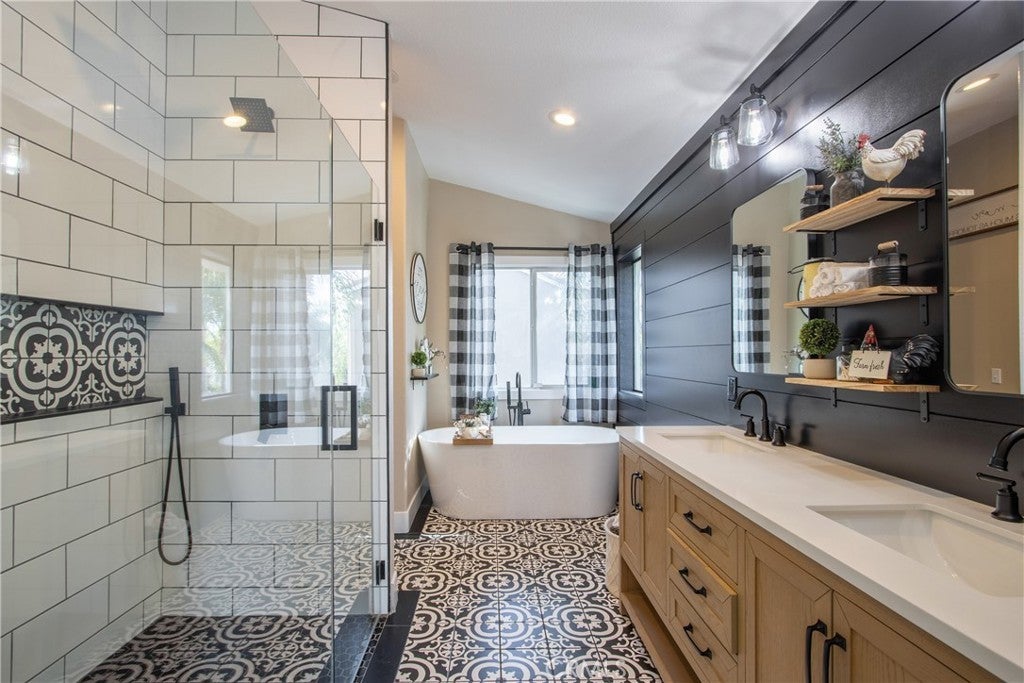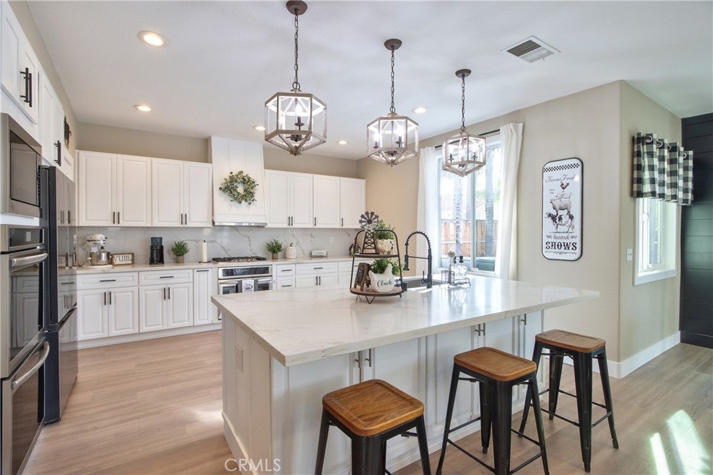 Welcome to your dream home! A completely remodeled, luxuriously designed 5 bedroom, 3 bath residence with a spacious bonus room and custom finishes throughout. Spanning approximately 3,000 square feet, this showpiece is located in one of Murrieta’s most desirable family-friendly neighborhoods, just a very short walk from Monte Vista Elementary School and surrounded by three nearby parks. Perfect for kids and families. Inside, you’ll find high-end finishes and thoughtful craftsmanship at every turn, including LVP+ flooring throughout, extensive custom shiplap walls, wood-framed windows and baseboards, Quartz countertops, and soft-close cabinets and drawers. The Chef’s kitchen is an entertainer’s dream, featuring three ovens, all-new stainless-steel appliances, a large island, and 2 inviting dining areas ideal for large gatherings. The main level offers an open, airy layout with a cozy fireplace, a formal dining area, and a fully upgraded bathroom with a luxurious rainfall shower, alongside a convenient guest bedroom. Upstairs, discover three spacious bedrooms, a beautifully remodeled bathroom, a large bonus room, and a primary suite that feels like a retreat, complete with high-end finishes, a walk-in shower with dual rainfall shower heads, and an expansive walk-in closet. Additional features include solar panels with a backup battery, new ceiling fans, freshly painted interiors, a new stackable washer and dryer (included), and a three-car garage. Step outside to your private backyard with a relaxing above-ground spa and plenty of room for entertaining. This home truly has it all! Designer quality, modern functionality, and an unbeatable location near top-rated schools and parks. A must-see property that defines Murrieta luxury living.