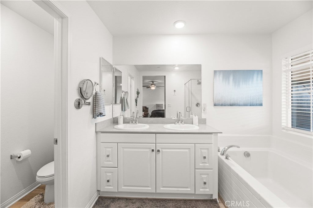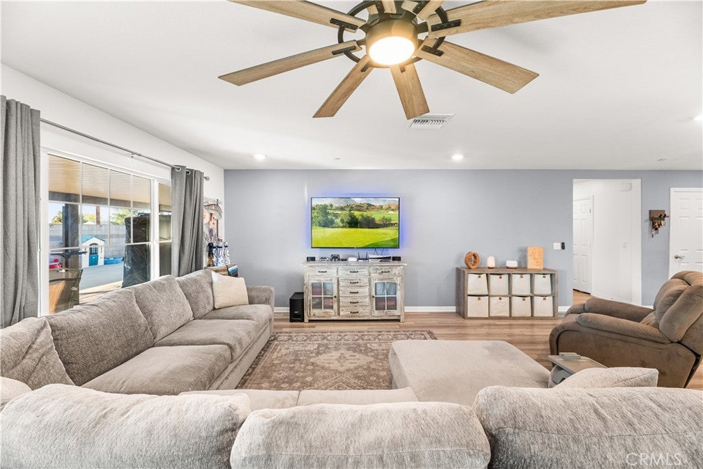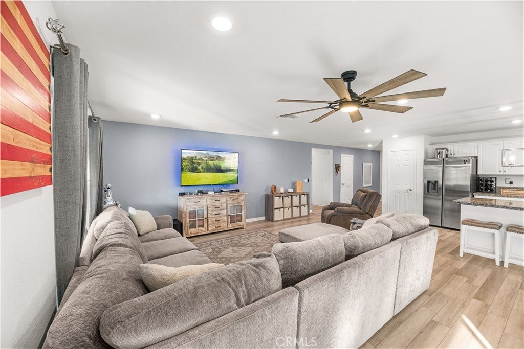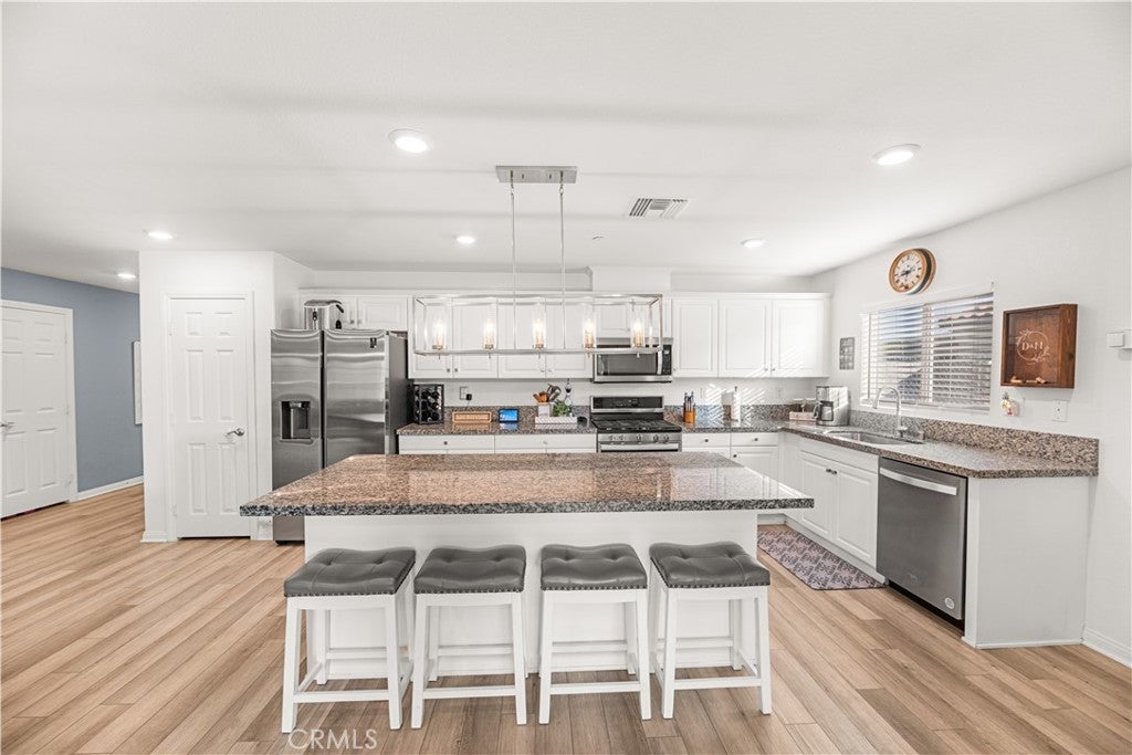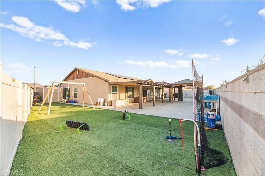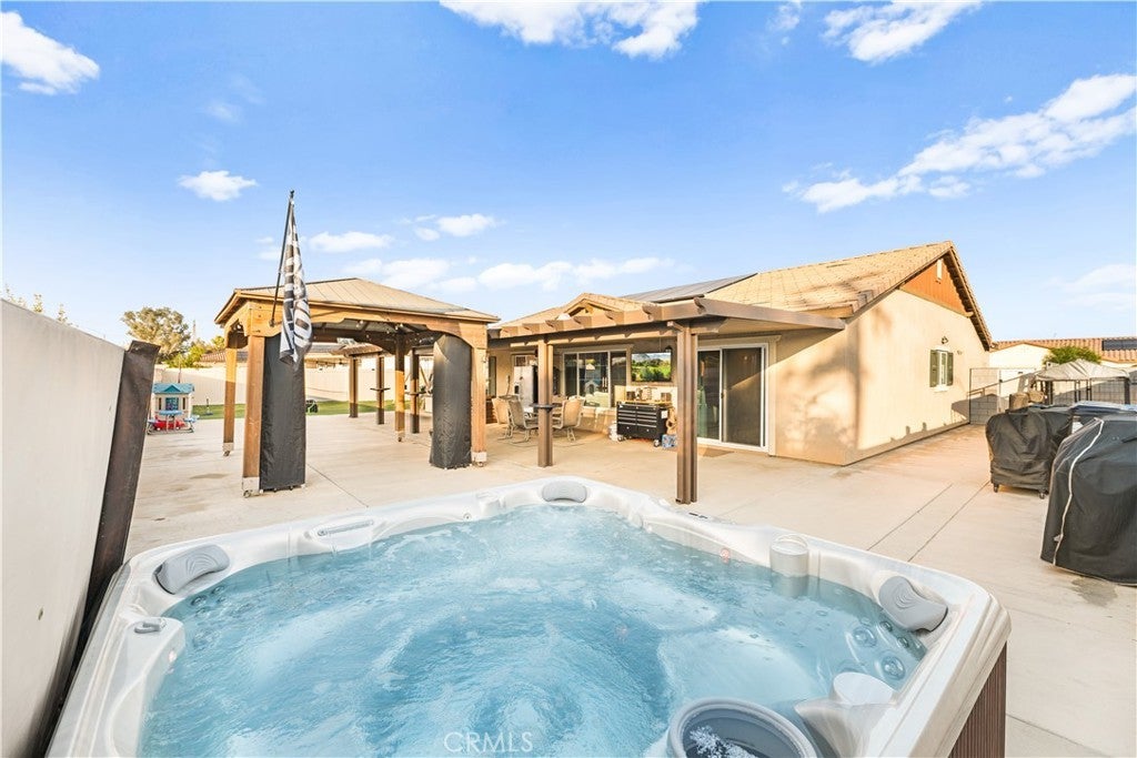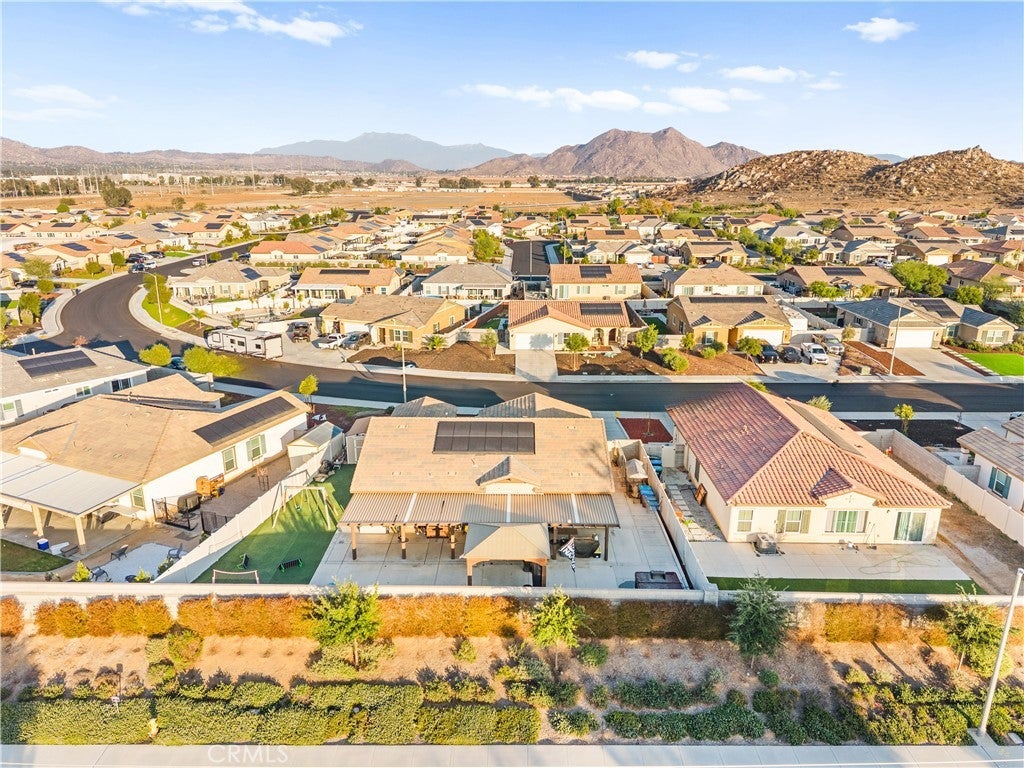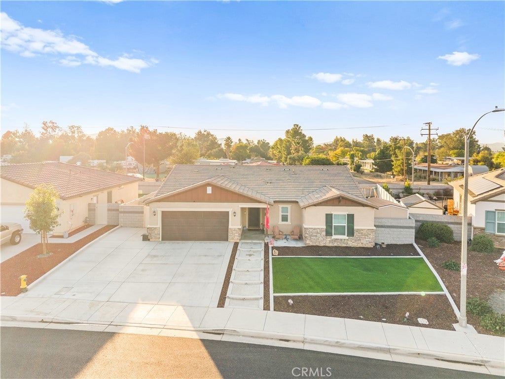 Welcome to this stunning single story solar powered home built in 2021, perfectly located in a quiet Menifee community surrounded by parks, walking trails, and quick freeway access. With modern curb appeal and an open-concept layout, this home offers the best of comfort and efficiency. Inside, enjoy a bright and spacious great room that flows seamlessly into a designer kitchen featuring white shaker cabinets, quartz countertops, stainless-steel appliances, and a large center island. The primary suite is a relaxing retreat with dual sinks, quartz vanity, walk-in shower, and generous closet space. Three additional bedrooms provide flexibility for family, guests, or a home office. Step outside to a low-maintenance backyard complete with artificial turf, a large covered patio, concrete entertaining area, and spa—perfect for gatherings or quiet evenings under the stars.
