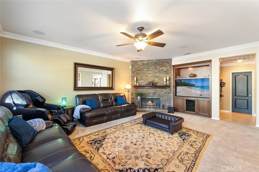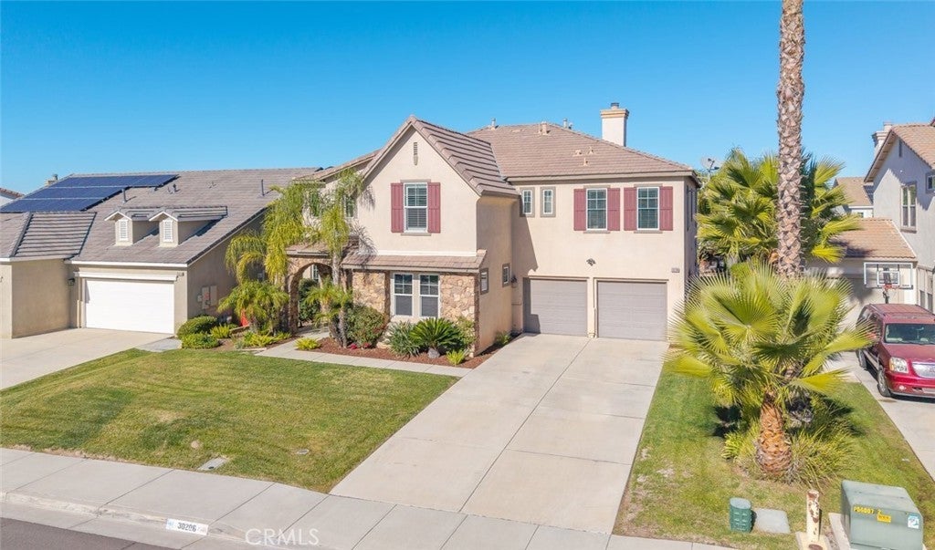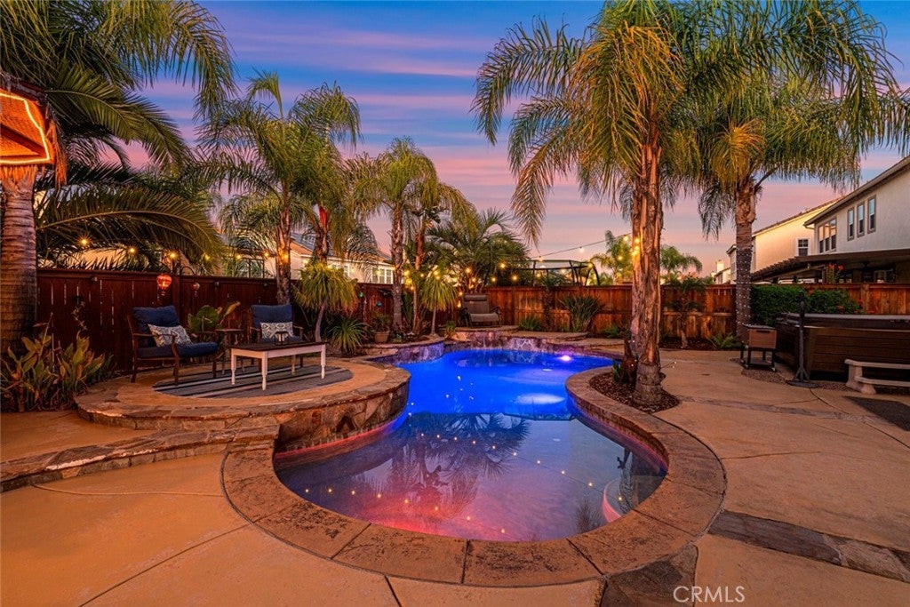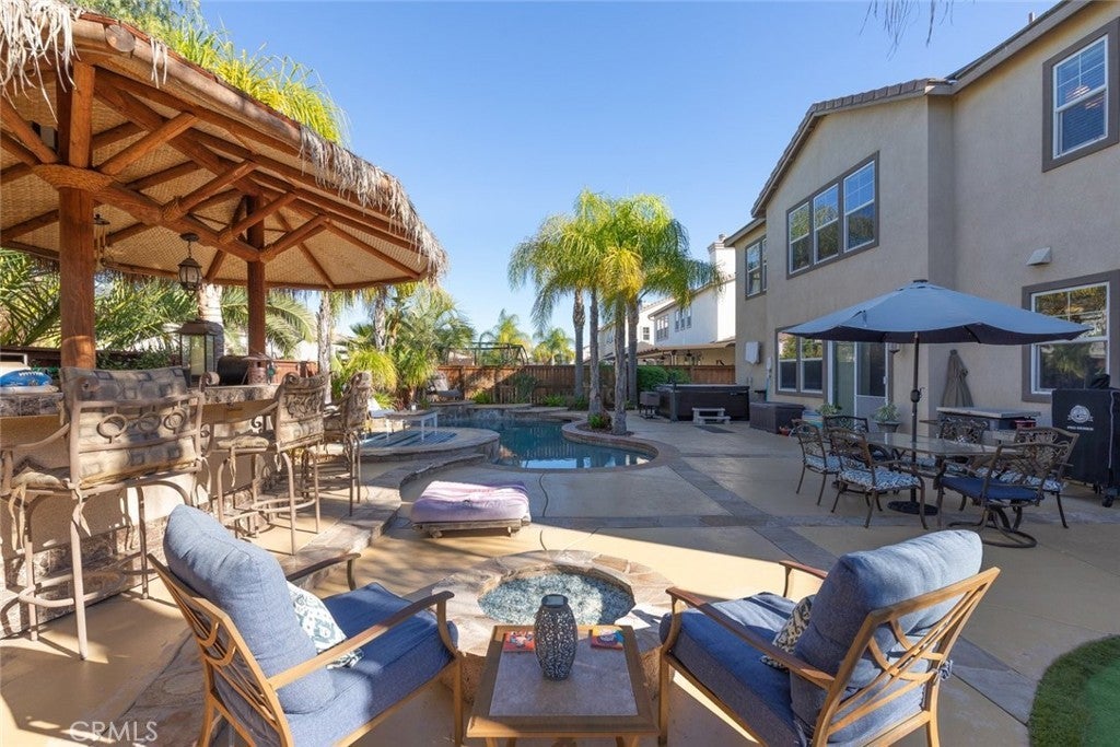 Don’t miss the opportunity to tour this exceptional 5-bedroom, 3.5-bath Murrieta Saltwater POOL HOME, offering true resort-style living with thermal solar to heat the pool for free, a soothing above-ground therapeutic spa, and a backyard oasis with fire pit and putting green that feels like a private getaway. This rare outdoor retreat includes beautifully designed custom landscaping, a tropical palapa, and a full BBQ island with bar seating, creating the perfect setting for gatherings, celebrations, or simply unwinding at the end of the day. From the moment you enter, the home impresses with soaring vaulted ceilings, fresh interior paint, abundant natural light, and an open, flowing layout that blends sophistication with everyday comfort. High-end touches are found throughout, including hardwood flooring, elegant crown molding, ceiling fans in every room, and plantation shutters that add both style and energy efficiency. The formal dining area sits conveniently off the kitchen and features a pass-through opening to the living room—ideal for hosting and maintaining a connected atmosphere between spaces. The expansive family room/great room is warm and inviting, highlighted by a custom flagstone fireplace, built-in entertainment center, and generous space for relaxing or entertaining. The chef’s kitchen has everything you need: granite countertops, stainless steel appliances, double ovens, custom tile backsplash, tile flooring, and an abundance of cabinetry for storage. A downstairs bedroom with a closet and its own flex/exercise space adds versatility, perfect for guests, a home office, gym, or multigenerational living. Upstairs, the luxurious primary suite features dual walk-in closets, dual vanities, and a serene soaker tub designed for unwinding. A highly desirable ensuite secondary bedroom provides privacy and convenience with its own full bathroom. Two additional upstairs bedrooms are generous in size and share a well-appointed hallway bath. The open loft offers endless possibilities—library, theater room, game area, reading nook, or additional living space to fit your lifestyle. Located close to shopping, restaurants, businesses, hiking, entertainment, the 15 and 215 freeways, and award-winning Murrieta schools, this home checks every box. With its stunning backyard, thoughtful upgrades, and beautifully maintained interior, thermal solar and solar for energy efficiency this home is the one you’ve been waiting for....schedule your showing today!