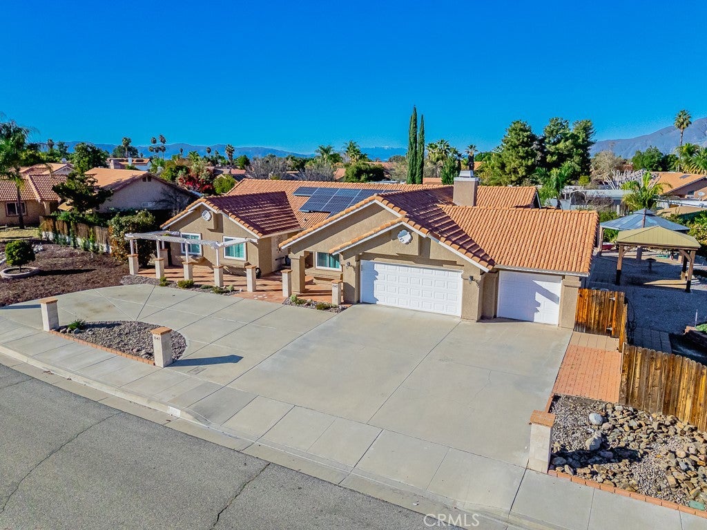 Welcome home! This beautifully upgraded single-story residence features 4 bedrooms and 3 bathrooms, offering comfort, style, and an open layout from the moment you walk in. The interior showcases elegant travertine flooring and numerous custom touches throughout. The spacious living room is perfect for entertaining, while the separate family room—complete with a cozy fireplace—opens to the kitchen. The kitchen boasts upgraded travertine countertops and an island that offer plenty of workspace for cooking and gathering. The primary suite offers a spacious and private retreat, featuring a well-appointed bathroom with dual sinks, a new walk-in shower, and a walk-in closet, along with a sliding glass door leading to the backyard—perfect for quiet evenings under the stars. The home also features three additional bedrooms and two extra bathrooms, offering flexible space ideal for family living, guests, or a home office. Outside, the home sits on an oversized lot of more than 19,000 sq ft. A 3-car garage, RV parking, and ample space for additional vehicles or recreational toys make this property truly unique. The circular driveway provides easy access for guests. The backyard offers close to half an acre of privacy, including Gardeners dream with garden beds ready for your personal plantings. Enjoy two gazebos—one ideal for relaxing and the other perfect for hosting family BBQs. The exterior stucco has been enhanced with a high-quality protective coating for long-lasting durability. This home is the perfect blend of comfort, upgrades, and expansive outdoor living! Hurry and bring your buyers... they won't be disappointed.