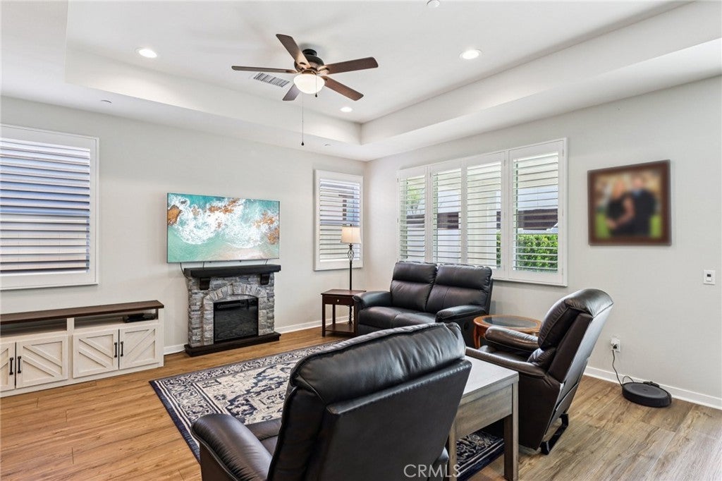 ESPLANADE 55+, LUXURY, OWNED SOLAR, PRIVATE, GATED COMMUNITY, TURNKEY, UPGRADED. Experience elevated 55+ living in this beautifully upgraded Arise Plan 2, combining modern design, energy efficiency, and resort-style comfort. The home offers 3 bedrooms, 2.5 baths, and an open-concept layout with sound-proof Pecan luxury vinyl plank flooring and plantation shutters throughout. The chef’s kitchen showcases a large quartz island, premium stainless appliances, and abundant storage - ideal for entertaining or casual gatherings that flow seamlessly into the great room and outdoor spaces.The primary suite delivers a tranquil retreat with an oversized walk-in shower, dual vanities, and an expansive walk-in closet. Through the sliding glass doors, step into a stunning backyard oasis with a California room, built-in gas fireplace, recessed lighting, and low-maintenance, pet-resistant turf. The outdoor space is enhanced by a custom retaining wall, terraced landscaping, mature hedges, a sun deck, and custom pavers wrapping both sides of the home - creating a truly serene and private retreat. A storage shed adds functionality without sacrificing style. Residents of Esplanade Sommers Bend enjoy exclusive resort amenities including a pool and spa, pickleball and bocce courts, outdoor kitchen and BBQ areas, fire pit, gardens, and a private clubhouse with fitness center, billiards, and indoor lounges with kitchen facilities - all just minutes from Temecula Wine Country and local shopping.