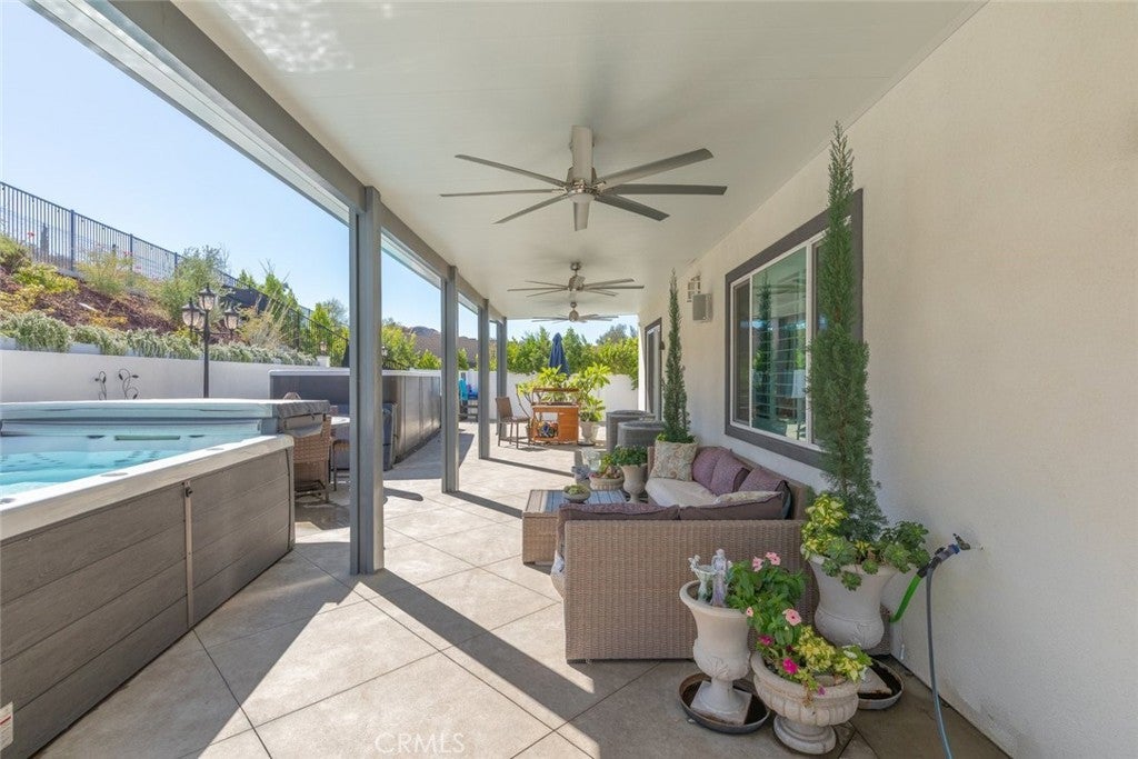 Welcome to this extraordinary Menifee estate, privately nestled at the end of a cul-de-sac with no rear neighbors and stunning hillside views. Showcasing beautiful designer upgrades, this one-of-a-kind property features a spacious 4,134 sq. ft. layout on a beautifully landscaped 10,000+ sq. ft. lot — complete with a fully equipped attached ADU offering a private entrance. Perfect for multigenerational living, older children or generating rental income. This ADU has everything...bedroom, bathroom, office attached to bedroom, living room, laundry room, kitchen with quartz counters, stainless steel appliances, gorgoues backsplash, lots of storage, plantation shutters and its own dining area. Going into the main home you are met with custom finishes that are not found in most homes of this caliber...even the front screen door is unbreakable for added security. This home boasting quartz countertops, a large island with bar seating, a five-burner built-in gas cooktop, double oven, a walk-in pantry, and stylish light fixtures. The open-concept design flows seamlessly into the expansive great room, ideal for entertaining or relaxed everyday living. Upstairs, the generous primary suite provides a huge serene retreat with ample space to unwind and personalize. Each additional bedroom offers comfort and style, while the home’s thoughtful layout ensures privacy and functionality for every member of the household. Step outside to your private resort-style oasis. The backyard is professionally designed with custom hardscape, landscaping, decorative retaining walls, smart irrigation, and elegant outdoor lighting. Enjoy the covered patio with large and beautiful ceiling fans, a large Cal Spa jacuzzi, and a separate Cal Spa hydrotherapy lap and excercise pool — the perfect setting for year-round relaxation and gatherings. Take the stairs up in the back yard for incredible views as you sit out at night and enjoy those star filled evenings. Energy efficiency abounds with an owned solar system and a leased 11.46 KW solar system and three backup battery packs, offering peace of mind and reduced utility costs. Centrally located near all necessary shopping and dining, and just a short drive to Temecula Wine Country, Old Town Temecula, and Old Town Murrieta — this premium dual-unit estate offers the perfect balance of luxury, convenience, and lifestyle. Close to award winning schools and 15/215 freeways. Schedule your showing today!