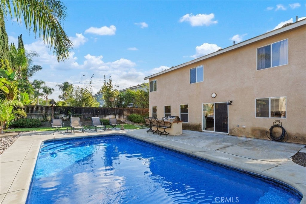 Located in the Mission Grove neighborhood, this 4-bedroom, 2.5-bath home offers 2,344 sq. ft. of functional living space. The layout includes a formal living room, a formal dining room, and a family room with a ceiling fan and carpeting throughout. The kitchen features a large center island, stainless steel appliances, and tile flooring, providing ample space for daily use and entertaining. Upstairs includes three secondary bedrooms and a primary bedroom with an ensuite bathroom and a whole-house fan for added comfort. The backyard includes tropical landscaping, a sprinkler system, an outdoor island BBQ with bar seating, and a new vinyl pool liner scheduled for installation. A storage shed offers additional storage. The property is conveniently located near shopping and dining at Mission Grove Plaza and Mission Village, with easy access to the 91, 215, and 60 freeways.